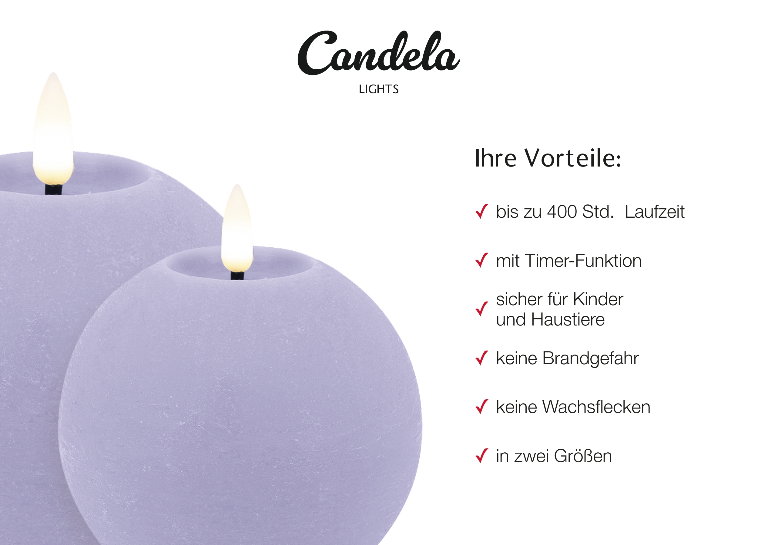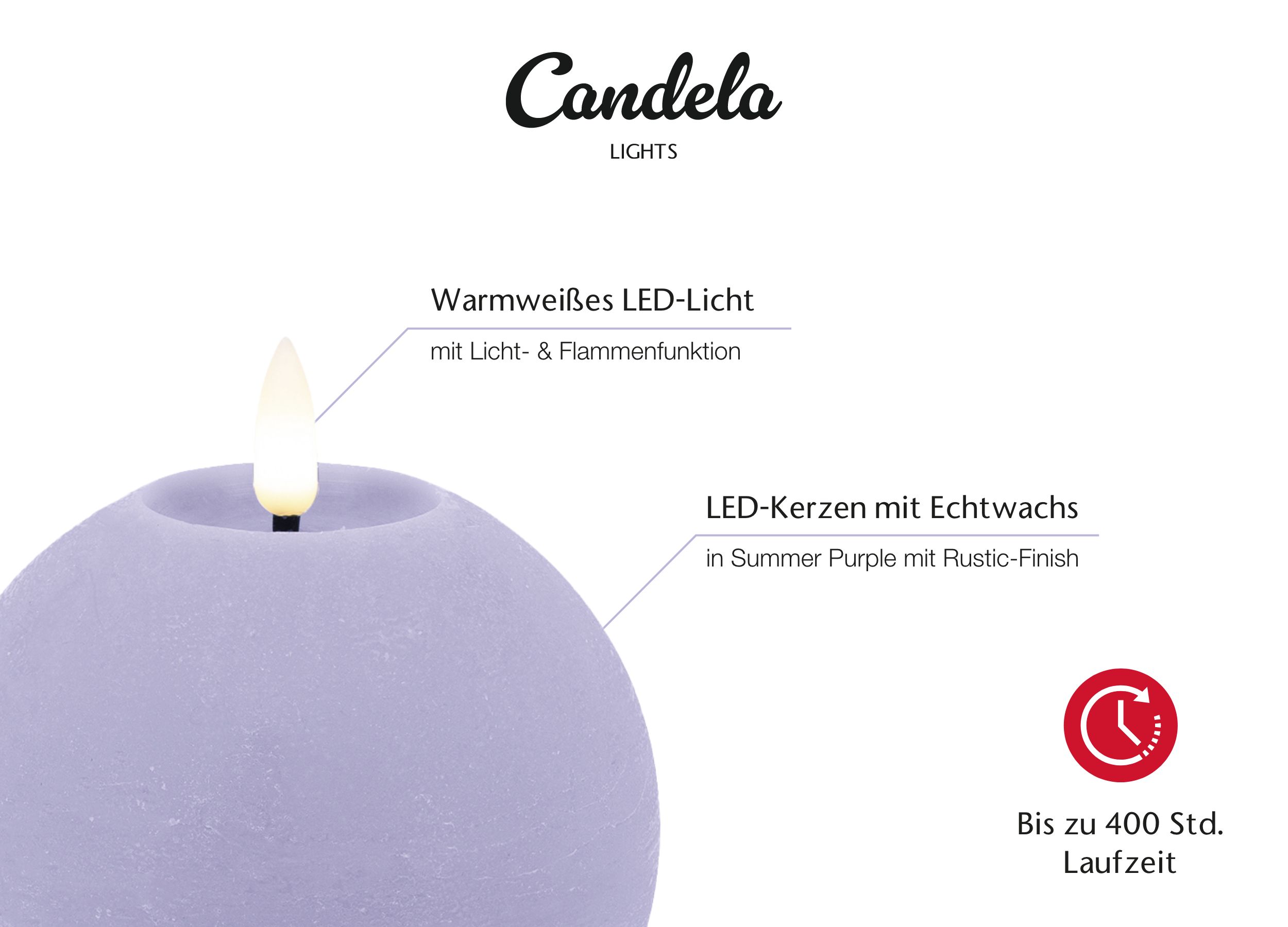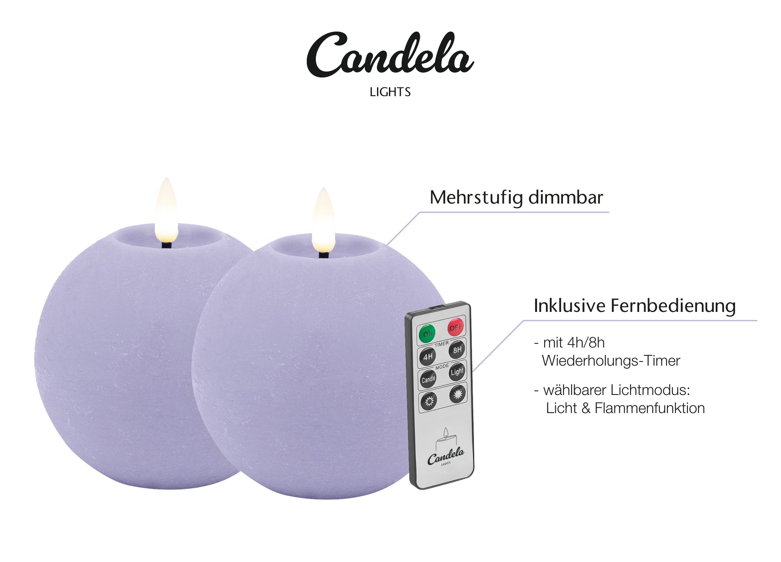 Candela Lights LED Kerzen 4er Set Ø8x7cm Summer Purple rustic Kugelkerze Echtwachs mit Fernbedienung & Timerfunktion Flammenlose flackernde LED-Kerze mehrstufig dimmbar