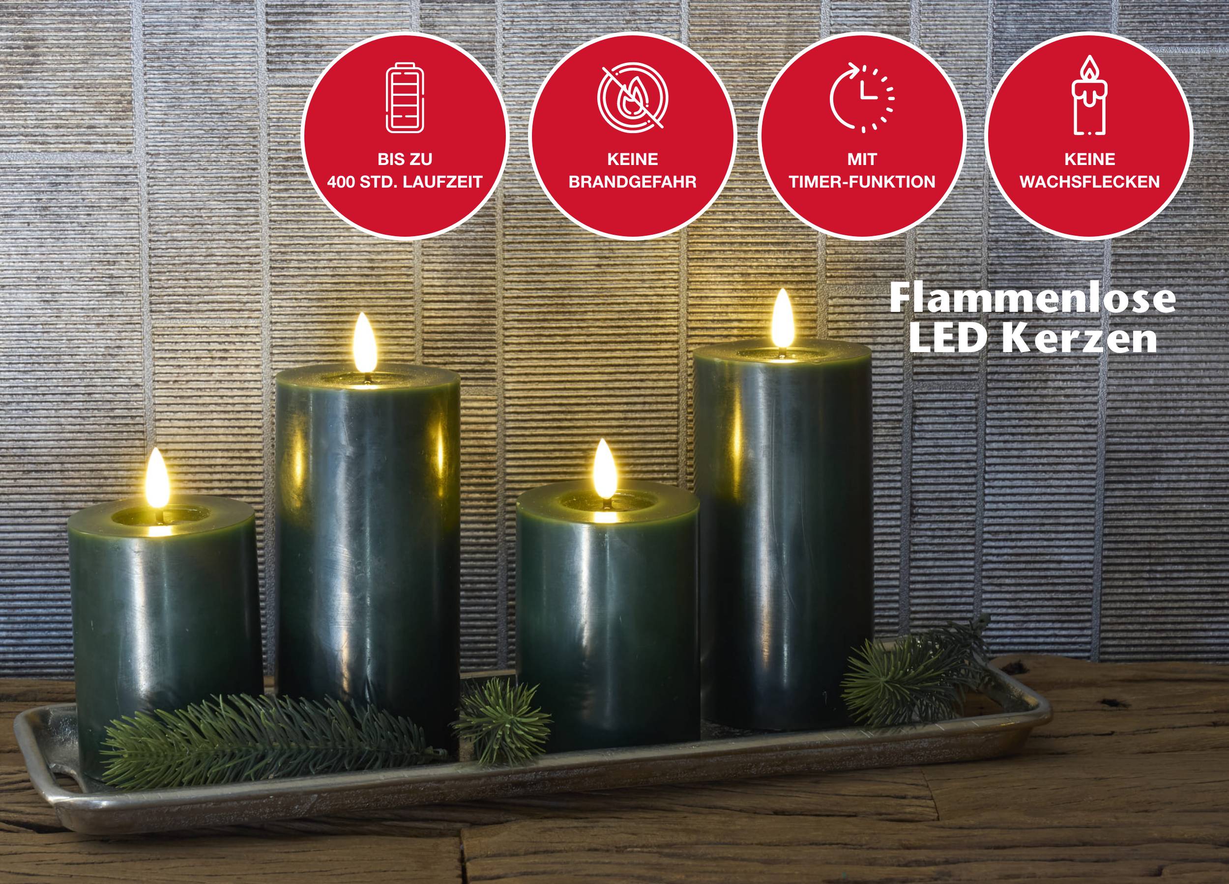 Dank des in sorgfältiger Handarbeit gearbeiteten Echtwachsmantels, ist jede LED-Kerze ein Unikat, welches Ihre Räume auf besondere Weise beleuchten wird. Die Kombination von moderner LED-Technologie und handgefertigtem Echtwachs schafft eine warme und einladende Atmosphäre, ohne dabei auf die Sicherheit und Bequemlichkeit einer LED-Beleuchtung zu verzichten. Diese LED Kerzen wirken so realistisch, sie sind praktisch fast nicht von normal brennenden Kerzen zu unterscheiden.