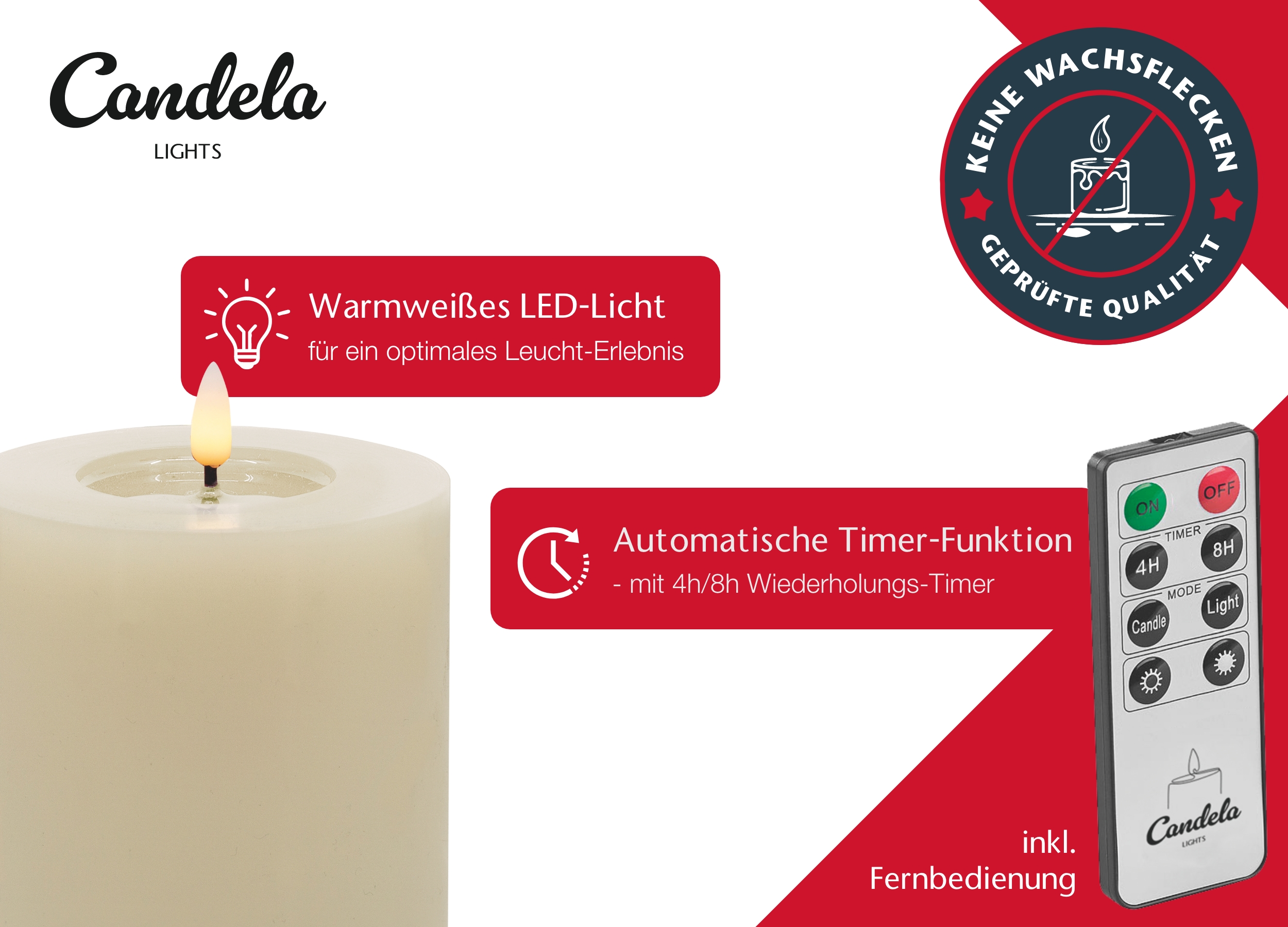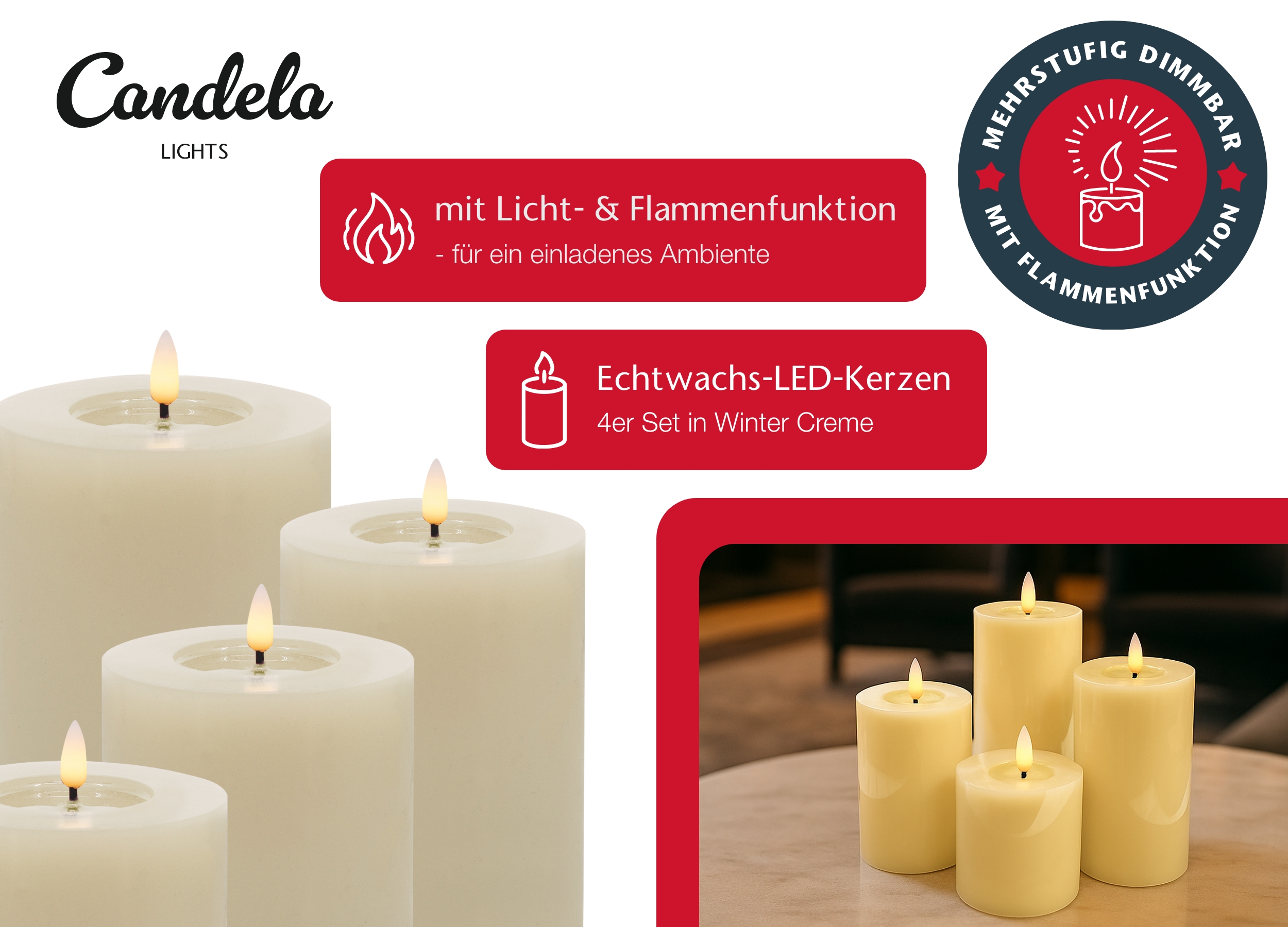 Candela Lights LED Kerzen 4er Set Winter Cream glatt Echtwachs inkl. Fernbedienung & Batterien Timer Funktion & mehrstufig dimmbar flammenlos Echtwachskerzen Stumpenkerzen