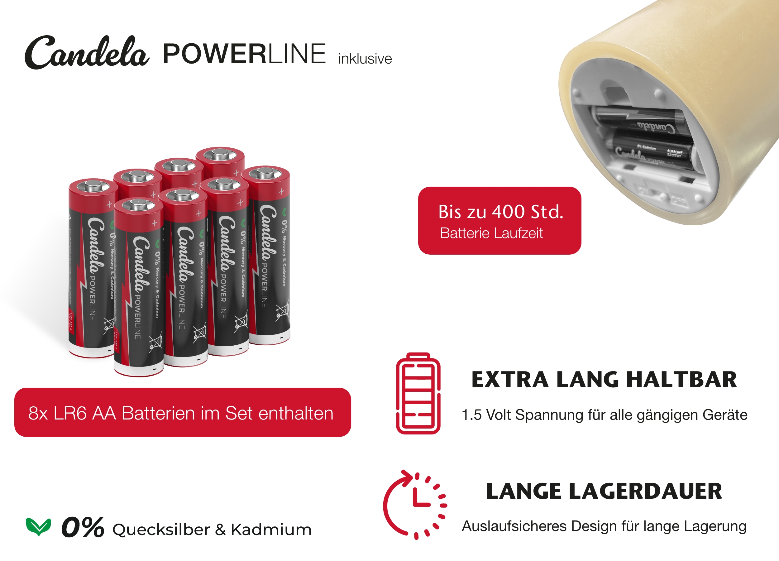 Sie benötigen für den Betrieb pro Kerze 2xAA Batterien. Bitte beachten Sie unsere Batterie-, Entsorgungs- sowie Elektrohinweise für die Produkte von LC Home.