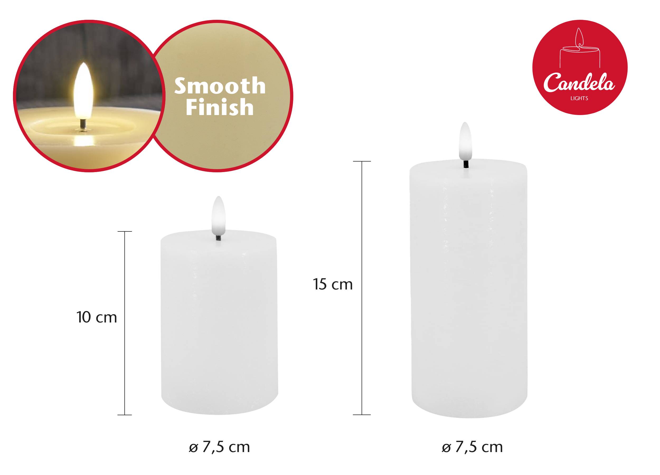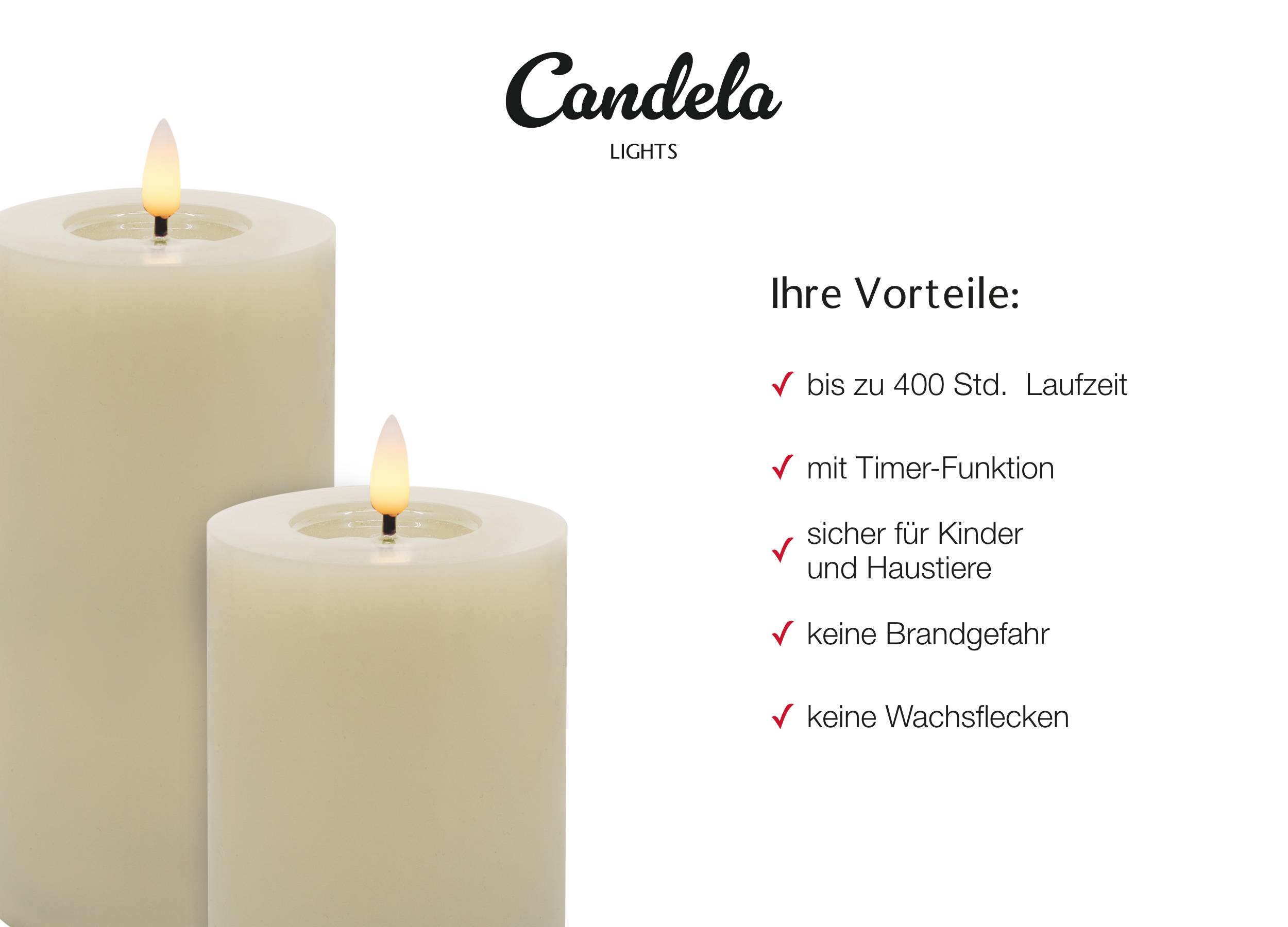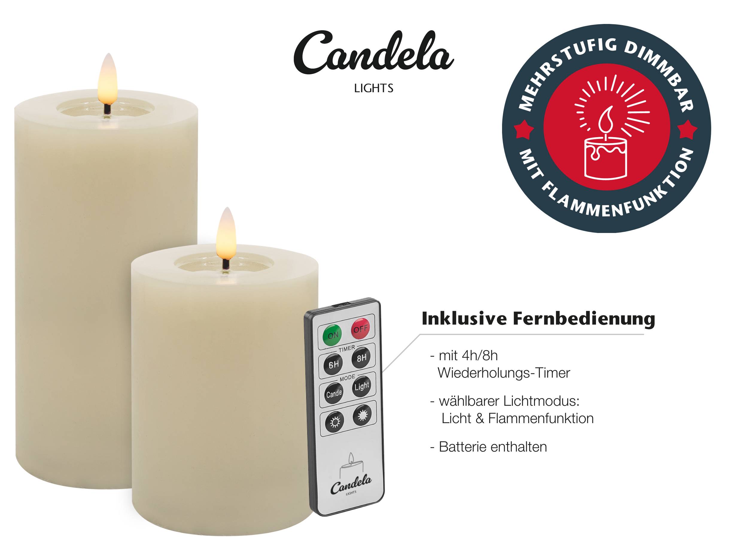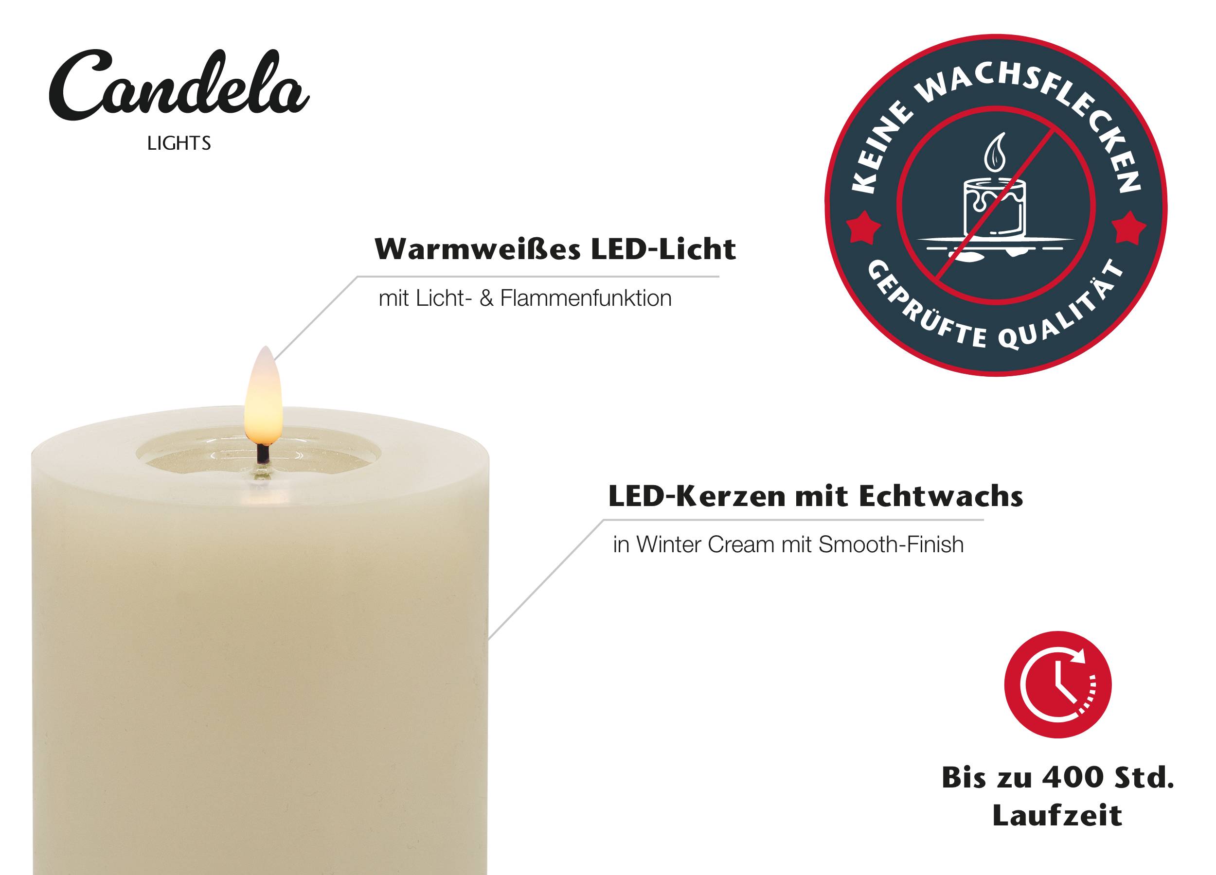 Candela Lights LED Kerzen 4er Set Winter cream glatt Echtwachs inklusive Fernbedienung und 8 Batterien Timer Funktion & mehrstufig dimmbar flammenlos Echtwachskerzen Stumpenkerzen