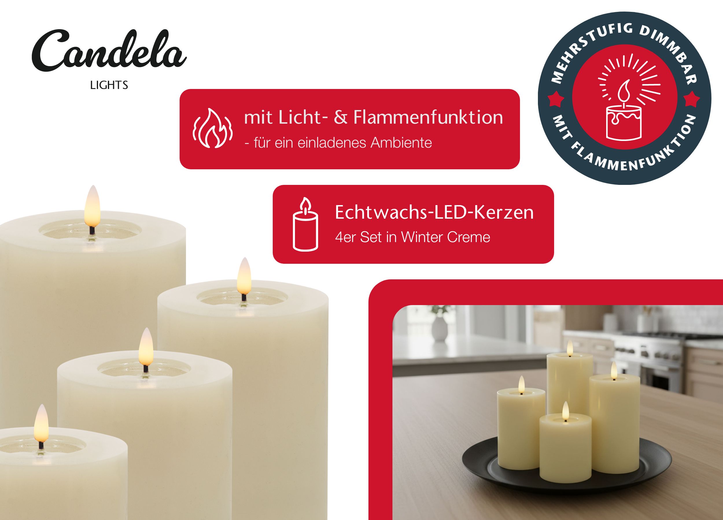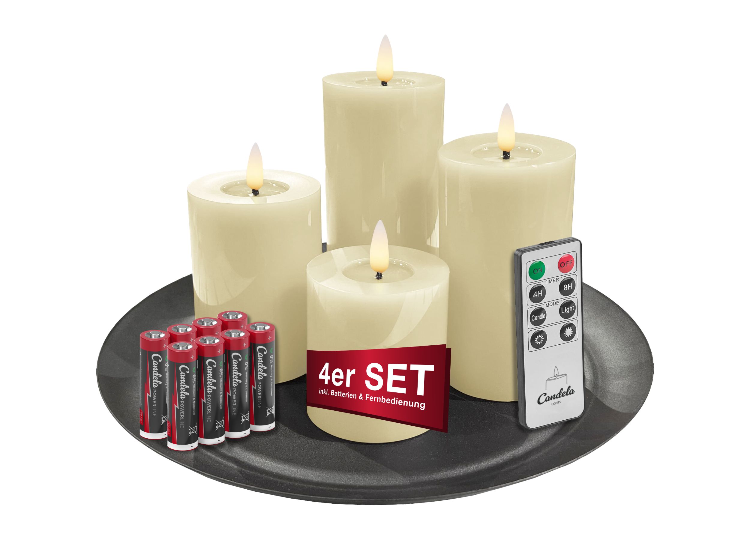 Candela Lights LED Kerzen 4er Set Winter Kollektion Echtwachs Stumpenkerzen cream inkl. Fernbedienung, Dekoteller & Batterien, Timer & dimmbar