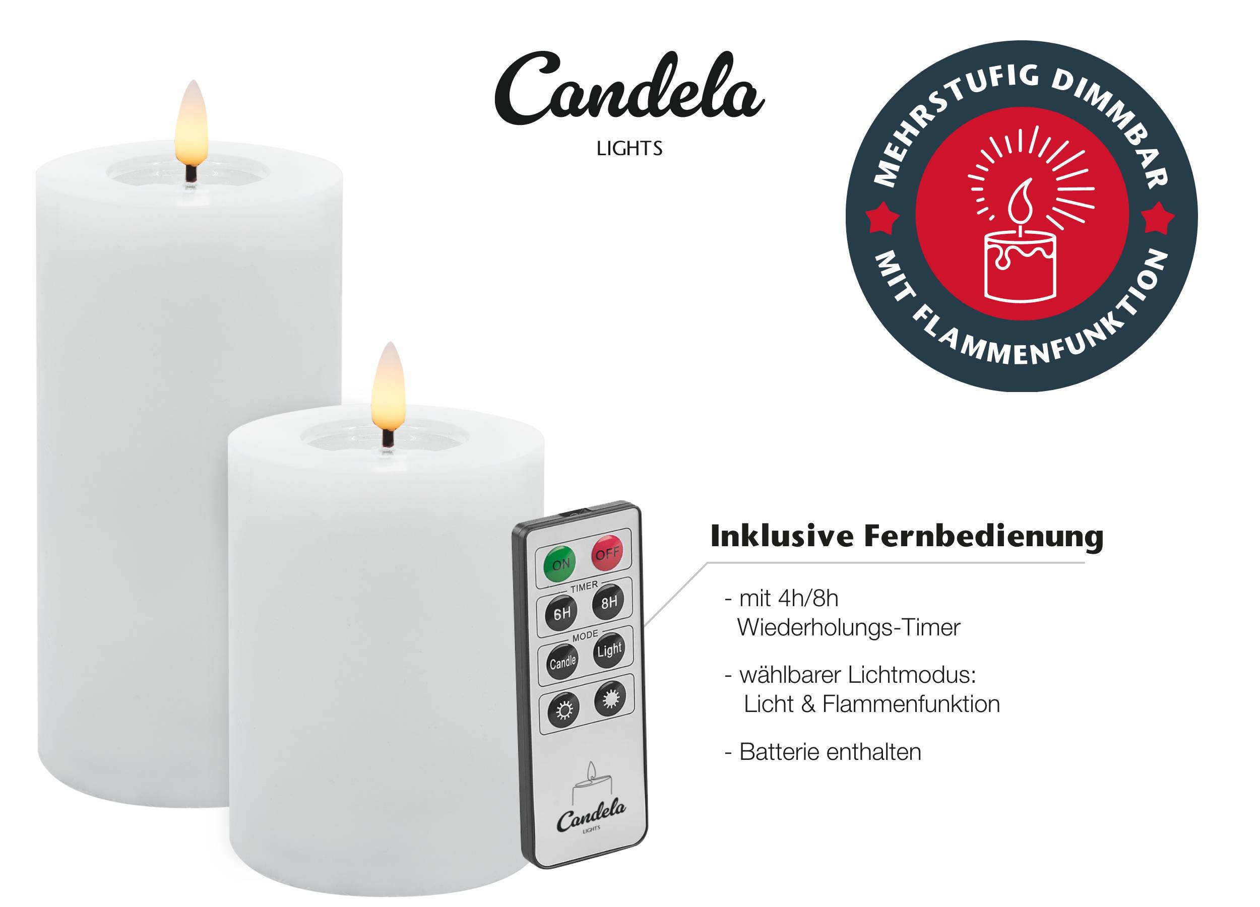 Candela Lights by LC Home sind hochwertige und handgefertigte Echtwachs LED Kerzen, die vor allem durch Ihre Qualität und Funktionalität zu beeindrucken wissen. Diese Echtwachskerzen mit LED Licht sind eine innovative und sichere Alternative zu herkömmlichen Wachskerzen und wirken so realistisch, dass die praktisch nicht von normal brennenden Kerzen zu unterscheiden sind.