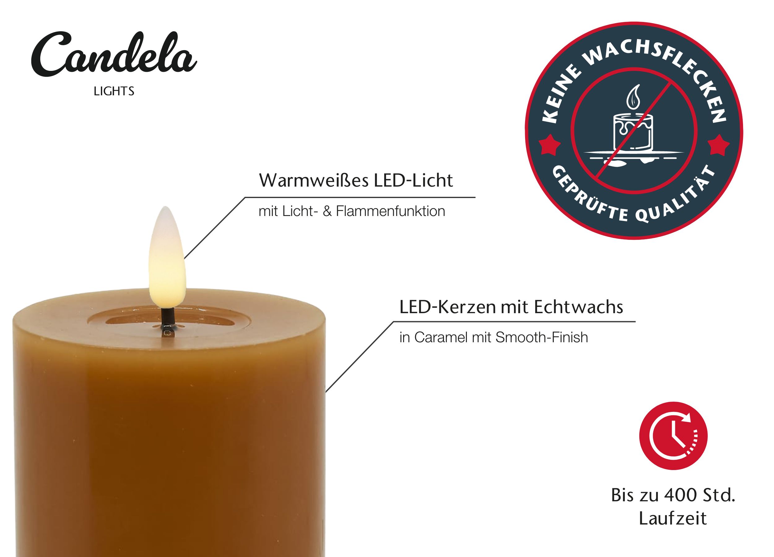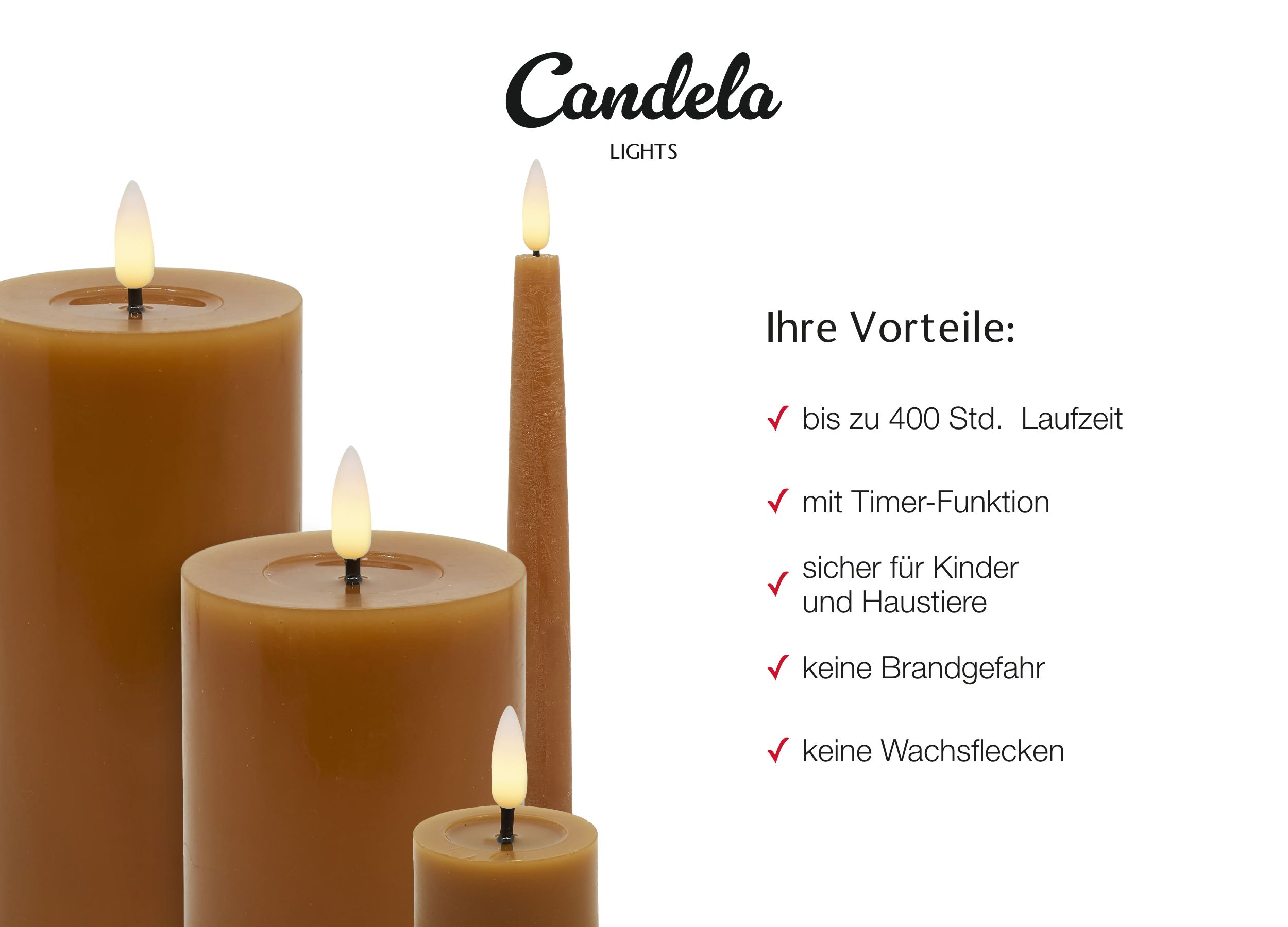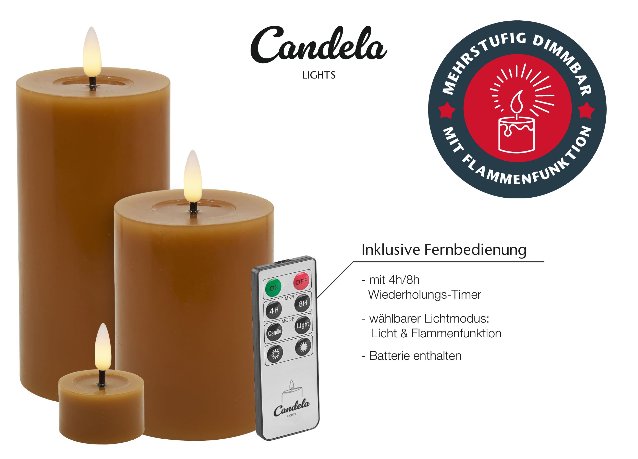 Candela Lights LED Kerzen 8er Set Winter caramel glatt Echtwachs inklusive Fernbedienung und Batterien Timer Funktion & mehrstufig dimmbar flammenlos Echtwachskerzen Stumpenkerzen