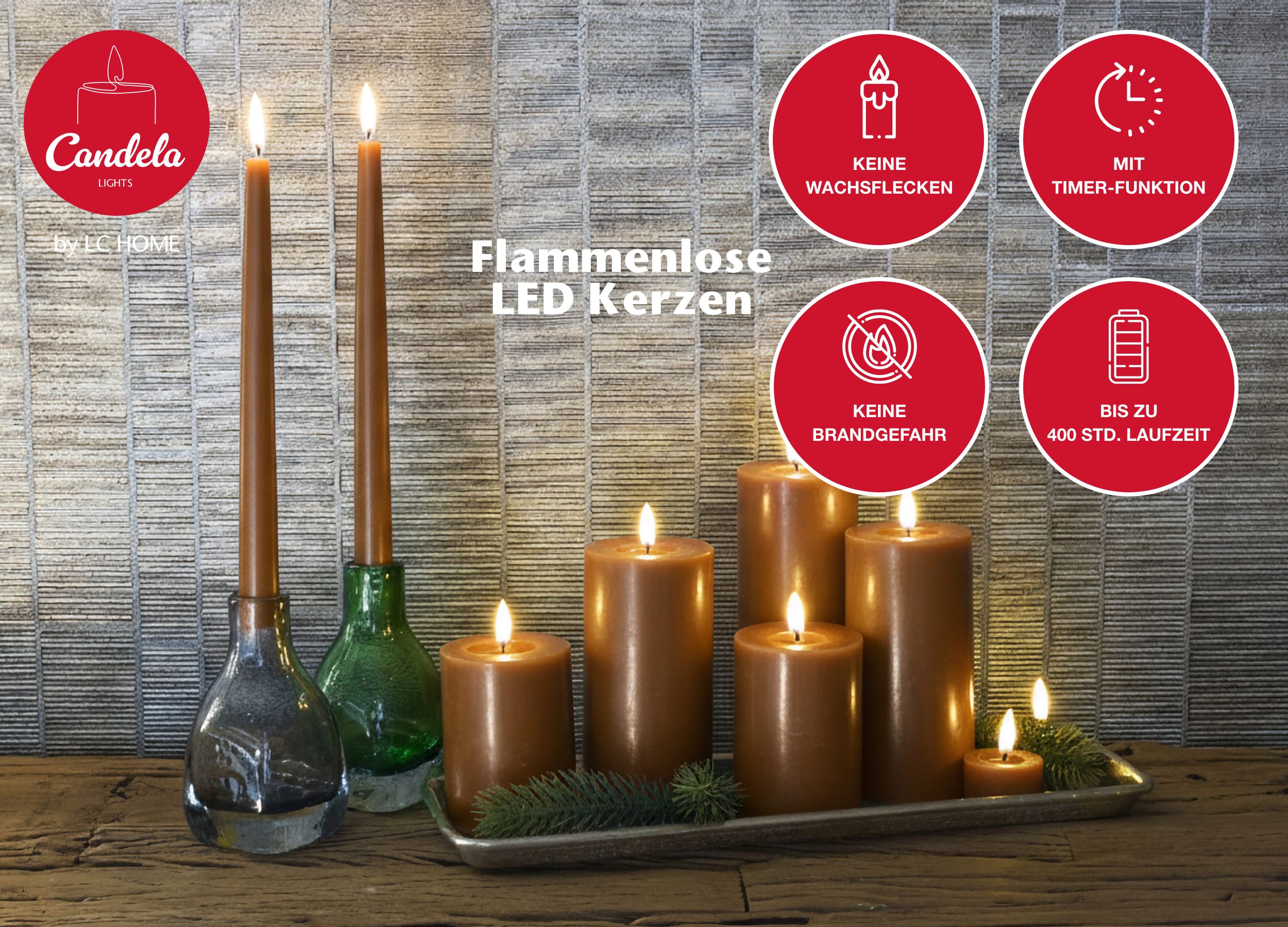Candela Lights by LC Home sind hochwertige und handgefertigte Echtwachs LED Kerzen, die vor allem durch Ihre Qualität und Funktionalität zu beeindrucken wissen. Diese Echtwachskerzen mit LED Licht sind eine innovative und sichere Alternative zu herkömmlichen Wachskerzen und wirken so realistisch, dass die praktisch nicht von normal brennenden Kerzen zu unterscheiden sind.