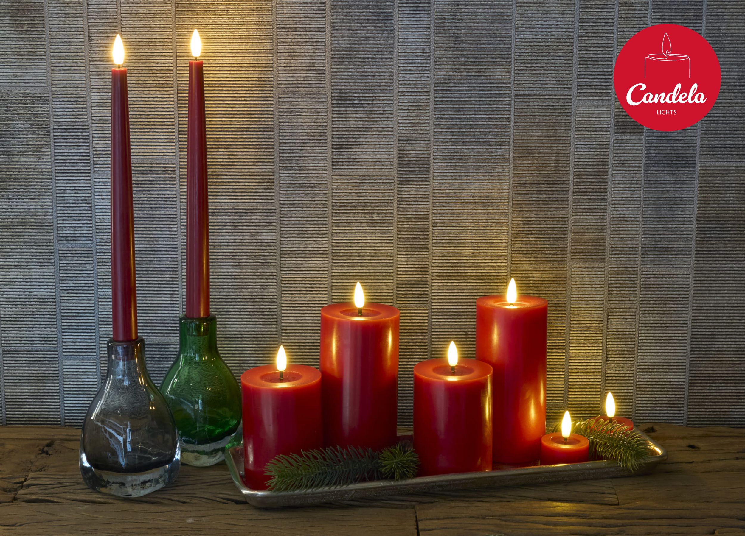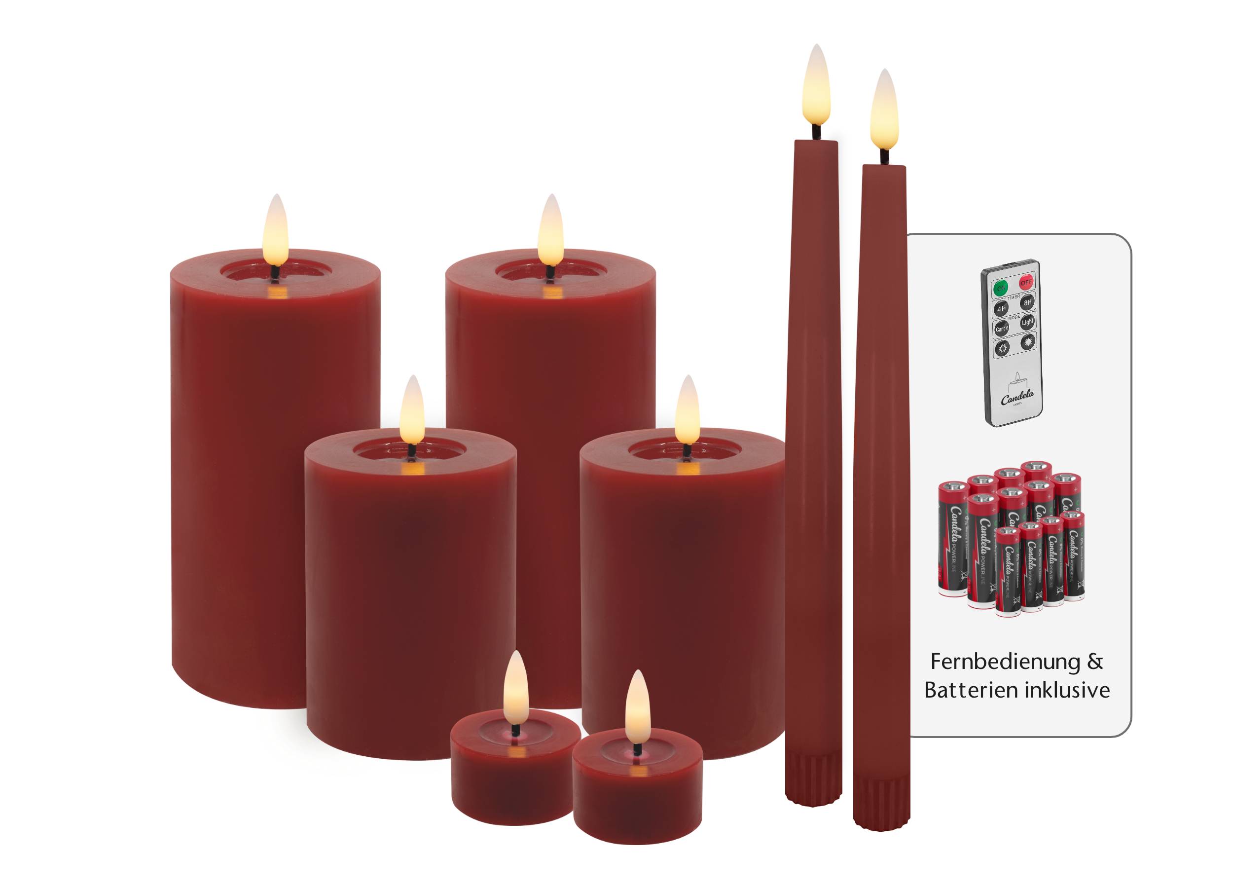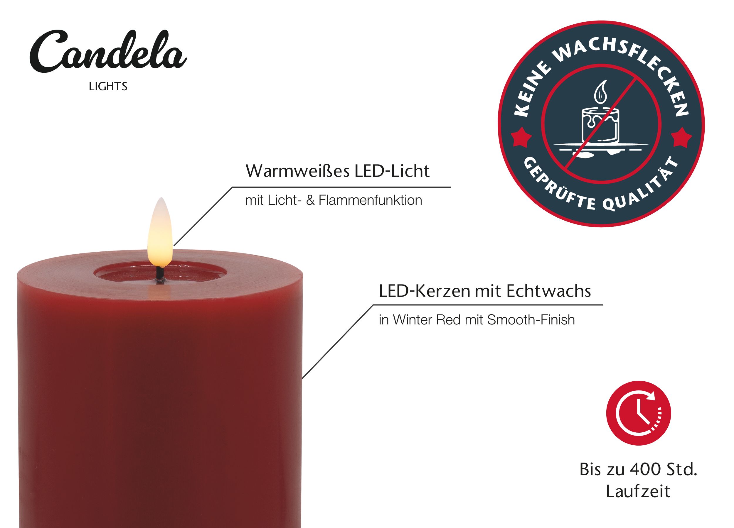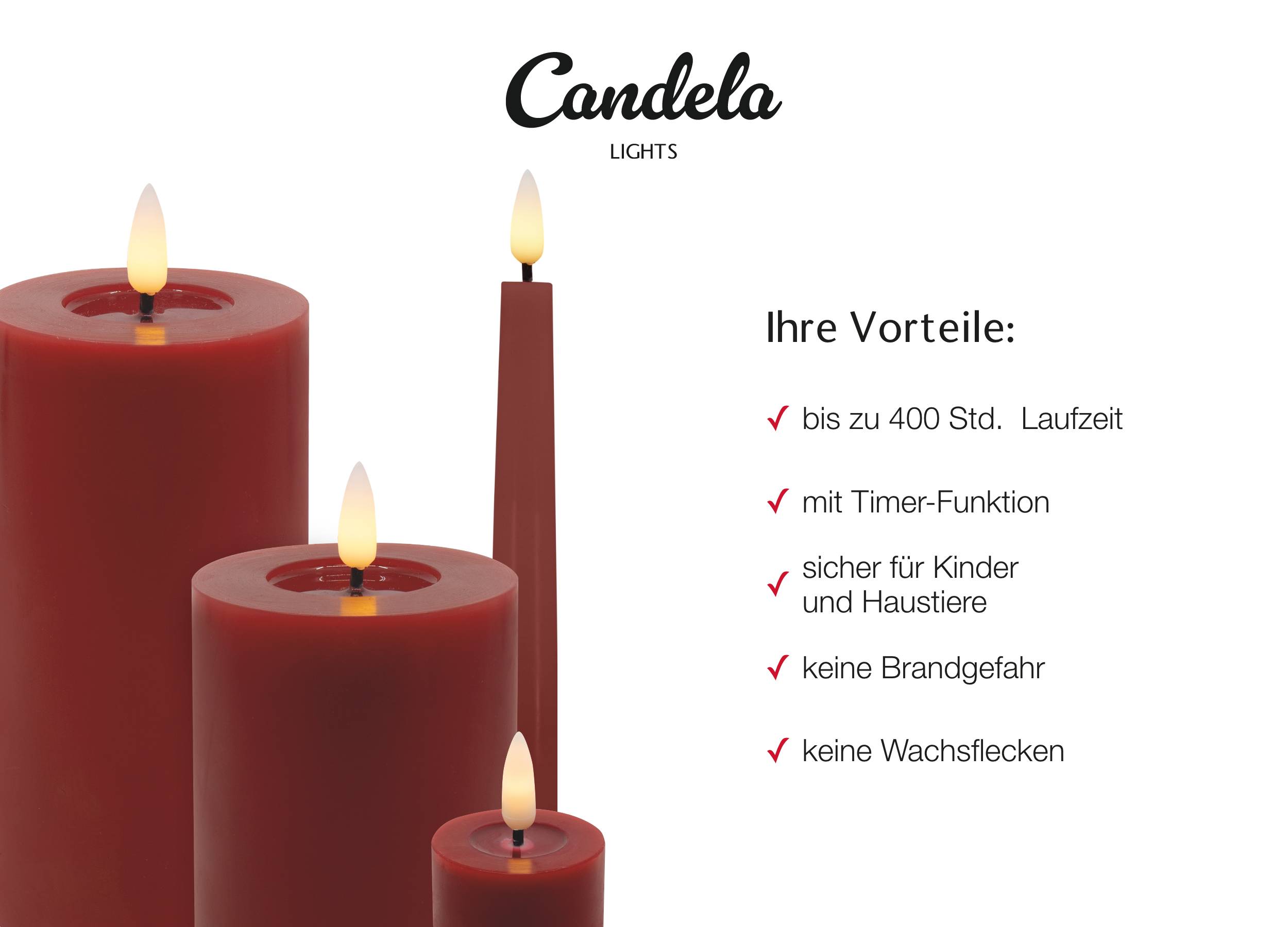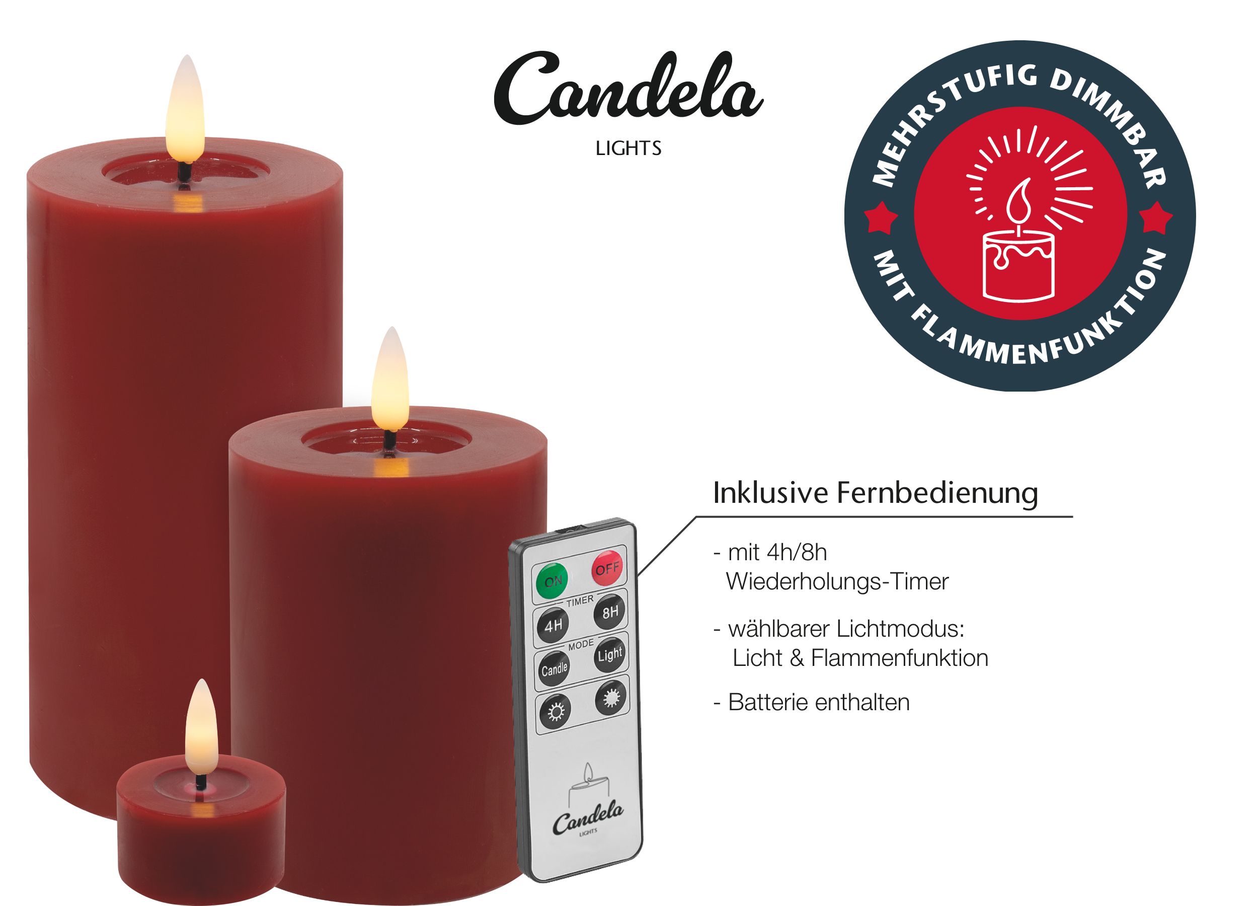 Candela Lights LED Kerzen 8er Set Winter Rot glatt Echtwachs inklusive Fernbedienung und Batterien Timer Funktion & mehrstufig dimmbar flammenlos Echtwachskerzen Stumpenkerzen