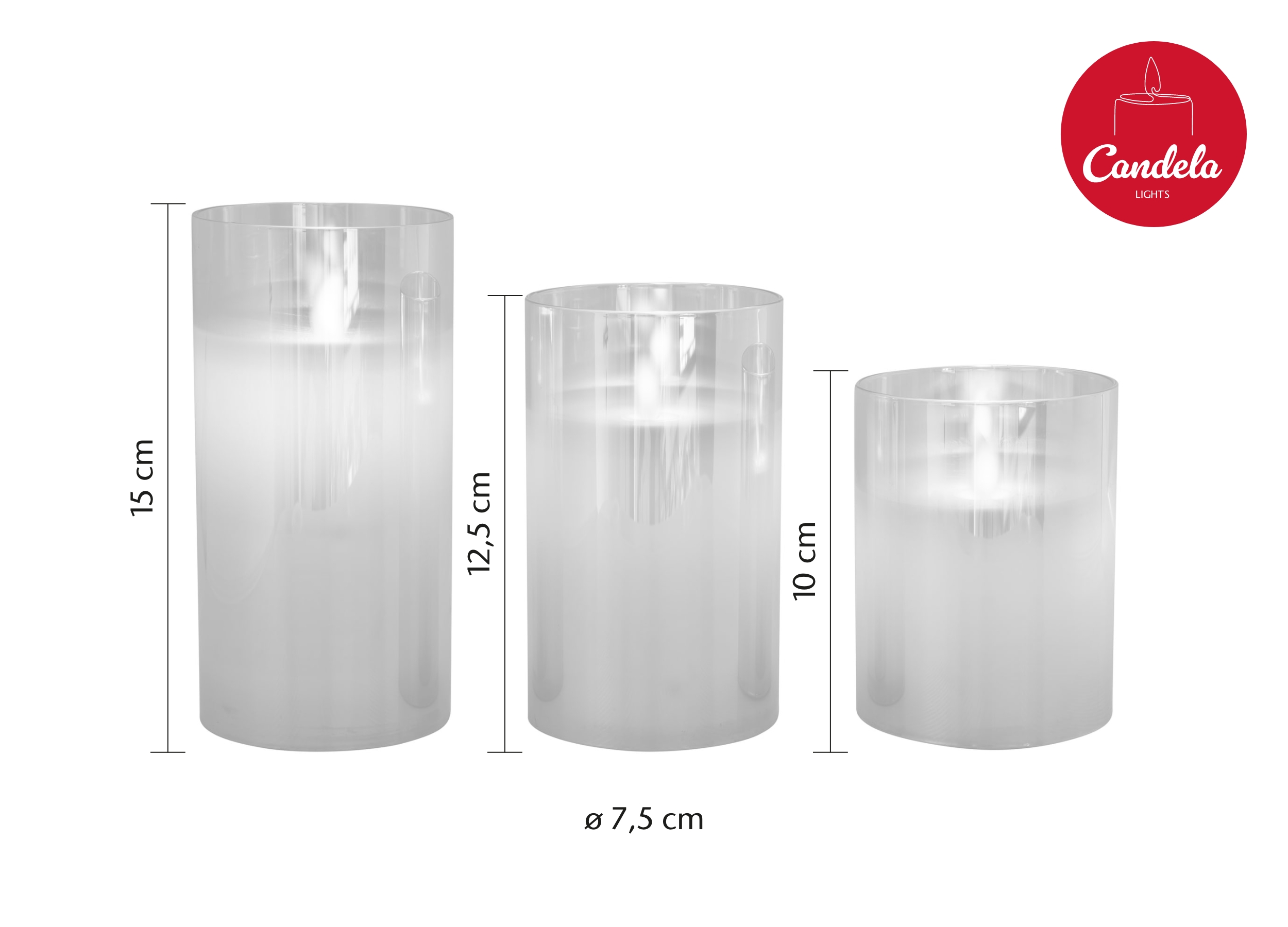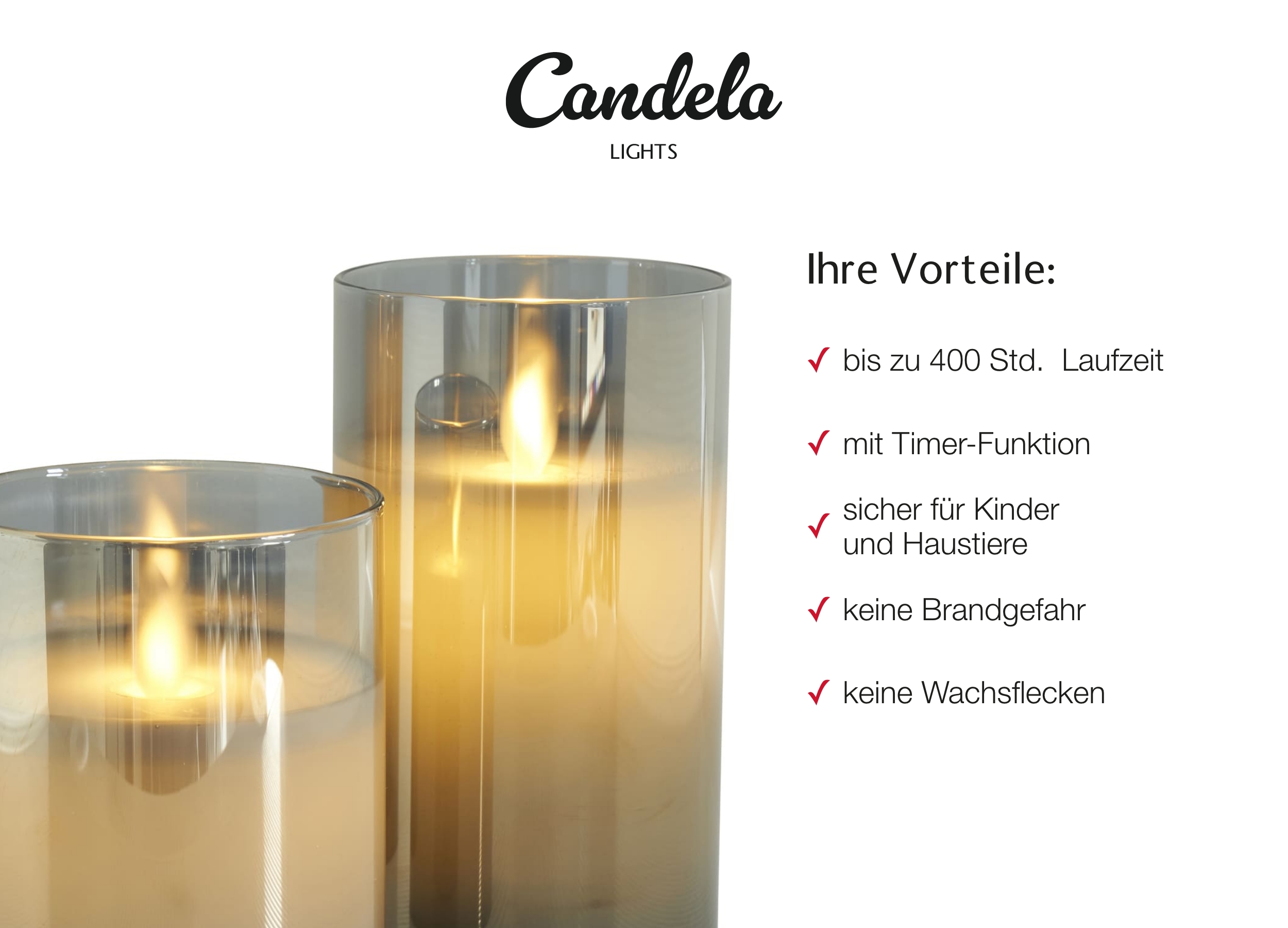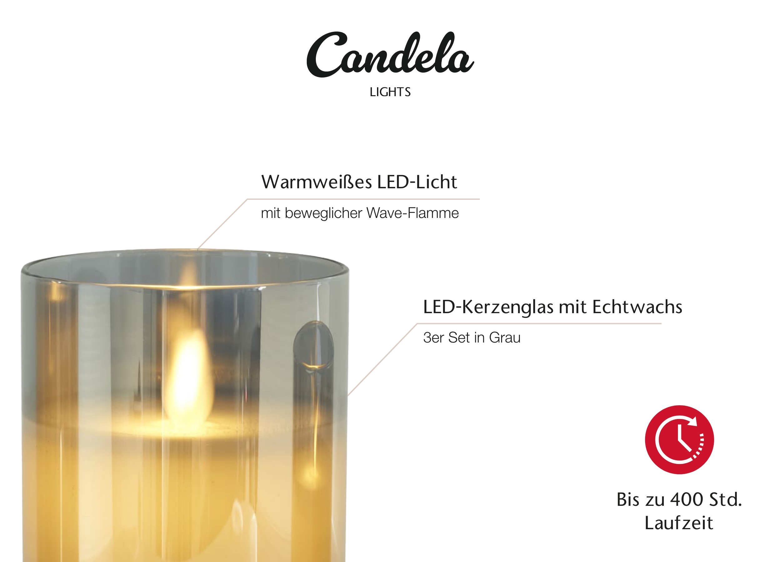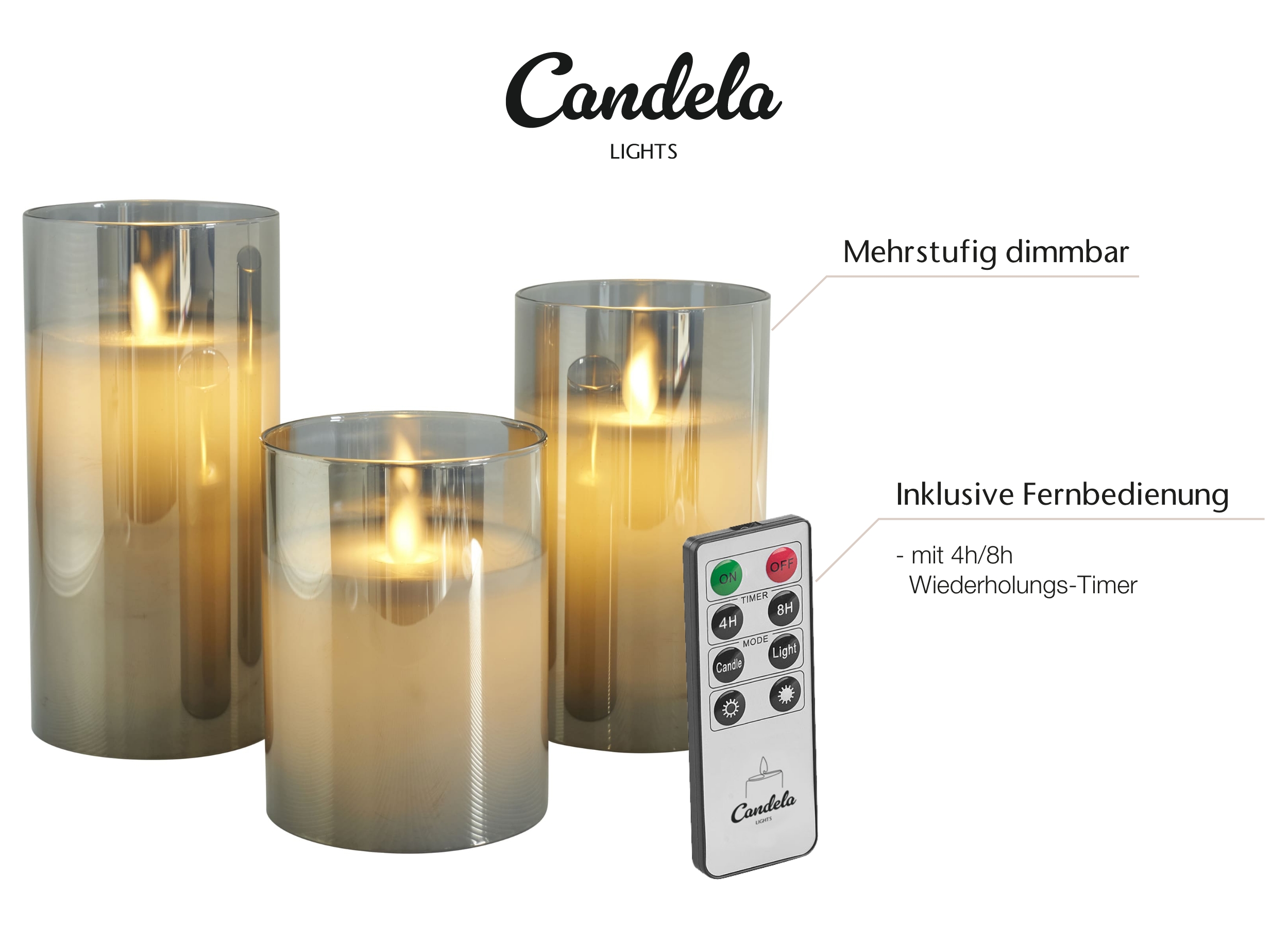 Candela Lights LED Kerzenglas 3er Set Grau Echtwachs inkl. Glas mit Fernbedienung Timer Funktion & mehrstufig dimmbar bewegliche Flamme Echtwachskerzen