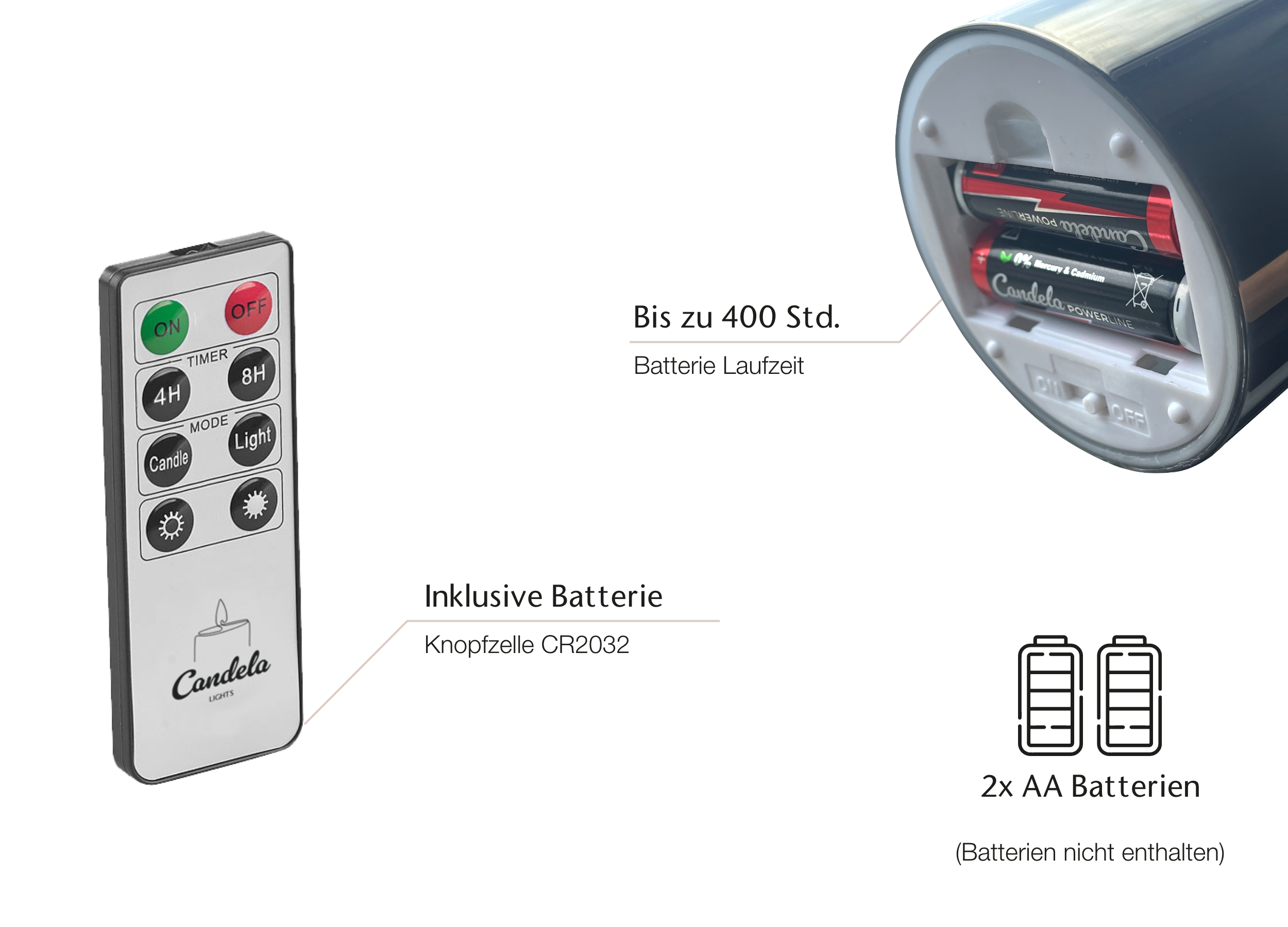 Sie benötigen für den Betrieb pro Kerze 2xAA Batterien. Bitte beachten Sie unsere Batterie-, Entsorgungs- sowie Elektrohinweise für die Produkte von LC Home.