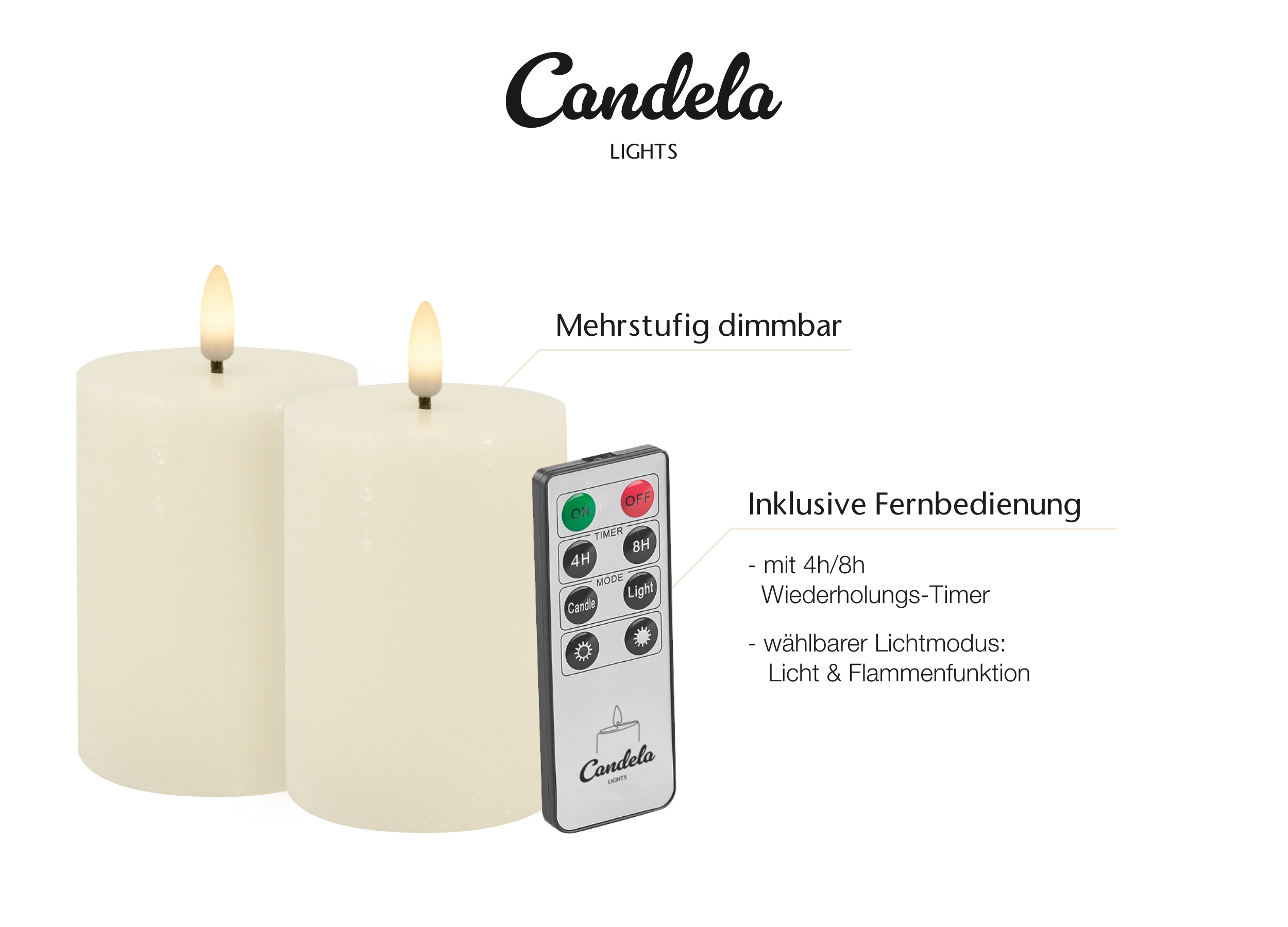Candela Lights LED Stumpenkerzen 2er Set Echtwachs creme rustic H10xØ7,5cm Flammeneffekt & feste Flamme mit Fernbedienung Timer Funktion & mehrstufig dimmbar Echtwachskerzen