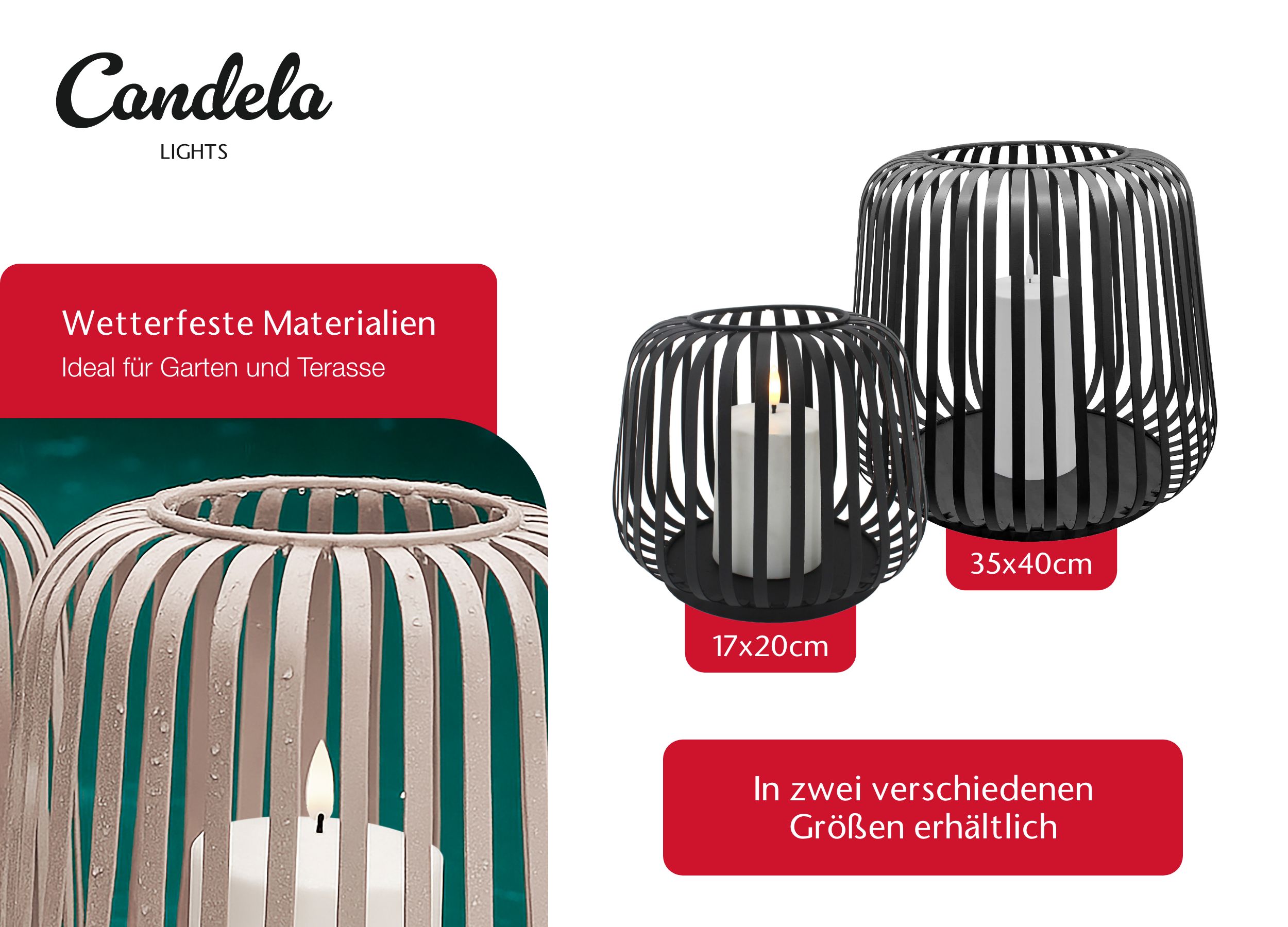 Gefertigt aus hochwertigem, wetterfestem Metall sorgt sie für eine warme, einladende Beleuchtung – ganz ohne offene Flamme. Im Inneren erstrahlt eine herausnehmbare LED-Kerze in warmweißem Licht und überzeugt durch ihren realistischen Flammeneffekt. Sie spendet gemütliche Atmosphäre – sicher, energiesparend und perfekt für den Innen- wie Außenbereich.