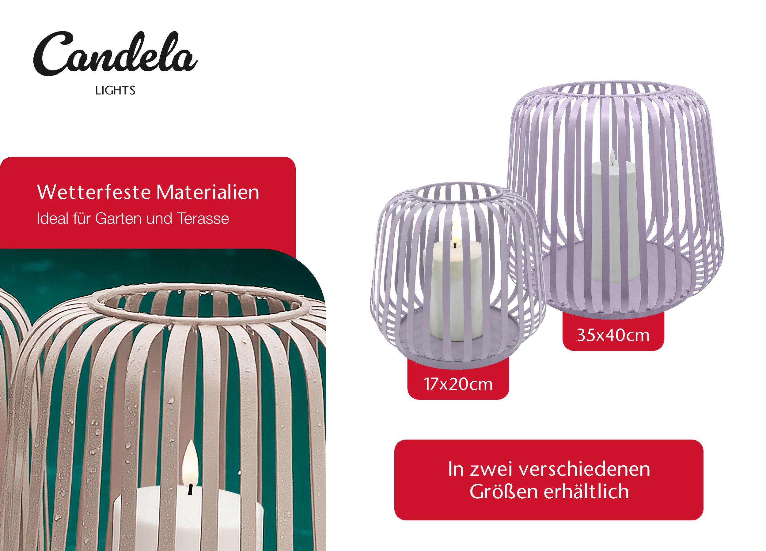 Erhältlich in sechs stilvollen Farben (White, Sand, Green, Grey, Black, Purple) und zwei Größen (17 x 20 cm und 35 x 40 cm) fügt sich die Laterne harmonisch in jedes Wohn- oder Gartenambiente ein. Ob auf Balkon, Terrasse oder im Wohnzimmer – sie ist ein echter Blickfang mit stimmungsvoller Wirkung.