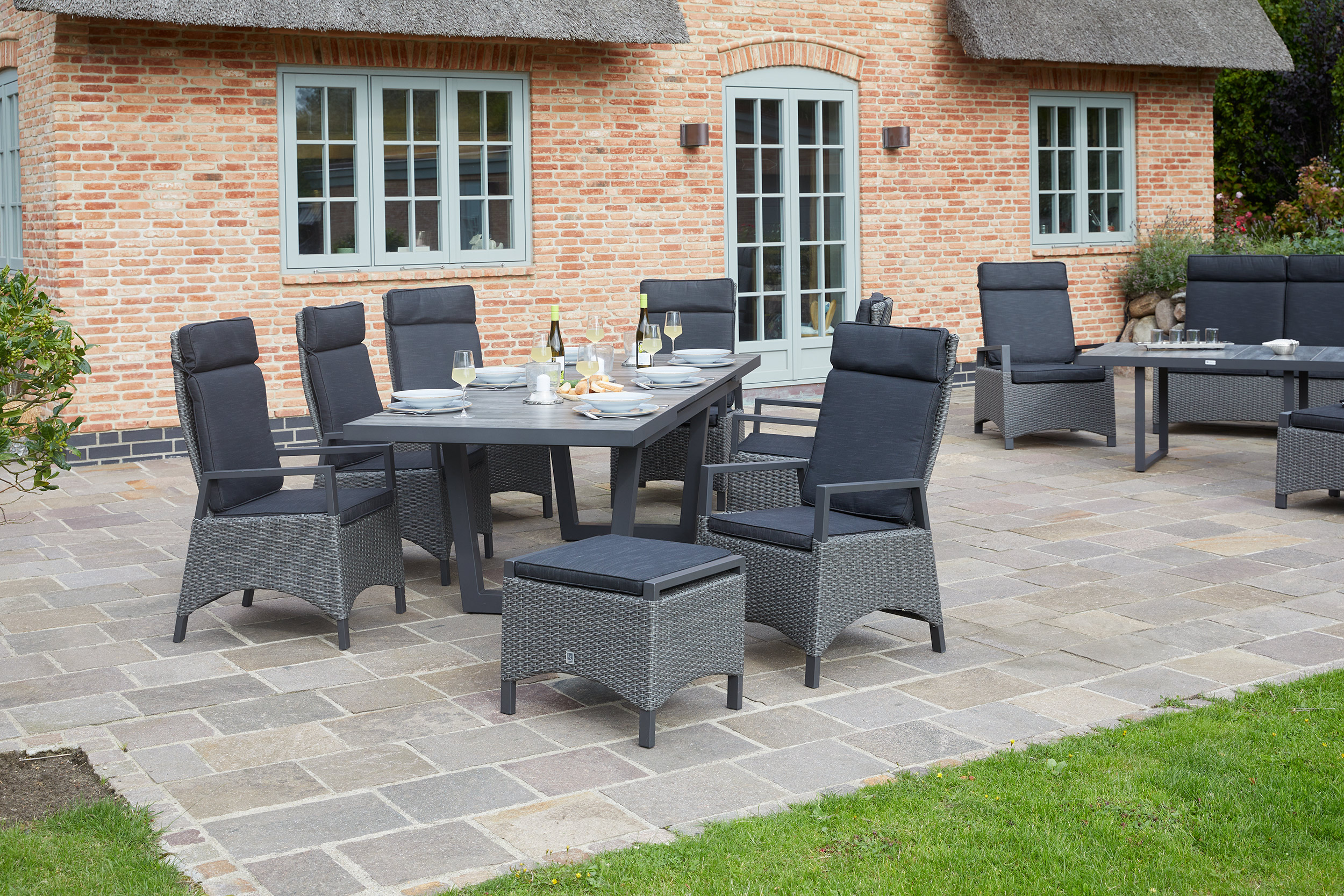 Altbewährtes trifft auf Modernes bei der neuen Möbelserie "Keramo". Die konsequente Weiterentwicklung der Serie Barcelona, nun mit eleganten Armlehnen aus Aluminium. Begeistern Sie sich und Ihre Gäste mit diesem neu entwickelten Gartensesseln. Dank stufenlos verstellbarer Rückenlehne und kombiniertem Sitz- und Rückenpolster bieten Ihnen die Gartenstühle jederzeit ein optimalen Sitzkomfort. Ein absolutes Highlight ist die Verstellung der Lehne per Knopfdruck. Die Hochlehner sind aus Aluminium gefertigt, welche Sie leicht und unempfindlich gegen Rost machen. Die Kombination aus anthrazitfarbenen Rahmen, dem grau-melierten Polyrattangeflecht und den passenden Auflagen wird Ihre Terrasse oder den Wintergarten optisch bereichern. Gönnen Sie sich den Luxus von hochwertigen und langlebigen Möbeln für den Außenbereich.