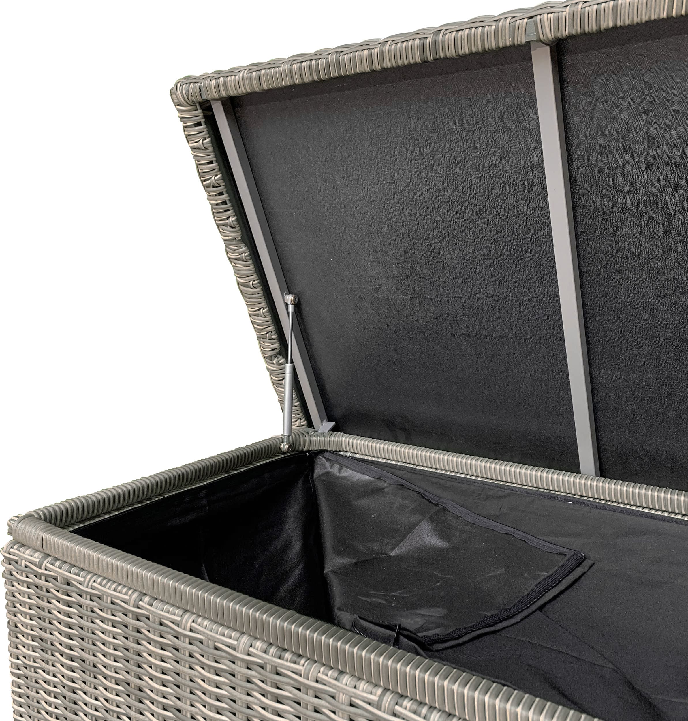 Diese geräumige Gartentruhe passt ideal zu der Möbelserie Bilbao. Dank der Maße von 152 x 68 x 73 cm bietet Ihnen die mit Polyrattan-Geflecht bezogene Gartenbox aus Aluminium ausreichend Platz für 12 Auflagen der Dining- oder 8 Polster der Living-Serie. Die Truhe ist innen mit einem wasserdichten Kunststoffinlay (Polybag) und Reißverschluß ausgestattet. Ideal auch für das Verstauen von Tischdekoration, Spielzeug oder die Sitz- und Rückenkissen Ihrer Loungemöbel.