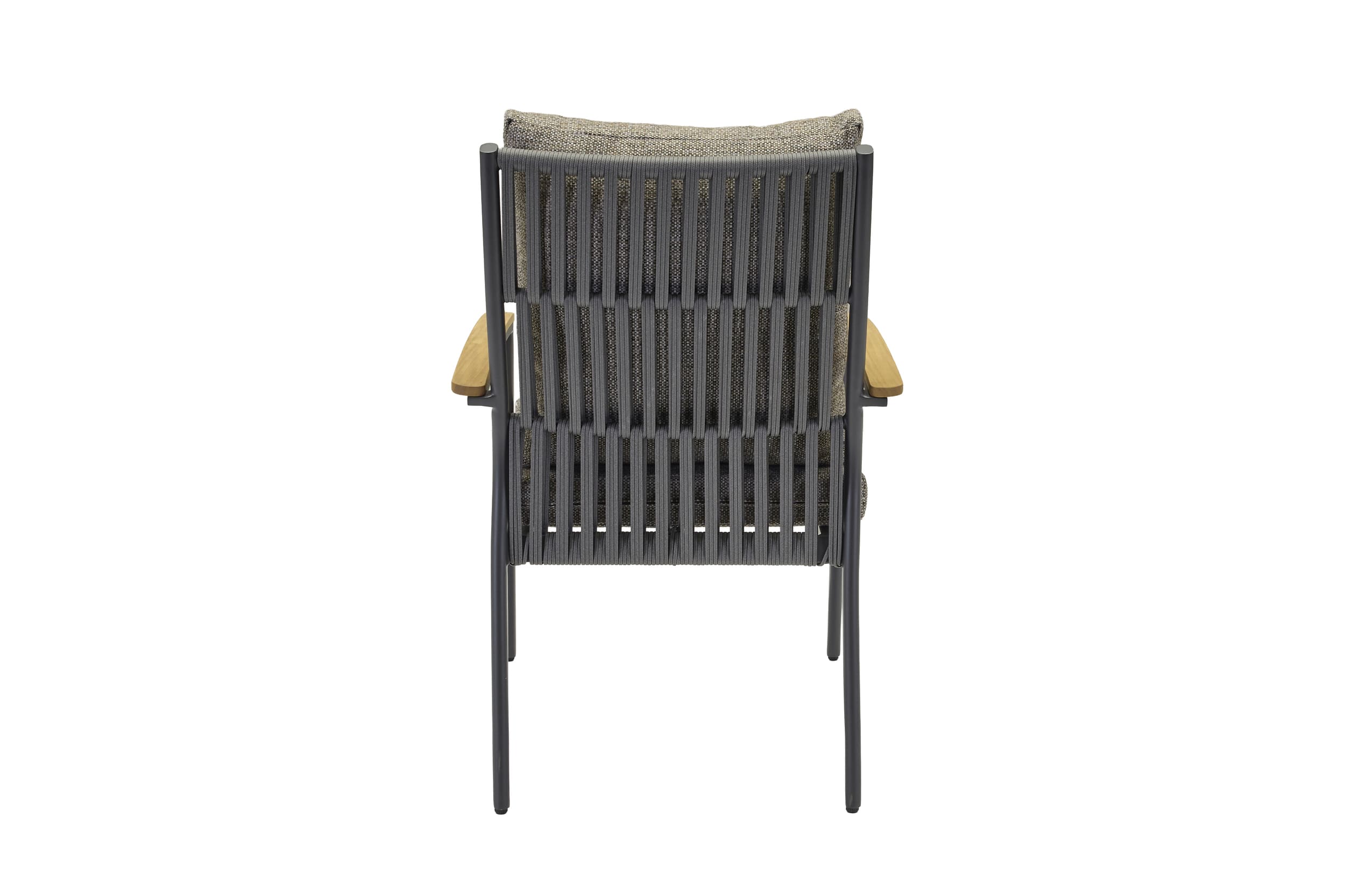 Die Rückenlehne aus Rope in Grau wirkt luftig und elegant und bietet gleichzeitig angenehmen Halt. Für ein warmes, hochwertiges Detail sorgen die Teakholz-Armlehnen, die sich besonders angenehm anfühlen und dem Stuhl eine edle Optik verleihen. Das Sitzkissen mit Bezug aus braunem Webstoff rundet den Komfort ab und macht das Sitzen auch über längere Zeit sehr bequem – perfekt für lange Dinner-Abende oder entspannte Kaffeerunden im Freien.