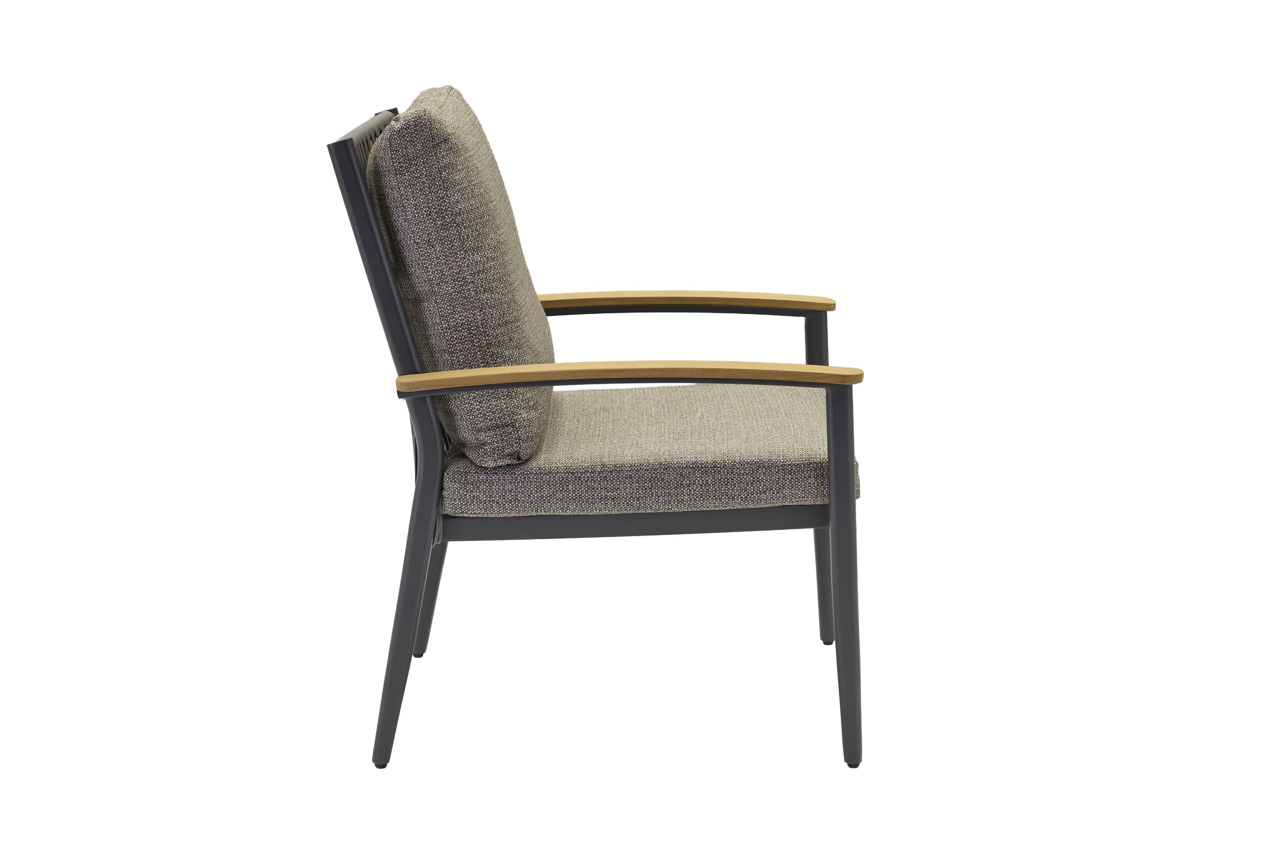 - Attraktiver Materialmix: Modernes, anthrazitfarbenes Aluminiumgestell kombiniert mit Armlehnen aus Teakholz für eine stilvolle Note.