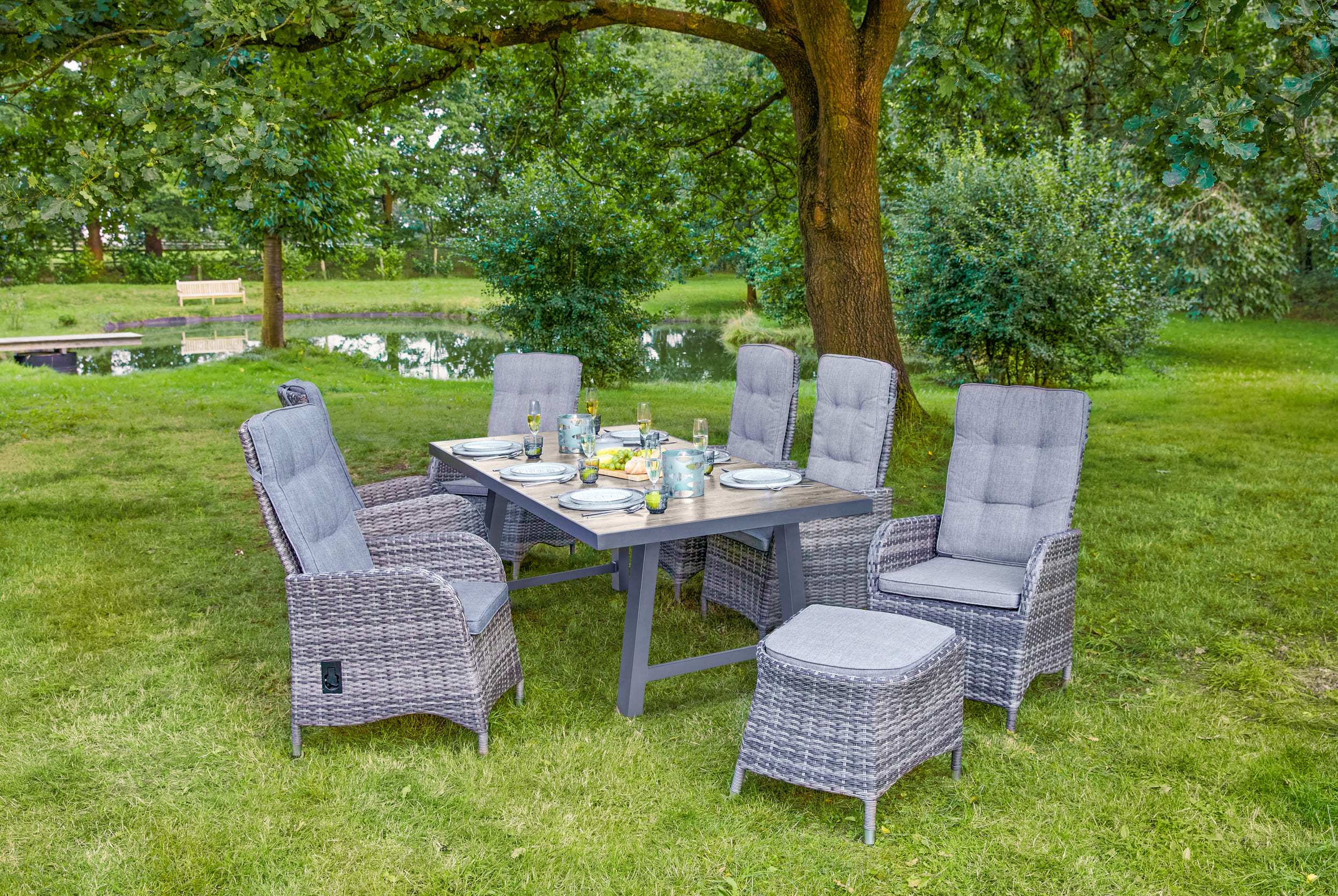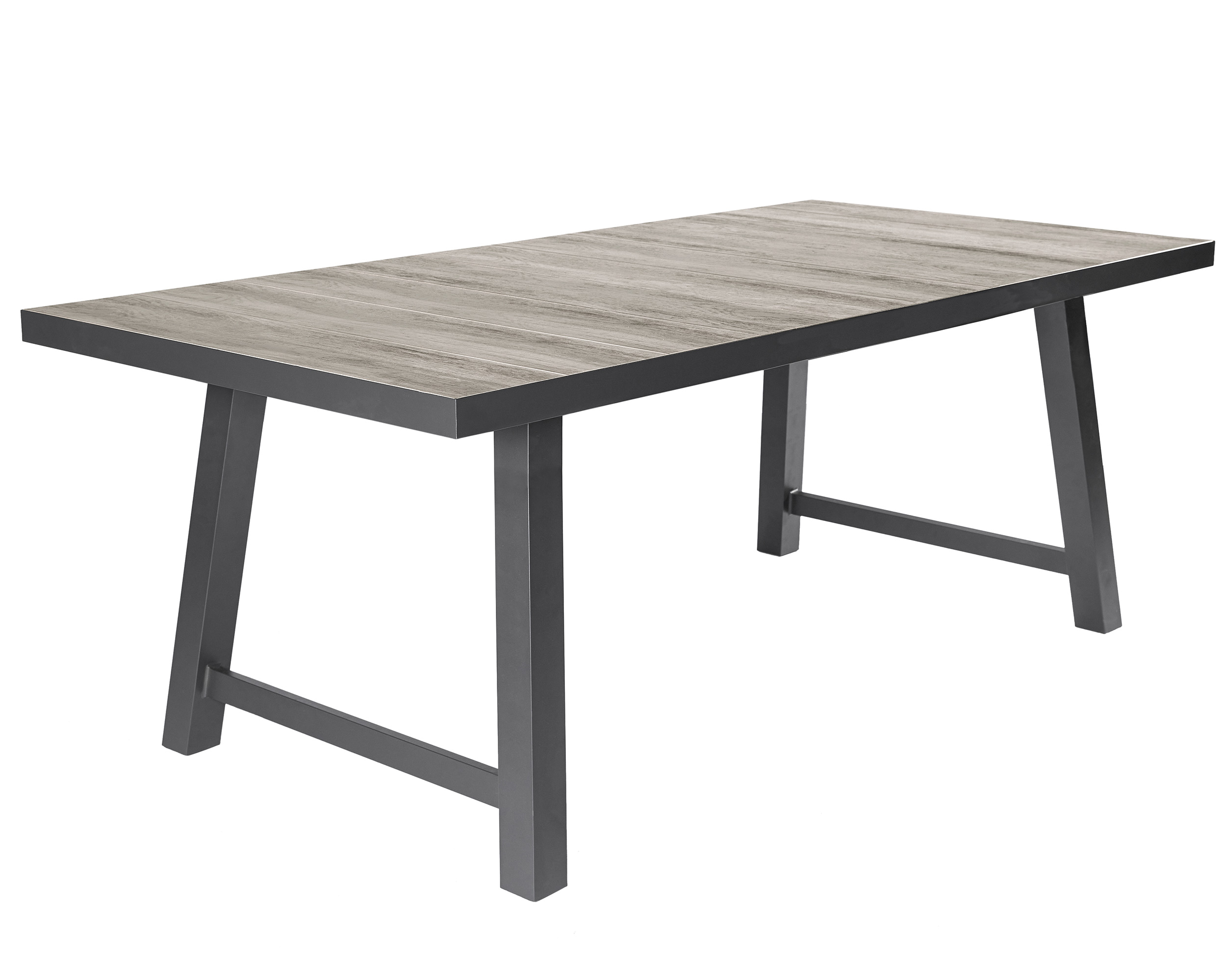 Die Möbelserie »Bailado« vereint gekonnt Stil und Funktionalität und stellt einen echten Blickfang für Ihre Terrasse oder Ihren Wintergarten dar. Der neu entwickelte Esstisch überzeugt mit einer Platte aus Keramik in Holzoptik, die in den eleganten Farbtönen Grau oder Braun erhältlich ist. Dank der Kratz- und Stoßfestigkeit bleibt die Tischplatte auch bei intensiver Nutzung in einwandfreiem Zustand – ideal für den Outdoor-Bereich. Der Tischrahmen aus Aluminium sorgt für Leichtigkeit und ist gleichzeitig äußerst widerstandsfähig gegen Rost, was die Langlebigkeit des Möbelstücks garantiert. Besonders flexibel zeigt sich das Design durch die Wahl zwischen einem A-Fuß oder V-Fuß-Rahmen, beide in einem modernen Dunkelgrau gehalten. So lässt sich der Tisch perfekt an den Stil Ihrer Außenbereichsgestaltung anpassen und wird garantiert zum Highlight Ihrer Terrasse oder Ihres Wintergartens. Mit »Bailado« entscheiden Sie sich für Möbel, die sowohl durch ihre ästhetische Wirkung als auch durch ihre Widerstandsfähigkeit und Langlebigkeit überzeugen – ein wahrer Luxus für Ihr Zuhause im Freien.