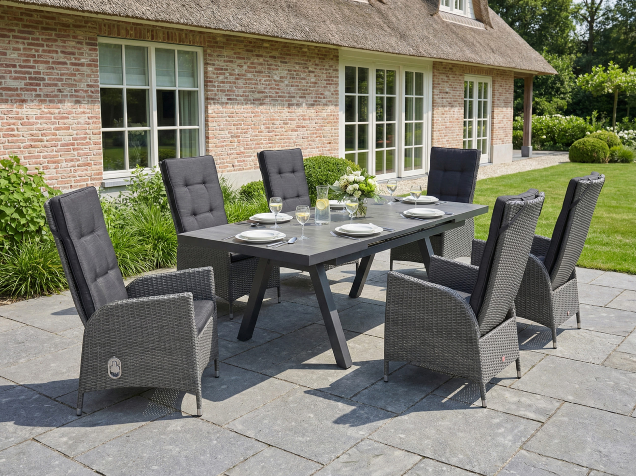 Die Gartenstühle bestechen durch ihr einzigartiges Design und ihre hohe Funktionalität. Die verstellbaren Rückenlehnen ermöglichen es Ihnen, die Neigung nach Ihren persönlichen Vorlieben anzupassen – perfekt, um gemütlich zu entspannen oder aktiv am Gartentisch zu sitzen. Die Ausziehtische überzeugen nicht nur durch ihre edle Optik, sondern auch durch ihre praktische Funktionalität. Die Tischplatten aus Keramik sind nicht nur äußerst pflegeleicht, sondern auch widerstandsfähig gegenüber Witterungseinflüssen. Die intelligenten Ausziehmechanismen ermöglichen es Ihnen, den Tisch im Handumdrehen zu vergrößern und so flexibel auf unterschiedliche Anlässe zu reagieren.