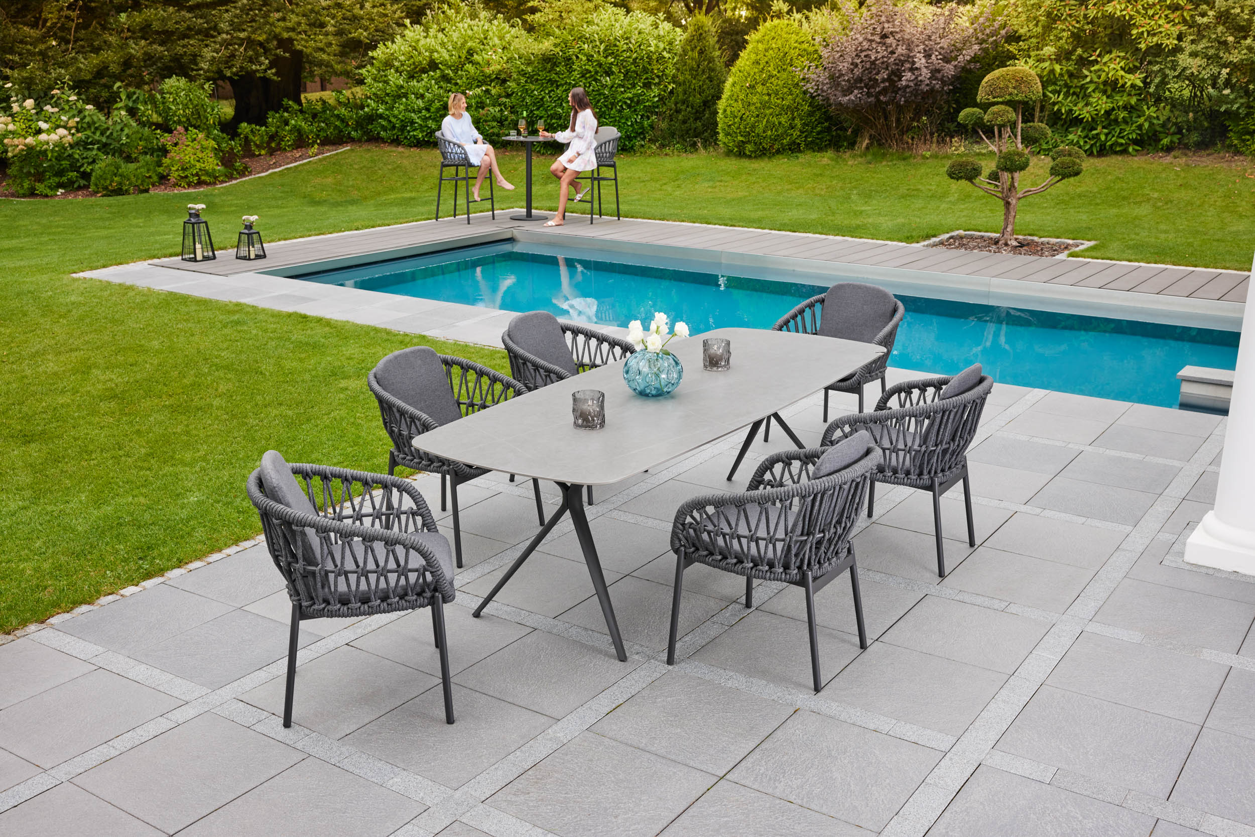 Das Grundgerüst der "Bari" Outdoormöbel besteht aus hochwertigem Aluminium. Dieses Material verbindet Robustheit mit Leichtigkeit, was nicht nur eine einfache Handhabung, sondern auch eine lange Lebensdauer garantiert. Genießen Sie Möbel, die jeder Witterung standhalten und gleichzeitig leicht zu bewegen sind. Die Rope Bespannung besticht nicht nur durch eine moderne Eleganz, sondern ist zudem auch äußerst strapazierfähig und pflegeleicht. Es passt sich flexibel an Ihre Körperform an und sorgt somit für ein angenehmes Sitzgefühl. Die Sitz- und Rückenkissen bieten einen zusätzlichen Komfort. Die Kissenbezüge sind aus hochwertigen Olefin-Stoff, welcher wetterfest und zudem beständig gegenüber UV-Strahlung ist. Die Tische der "Bari" Serie sind mit sintered stone Tischplatten ausgestattet, die nicht nur elegant aussehen, sondern auch äußerst langlebig sind. Diese Platten sind widerstandsfähig gegenüber Kratzern, Flecken und extremen Temperaturen, was für eine langanhaltende Ästhetik sorgt.