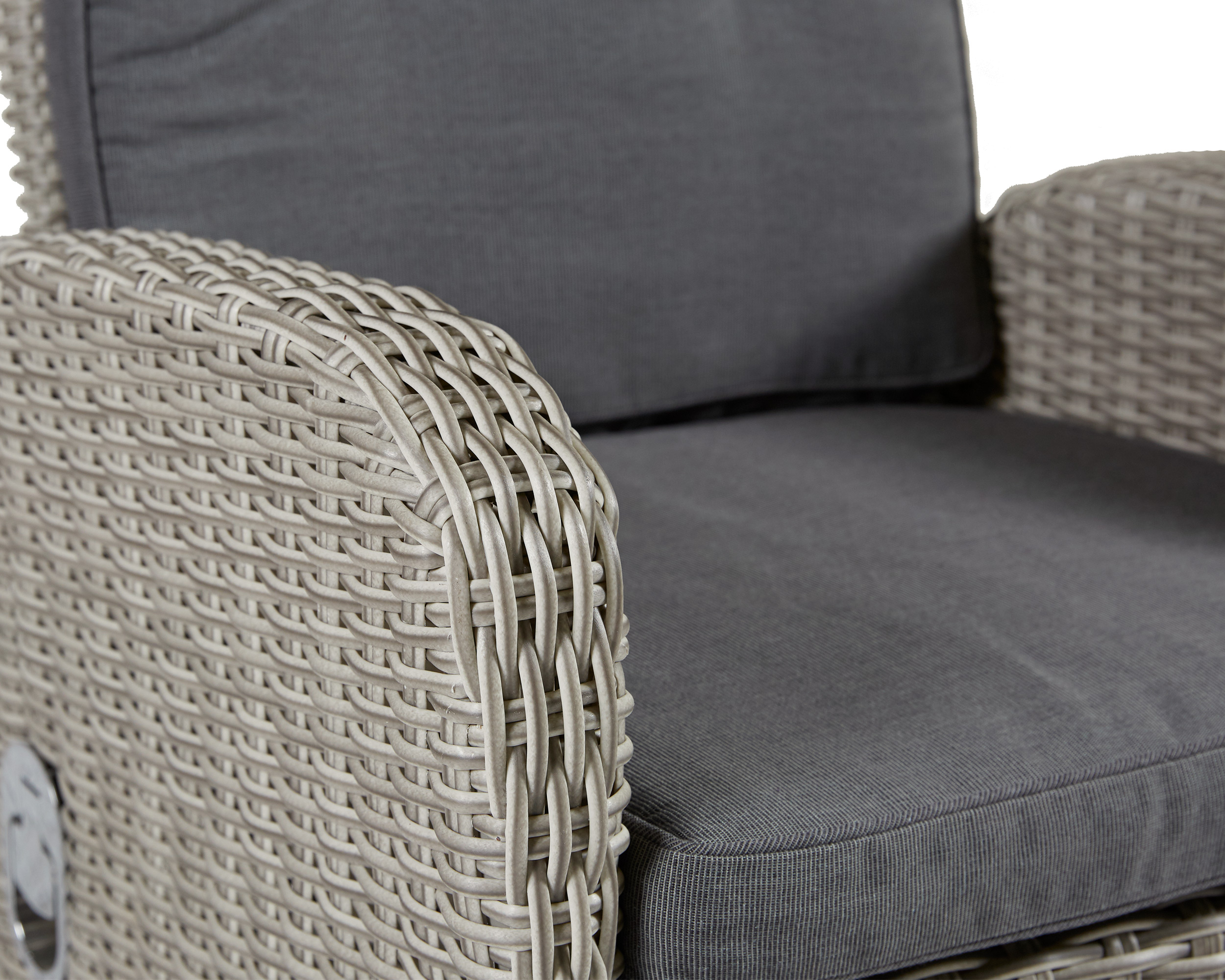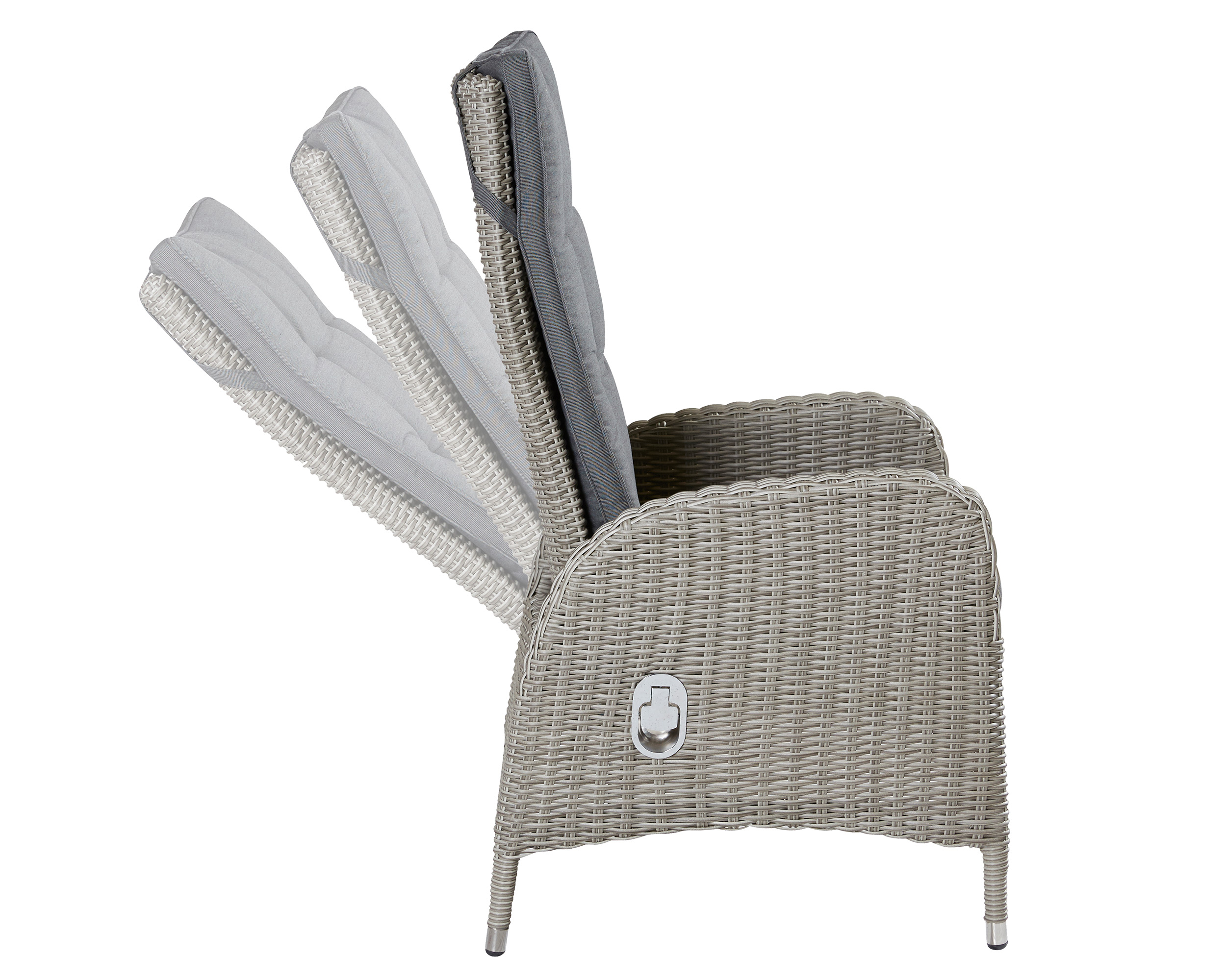 Die Sitzgruppe für 6 oder 8 Personen ist mit ihren hellen harmonischen Grautönen ein absoluter Blickfang. Das Set, bestehend aus 6 oder wahlweise 8 Positionsstühlen und einem eckigen Esstisch, bietet viel Platz für eine gemütliche Runde. Die komfortablen Positionsstühle sind mit einer verstellbaren Rückenlehne ausgestattet, die sich dank der stufenlosen (Gasdruck-) Mechanik absolut mühelos bewegen lässt. Für einen zusätzlichen Sitzkomfort sorgt die mitgelieferte, dicke Polsterauflage. Die Polyrattanfasern der Stühle sind UV- und regenbeständig und lassen eine vielseitige Nutzung, ob im Gartenbereich oder im Wintergarten zu. Der Tisch besteht aus hochwertigen, grau-gemischten Polyrattanfasern und ist regenbeständig sowie UV-resistent. Ausgestattet ist der Tisch mit einer abnehmbaren Glasplatte in Spraystone-Optik. Machen Sie Ihren Außenbereich zur Wohlfühloase und genießen schöne Stunden in geselliger Runde.