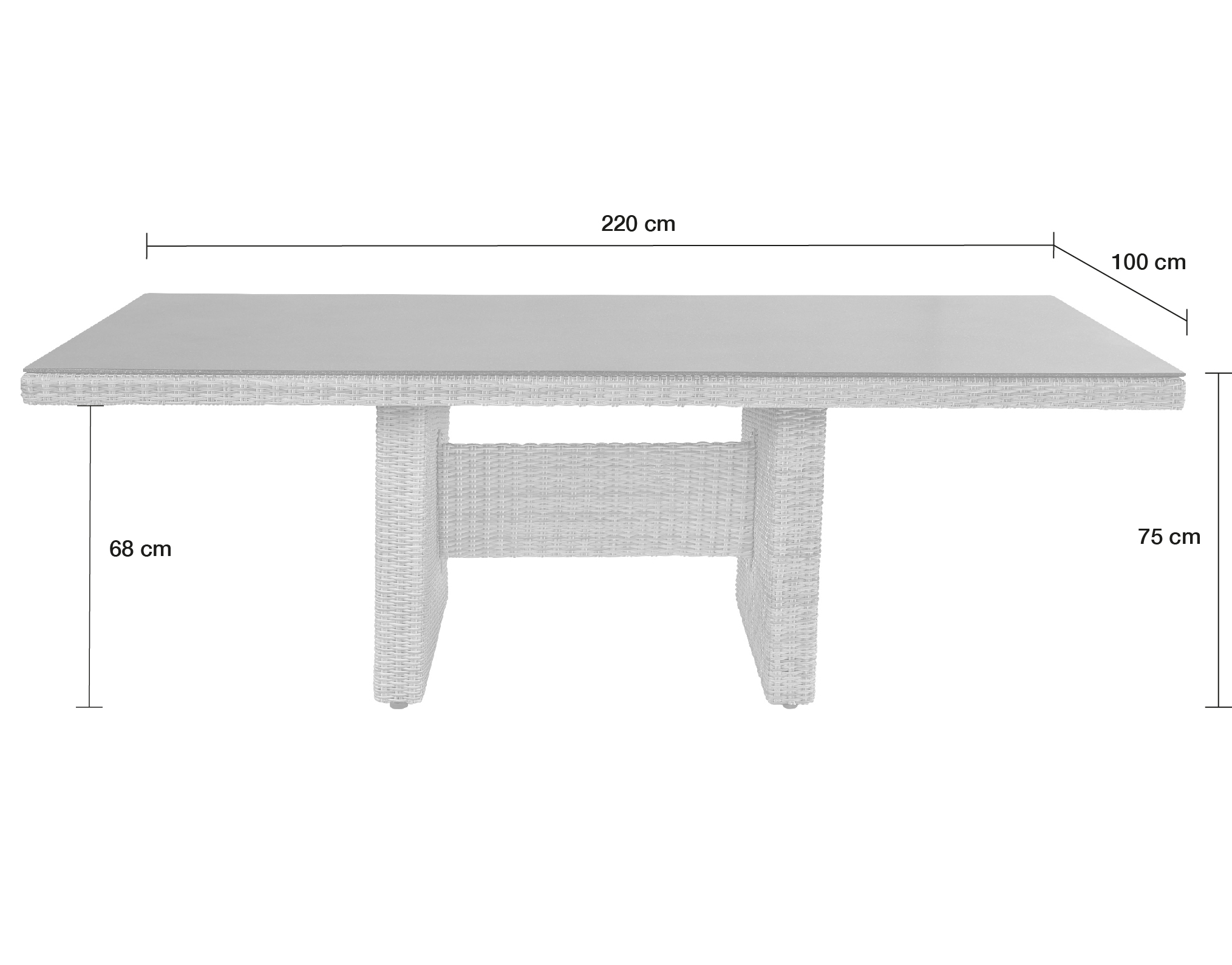 - Material Stühle Rahmen: Aluminium, Geflecht: Polyrattan, Bezug: 100% Polyester / Material Tisch: Rahmen: Aluminium, Geflecht: Polyrattan, Tischplatte: Glas