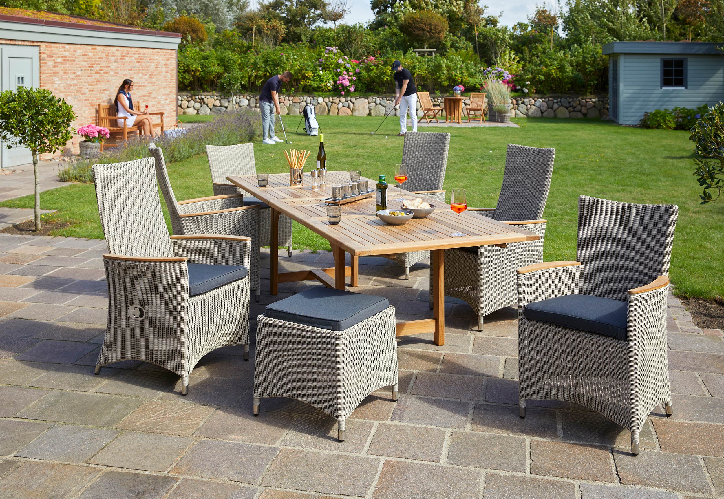 Diese Sitzgarnitur aus Teakholz und Polyrattan überzeugt nicht nur Naturfreunde. Der ausziehbare Esstisch bietet bis zu zehn Personen Platz. Die dazu passenden Chelsea Gartenstühle bieten einem angenehmen Sitzkomfort und sind zudem passend zum Esstisch mit Teak Armlehnen ausgestattet.