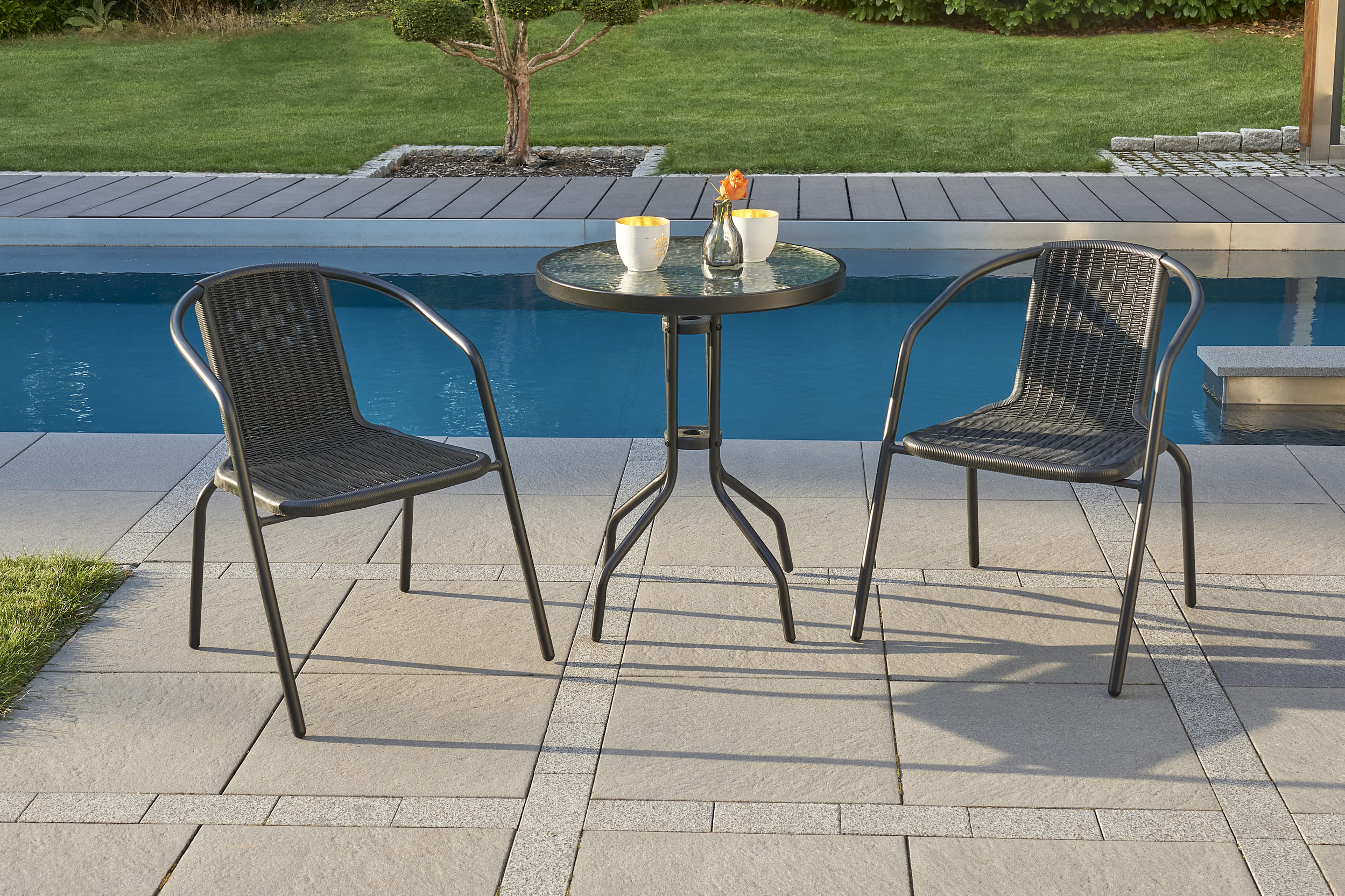Die Tische der Serie verfügen über ebenso stabile Gestelle aus pulverbeschichtetem Stahl und Tischplatten aus robustem Hartglas. Diese Kombination gewährleistet nicht nur eine hohe Belastbarkeit, sondern auch eine einfache Reinigung und Pflege. Die glatte Oberfläche des Hartglases verleiht den Tischen einen modernen Look und macht sie zum idealen Ort für gesellige Mahlzeiten im Freien.