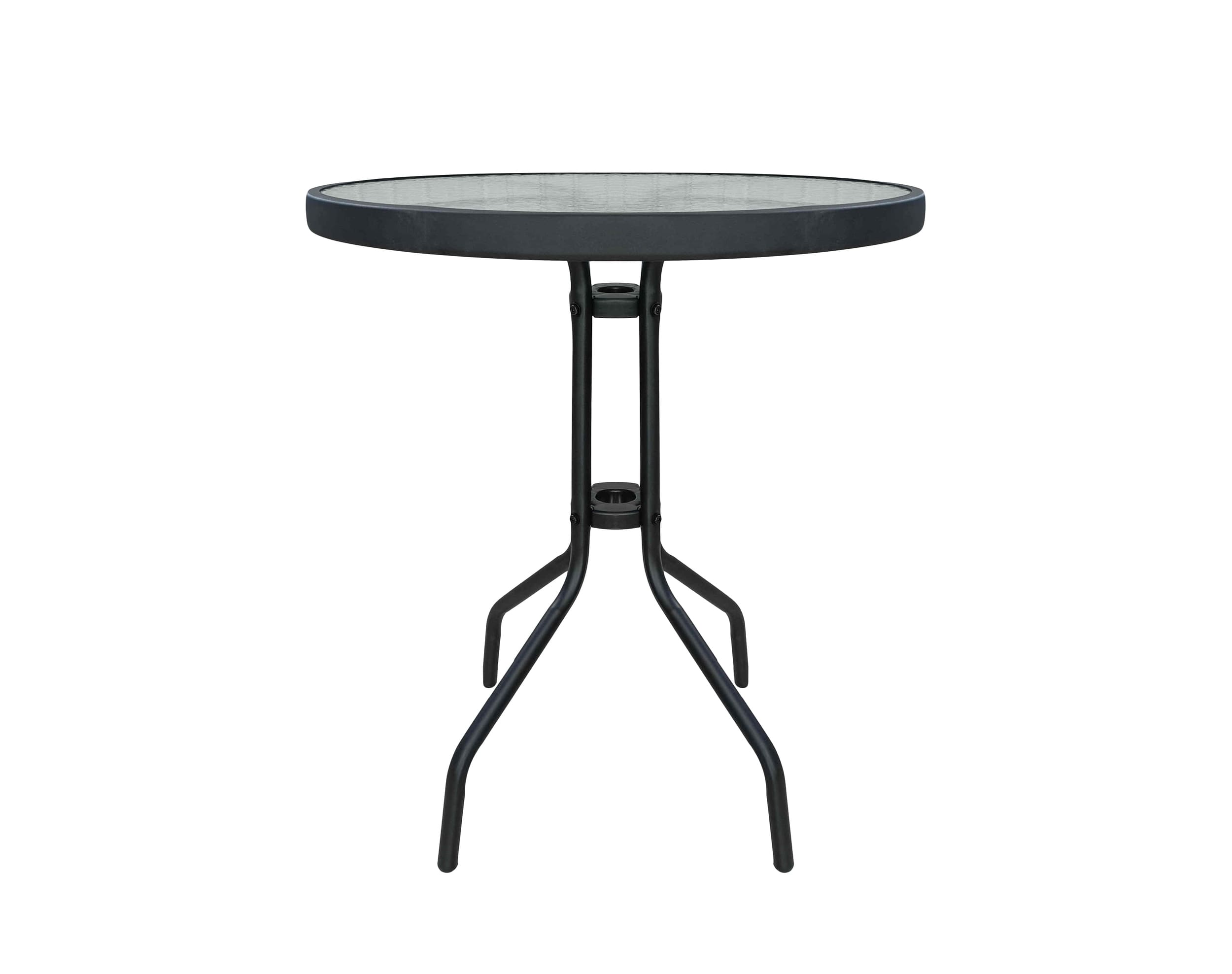 Der robuste Balkontisch aus der Serie Garvista mit einem Durchmesser von 60 cm ist eine ideale Ergänzung zu den Stapelstühlen. Die runde Tischplatte besteht aus 5 mm dickem Riffelglas, das für Stabilität und eine stilvolle Optik sorgt. Der pulverbeschichtete Stahlrahmen garantiert Langlebigkeit und Korrosionsbeständigkeit. Vier rutschfeste Füße bieten sicheren Stand, auch auf unebenem Untergrund.