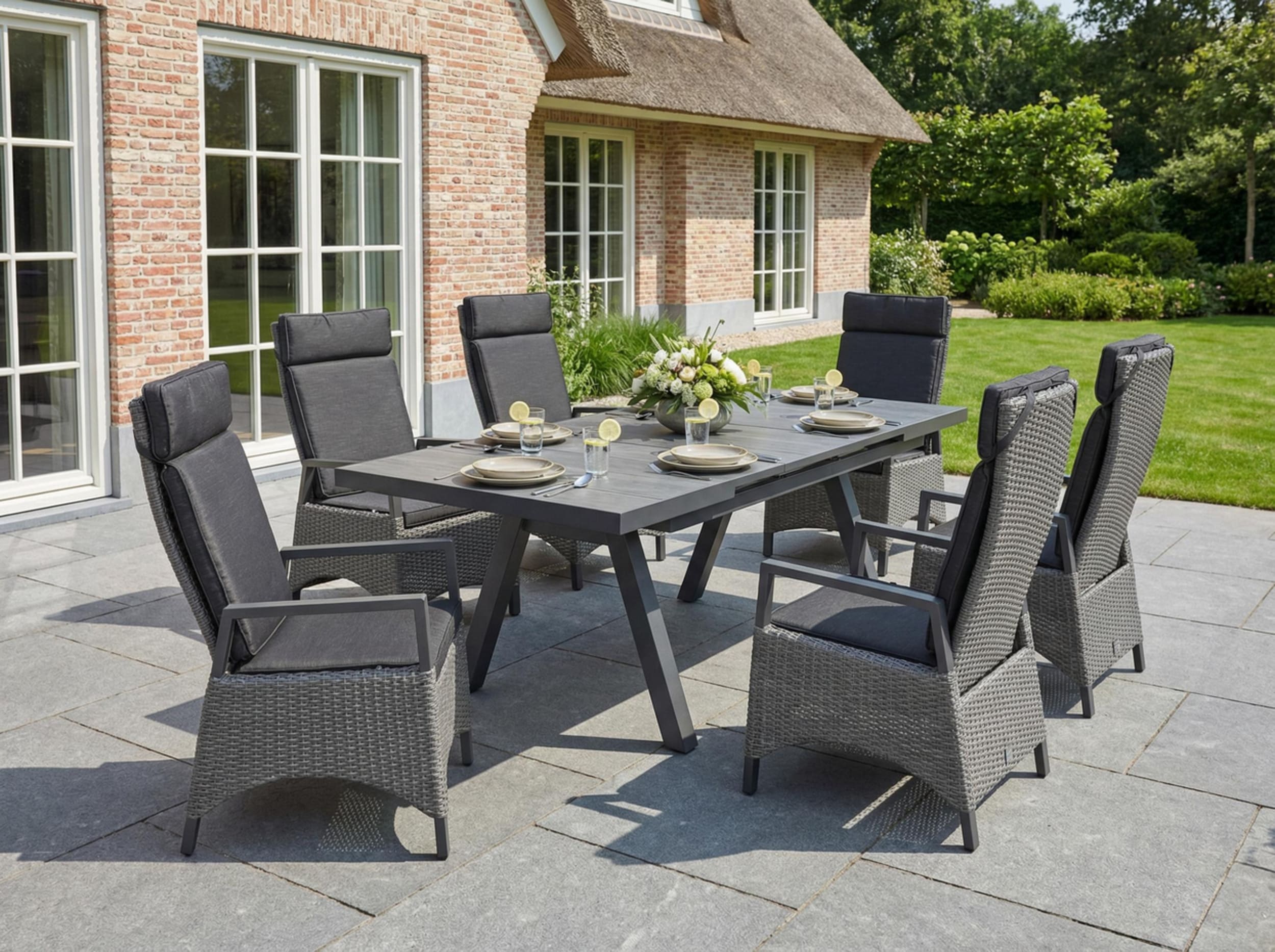 Die Gartenstühle bestechen durch ihr einzigartiges Design und ihre hohe Funktionalität. Die verstellbaren Rückenlehnen ermöglichen es Ihnen, die Neigung nach Ihren persönlichen Vorlieben anzupassen – perfekt, um gemütlich zu entspannen oder aktiv am Gartentisch zu sitzen. Die Ausziehtische überzeugen nicht nur durch ihre edle Optik, sondern auch durch ihre praktische Funktionalität. Die Tischplatten aus Keramik sind nicht nur äußerst pflegeleicht, sondern auch widerstandsfähig gegenüber Witterungseinflüssen. Die intelligenten Ausziehmechanismen ermöglichen es Ihnen, den Tisch im Handumdrehen zu vergrößern und so flexibel auf unterschiedliche Anlässe zu reagieren.