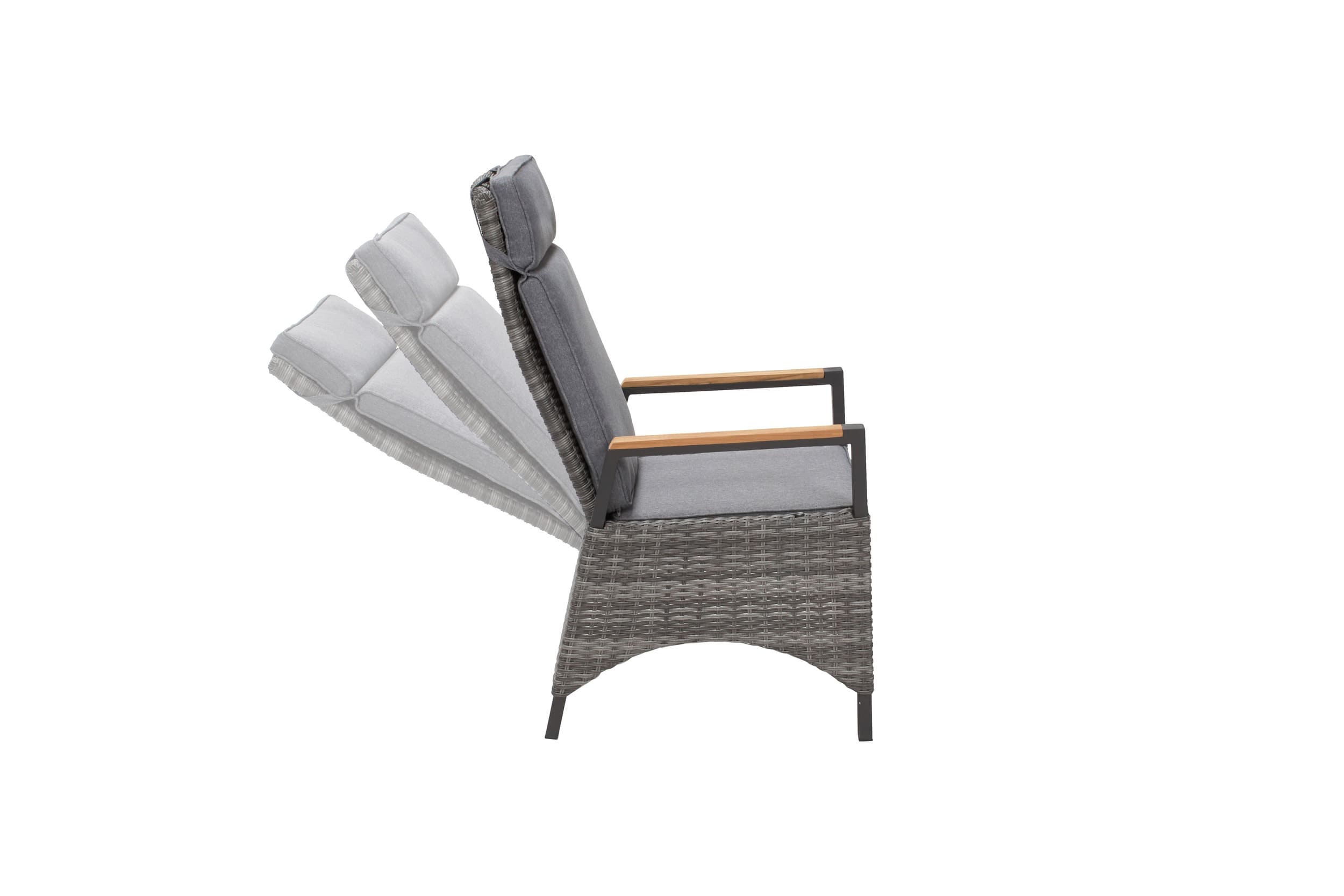 - Bespannung aus strapazierfähigen grau-mix Kunststofffasern in Rattanoptik und Teakholz Armlehne