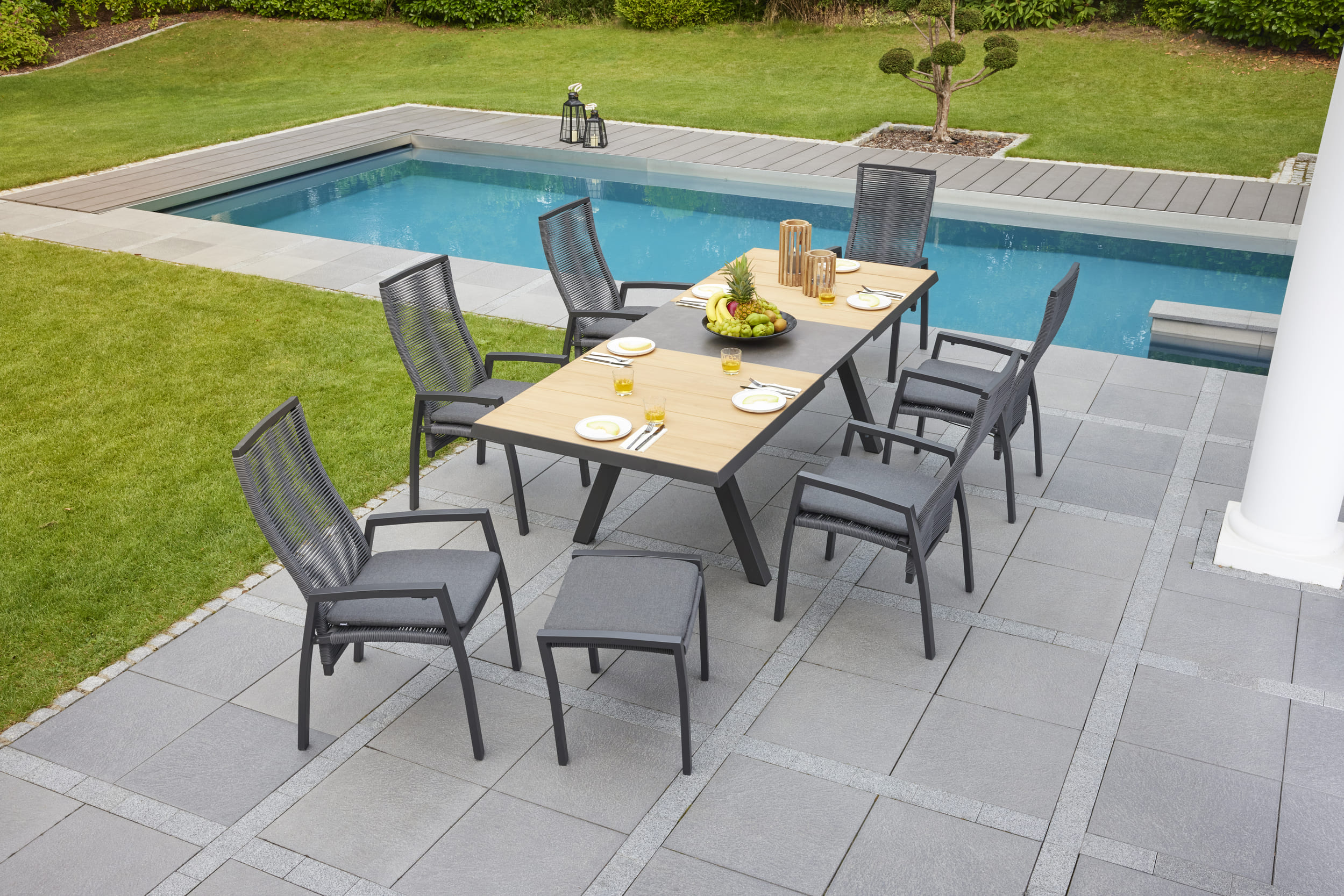 LC Garden »Kumasi« Gartenset III 7tlg. Esstisch 200/260x100cm Aluminium/Teakholz/Keramik + 6 Gartenstuhl anthrazit/grau Aluminium/Rope Positionsstuhl