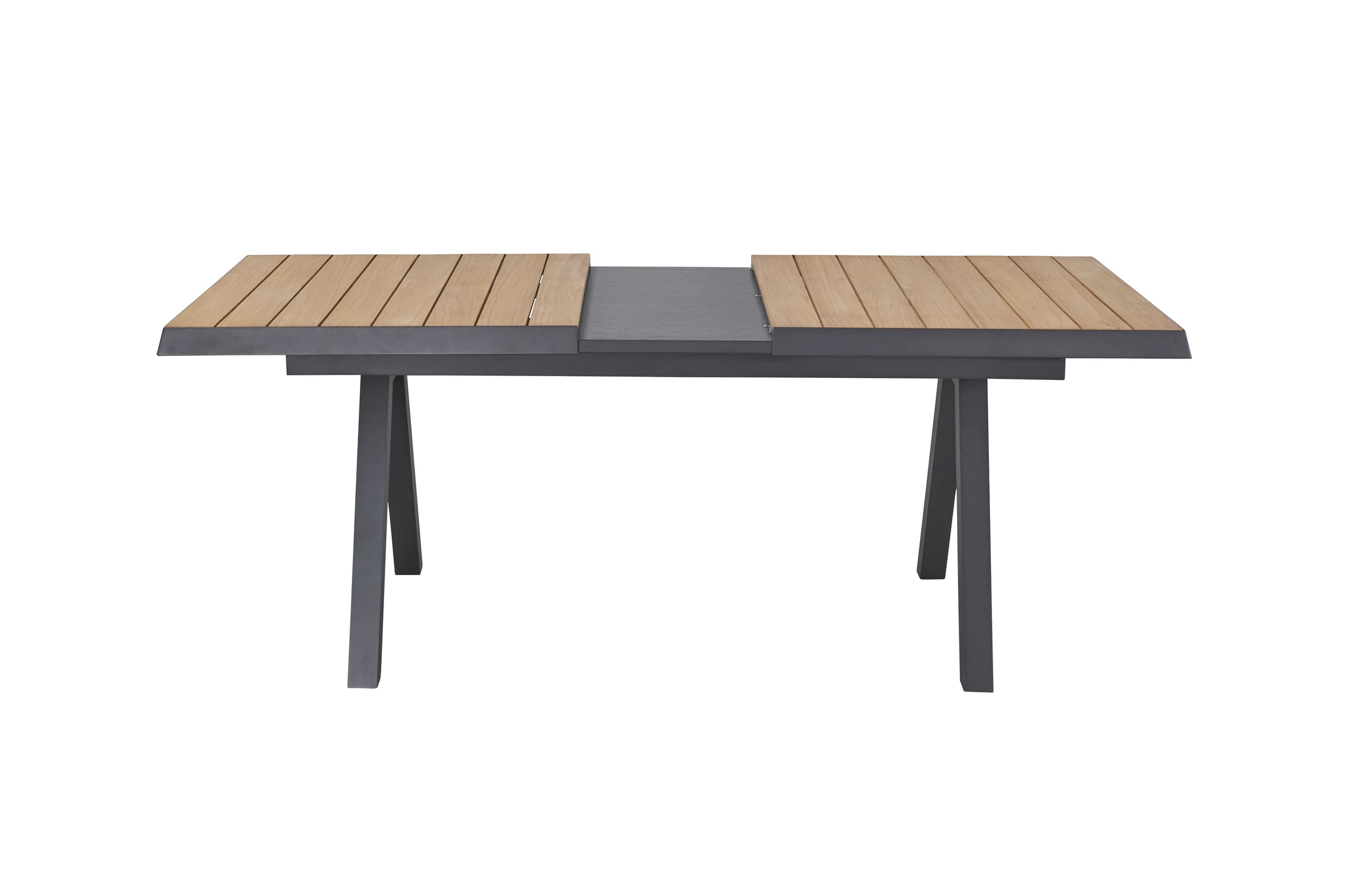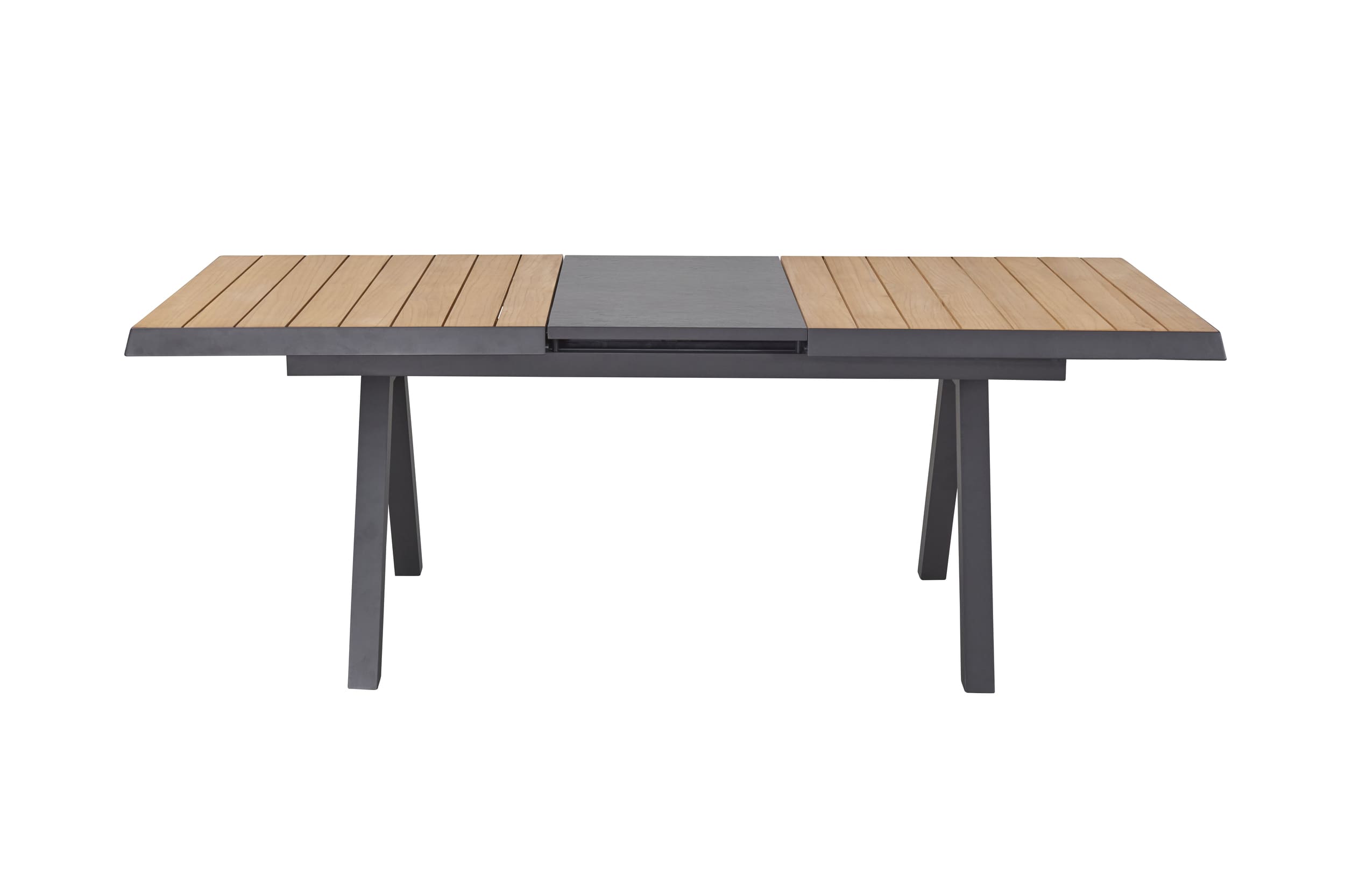 - Tischplatte aus robustem Teakholz und widerstandsfähigen Keramikplatten