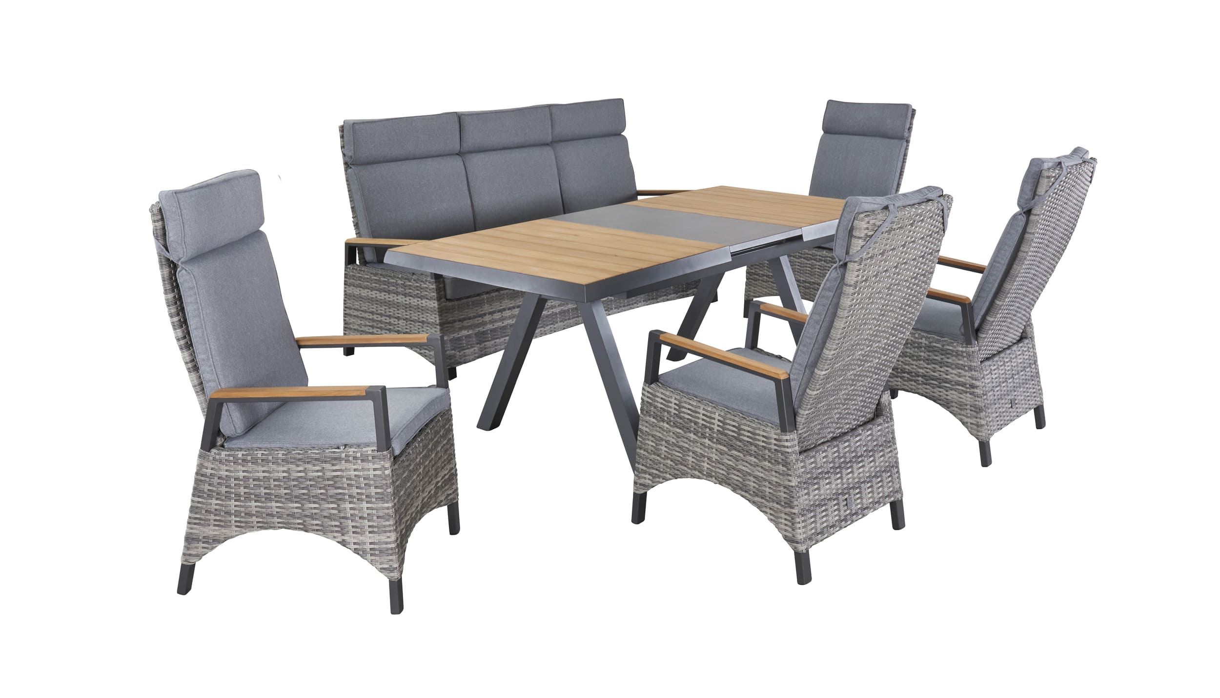 LC Garden »Kumasi« Gartenset VI 6tlg. Esstisch 160/210x100cm Aluminium/Teakholz/Keramik + 4 Positionsstühle + 3-Sitzer Sofa mit Teak-Armlehne