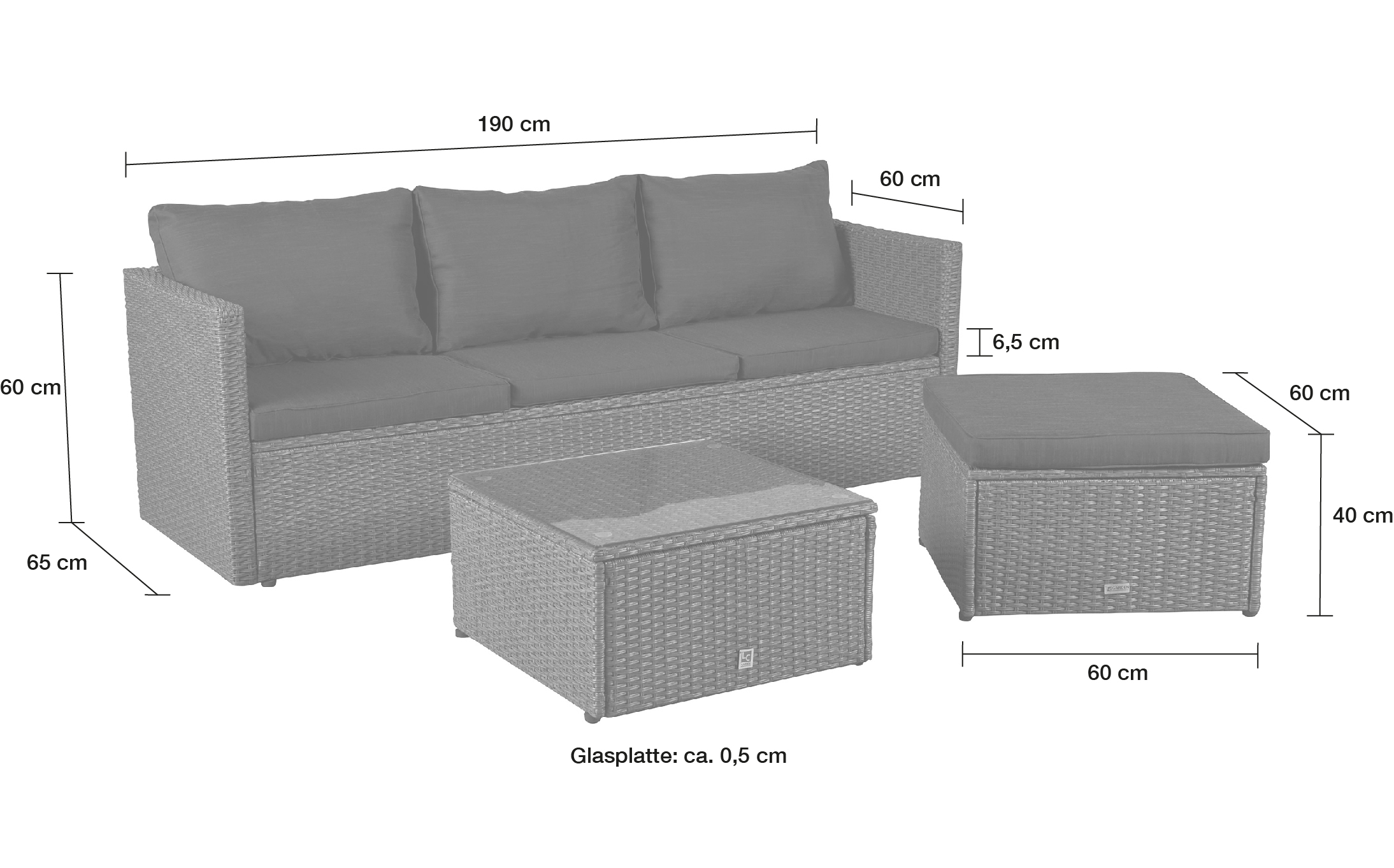Die Lounge kommt als 3er-Set mit einem 3-Sitzer Sofa, einem quadratischen Tisch inkl. Glasplatte, sowie einem Hocker in trendiger Rattan Optik. Auf dem Sofa finden Sie gemütlich Platz und genießen dank des 6,5 cm dicken Sitzpolsters einen hohen Sitzkomfort. Die Bezüge sind zu 100% aus Polyester und können bei Bedarf bei 30 Grad per Hand gewaschen werden. Der Tisch bietet mit seinen 60x60x32cm und Sicherheitsglasplatte ausreichend Platz für Snacks, Spiele und Getränke. Die Polyrattan-Gartenmöbel der Marke LC Garden sind wetterfest und leicht zu reinigen. Dank der UV-Beständigkeit sehen diese Möbel auch nach längerer Zeit immer noch aus wie neu.