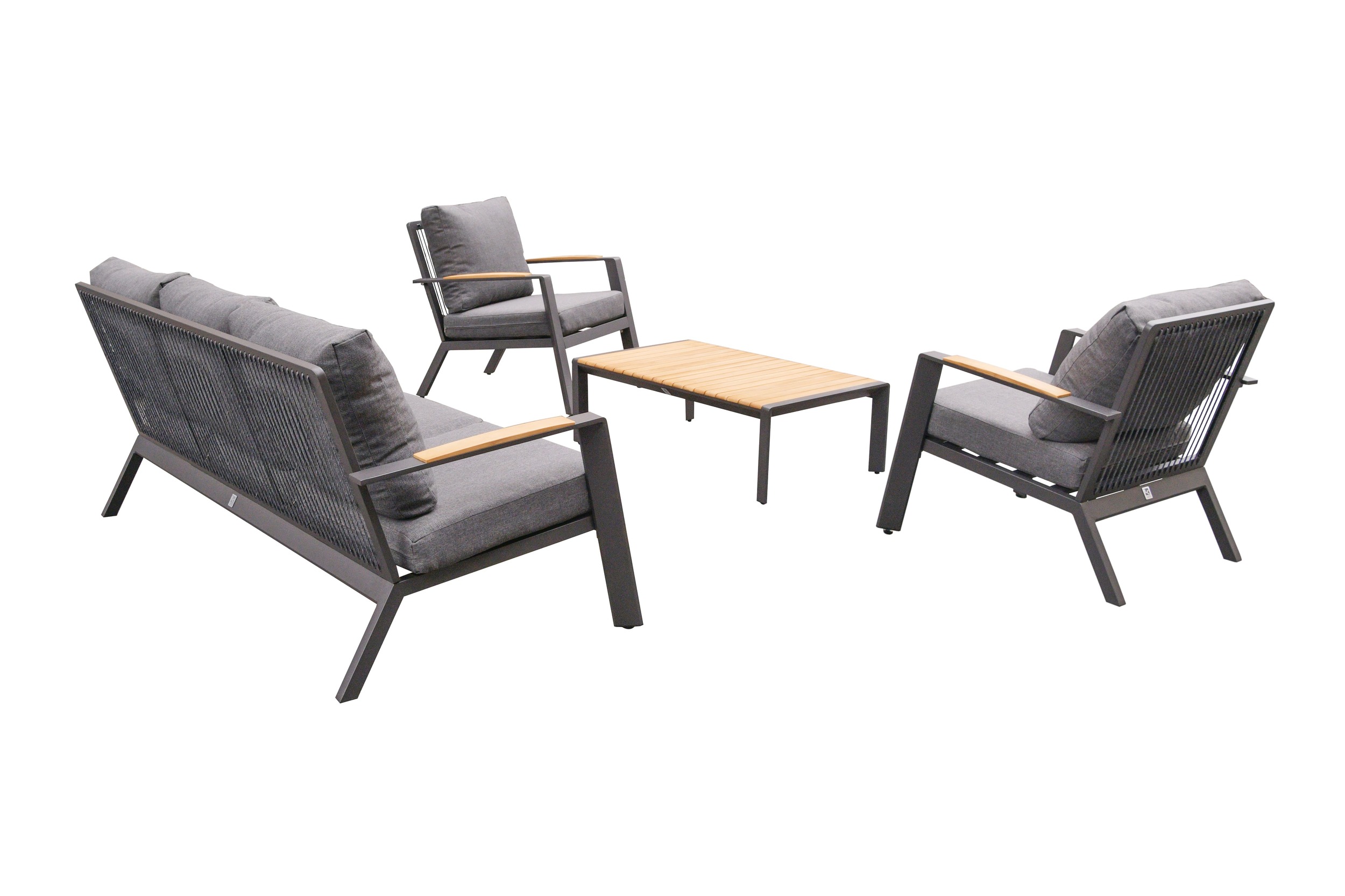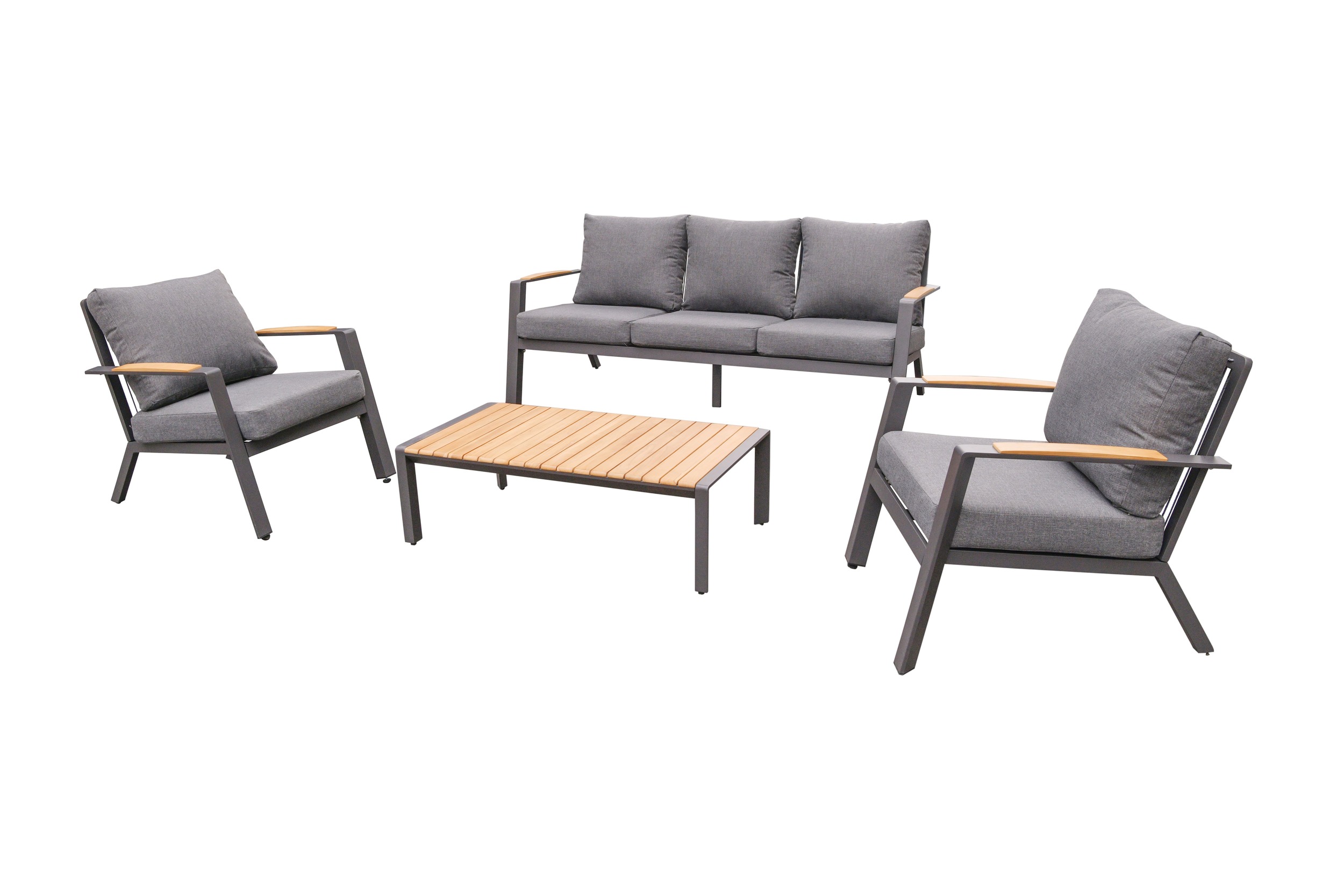 Das Lounge-Set besteht aus 2 Sesseln, einem 3-Sitzer Sofa und einem Couchtisch.