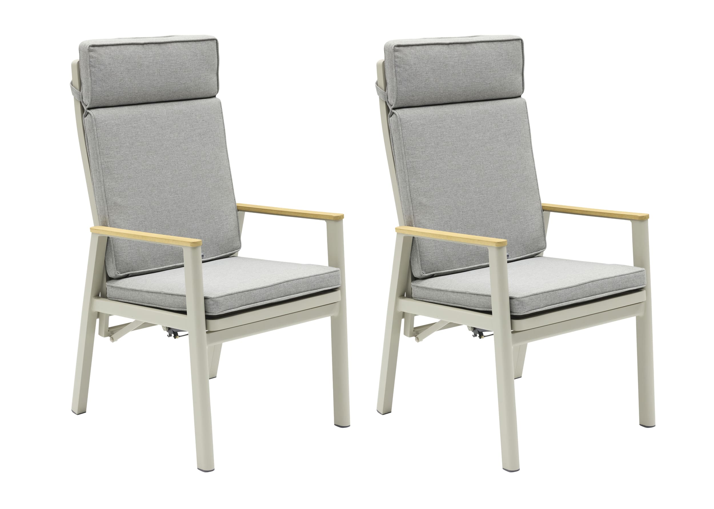 Ein echtes Plus im Alltag: Die Lehnenverstellung per Knopfdruck sitzt ergonomisch an der Innenseite der Armlehne und lässt sich ganz unkompliziert bedienen. Das pulverbeschichtete Aluminiumgestell in Taupe ist leicht, stabil und rostfrei – ideal für den dauerhaften Outdoor-Einsatz. Abgerundet wird der Look durch Armlehnen aus massivem Teakholz, die dem Stuhl eine warme, natürliche Note geben und den modernen Charakter der Serie unterstreichen.