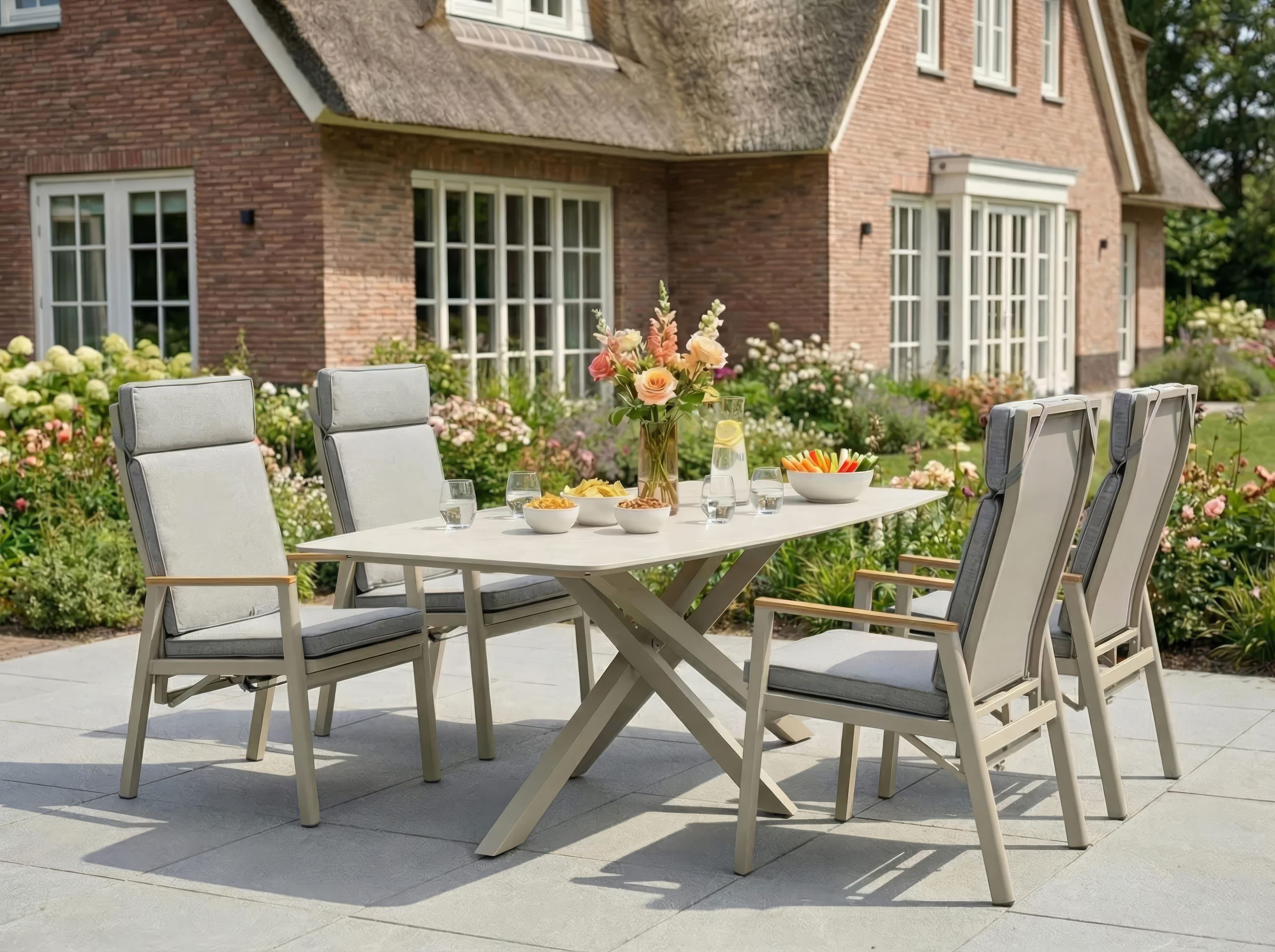 Ein echtes Plus im Alltag: Die Lehnenverstellung per Knopfdruck sitzt ergonomisch an der Innenseite der Armlehne und lässt sich ganz unkompliziert bedienen. Das pulverbeschichtete Aluminiumgestell in Taupe ist leicht, stabil und rostfrei – ideal für den dauerhaften Outdoor-Einsatz. Abgerundet wird der Look durch Armlehnen aus massivem Teakholz, die dem Stuhl eine warme, natürliche Note geben und den modernen Charakter der Serie unterstreichen.