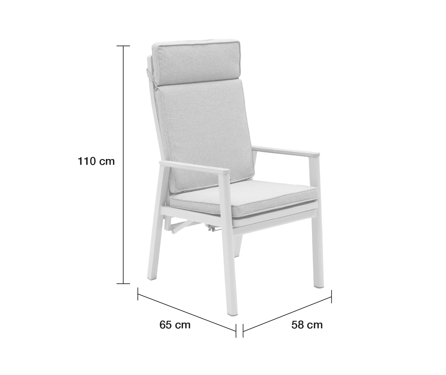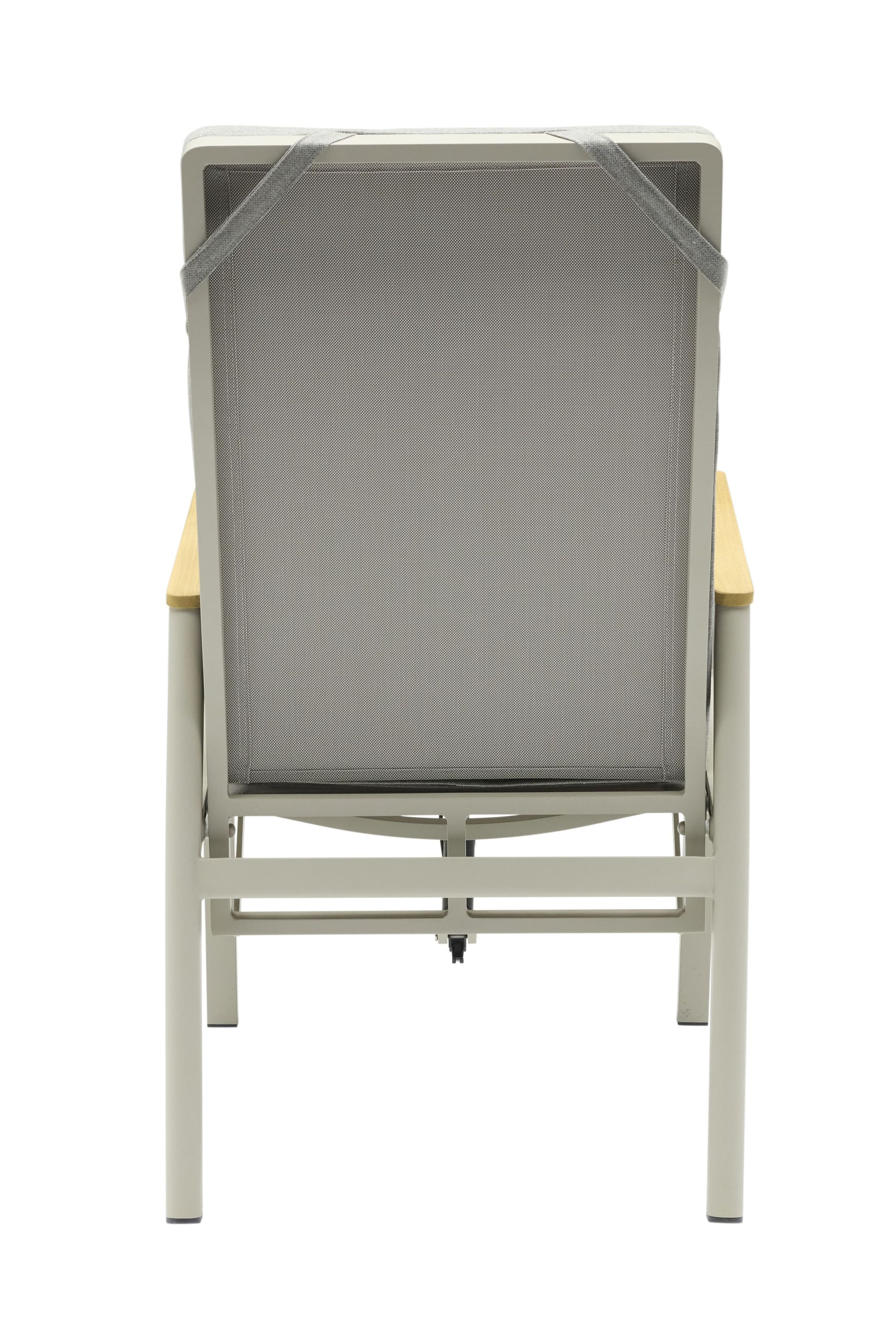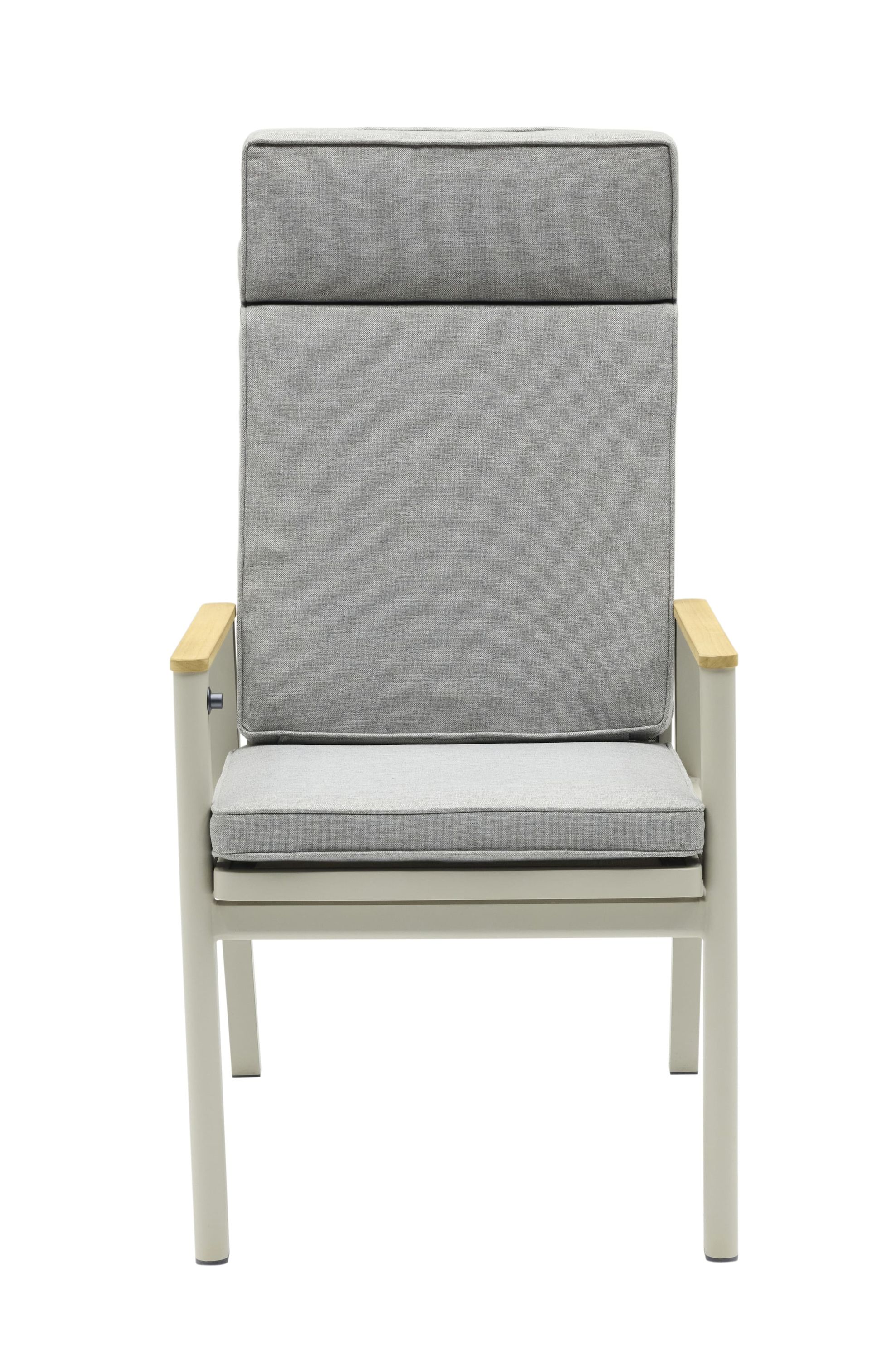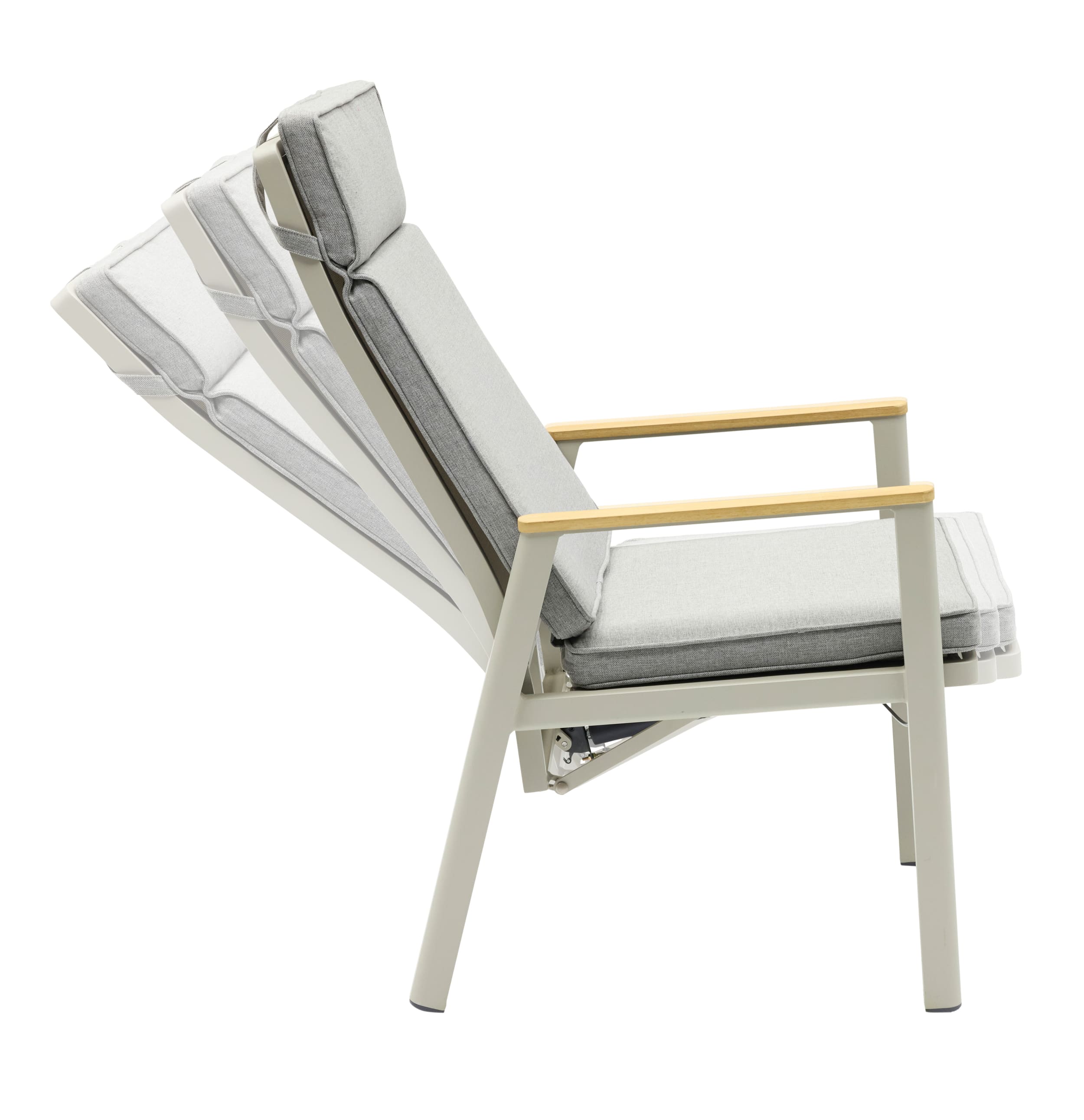 Ein echtes Plus im Alltag: Die Lehnenverstellung per Knopfdruck sitzt ergonomisch an der Innenseite der Armlehne und lässt sich ganz unkompliziert bedienen. Das pulverbeschichtete Aluminiumgestell in Taupe ist leicht, stabil und rostfrei – ideal für den dauerhaften Outdoor-Einsatz. Abgerundet wird der Look durch Armlehnen aus massivem Teakholz, die dem Stuhl eine warme, natürliche Note geben und den modernen Charakter der Serie unterstreichen.