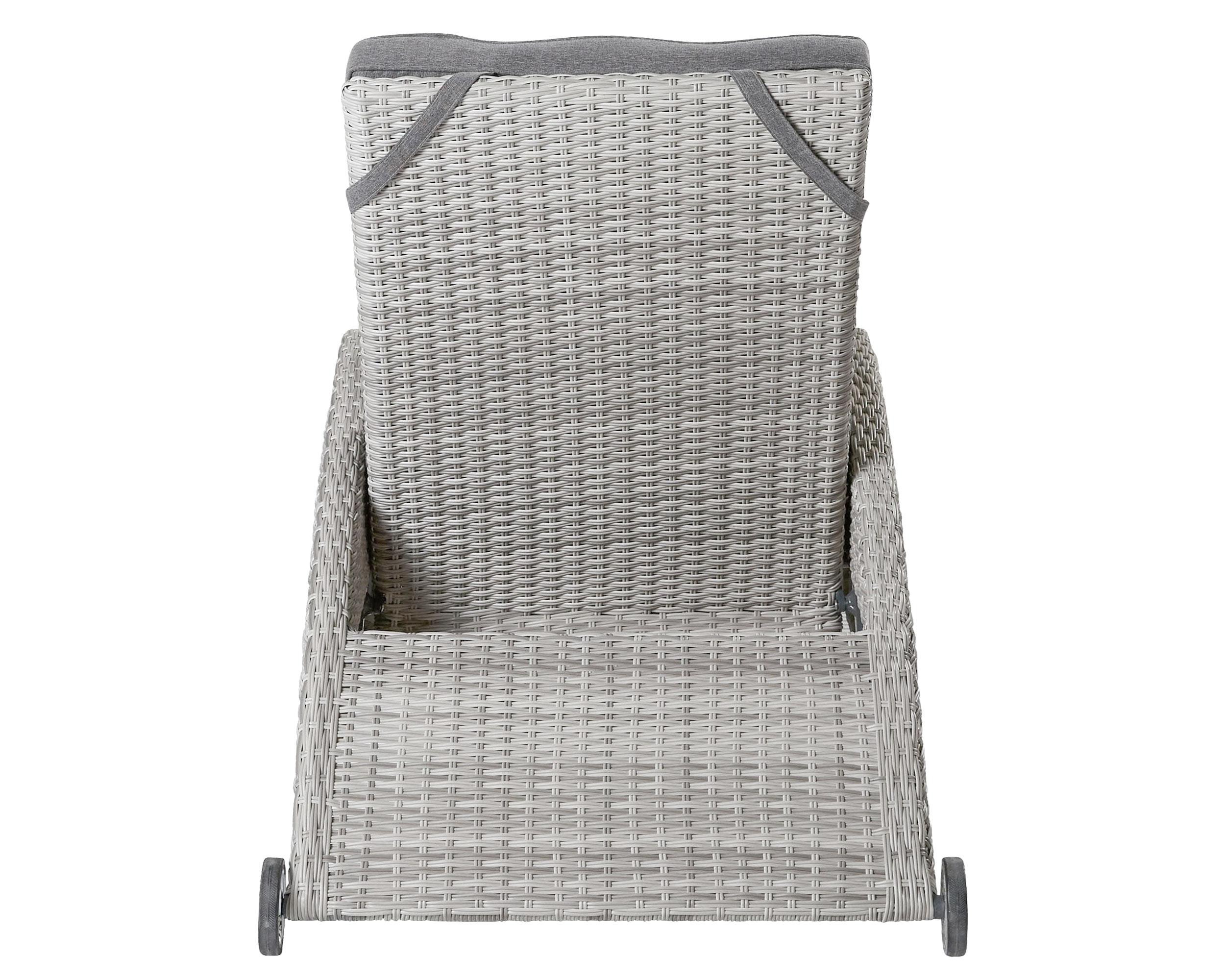 - Handgeflochtene Relaxliege aus strapazierfähigen weiß-grau-mix Kunststofffasern in Rattanoptik.