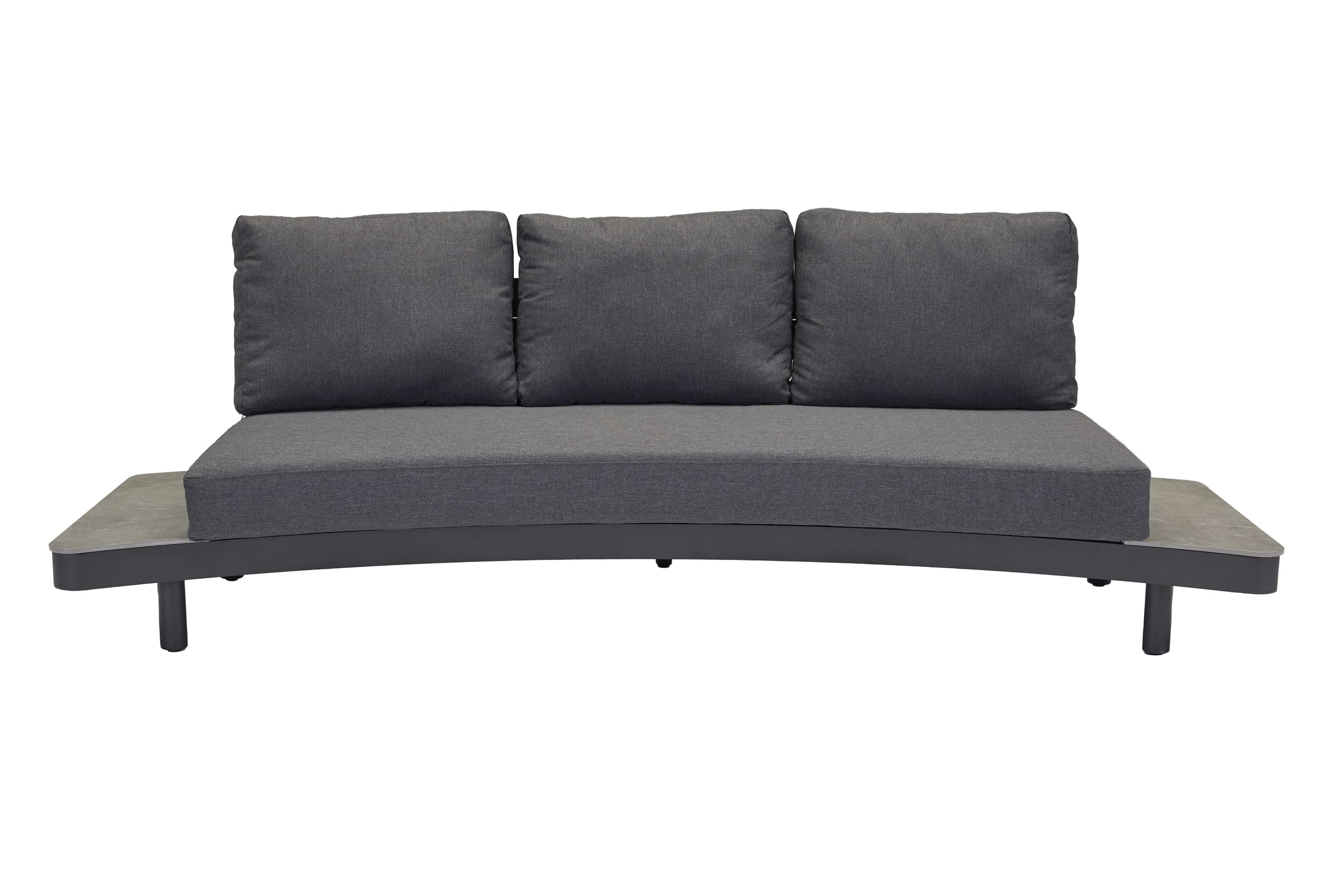 Das Aluminiumgestell bildet eine stabile Basis und passt optisch perfekt zum cleanen Look des Sofas. Besonders clever sind die seitlichen Ablageflächen: Sie bieten Platz für Gläser, Snacks, Sonnenbrille oder Smartphone und ersetzen damit ganz bequem einen zusätzlichen Beistelltisch. Für sofortigen Komfort ist die passende Auflage aus Olefin bereits inklusive – angenehm gepolstert und in Dunkelgrau gehalten, sodass das Sofa zeitlos und hochwertig wirkt.