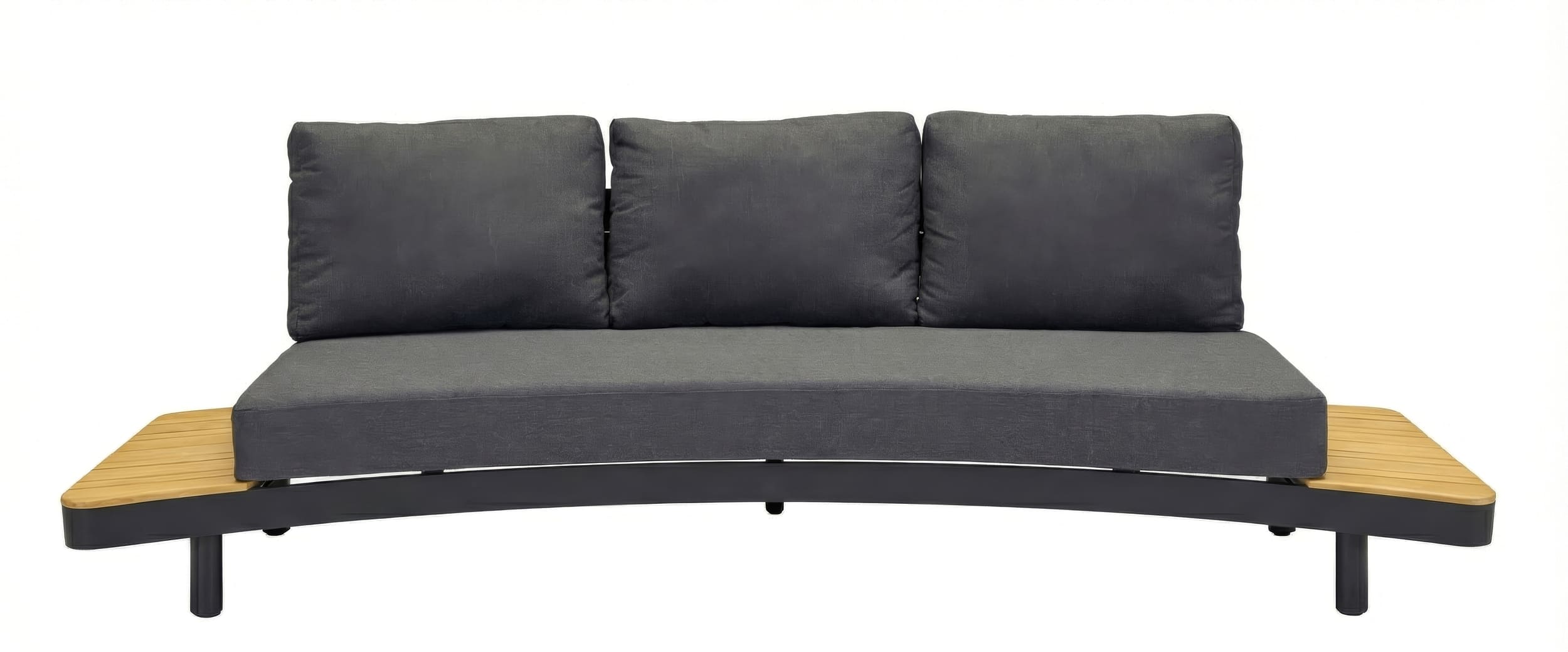 Das Aluminiumgestell bildet eine stabile Basis und passt optisch perfekt zum cleanen Look des Sofas. Besonders clever sind die seitlichen Ablageflächen: Sie bieten Platz für Gläser, Snacks, Sonnenbrille oder Smartphone und ersetzen damit ganz bequem einen zusätzlichen Beistelltisch. Für sofortigen Komfort ist die passende Auflage aus Olefin bereits inklusive – angenehm gepolstert und in Dunkelgrau gehalten, sodass das Sofa zeitlos und hochwertig wirkt.