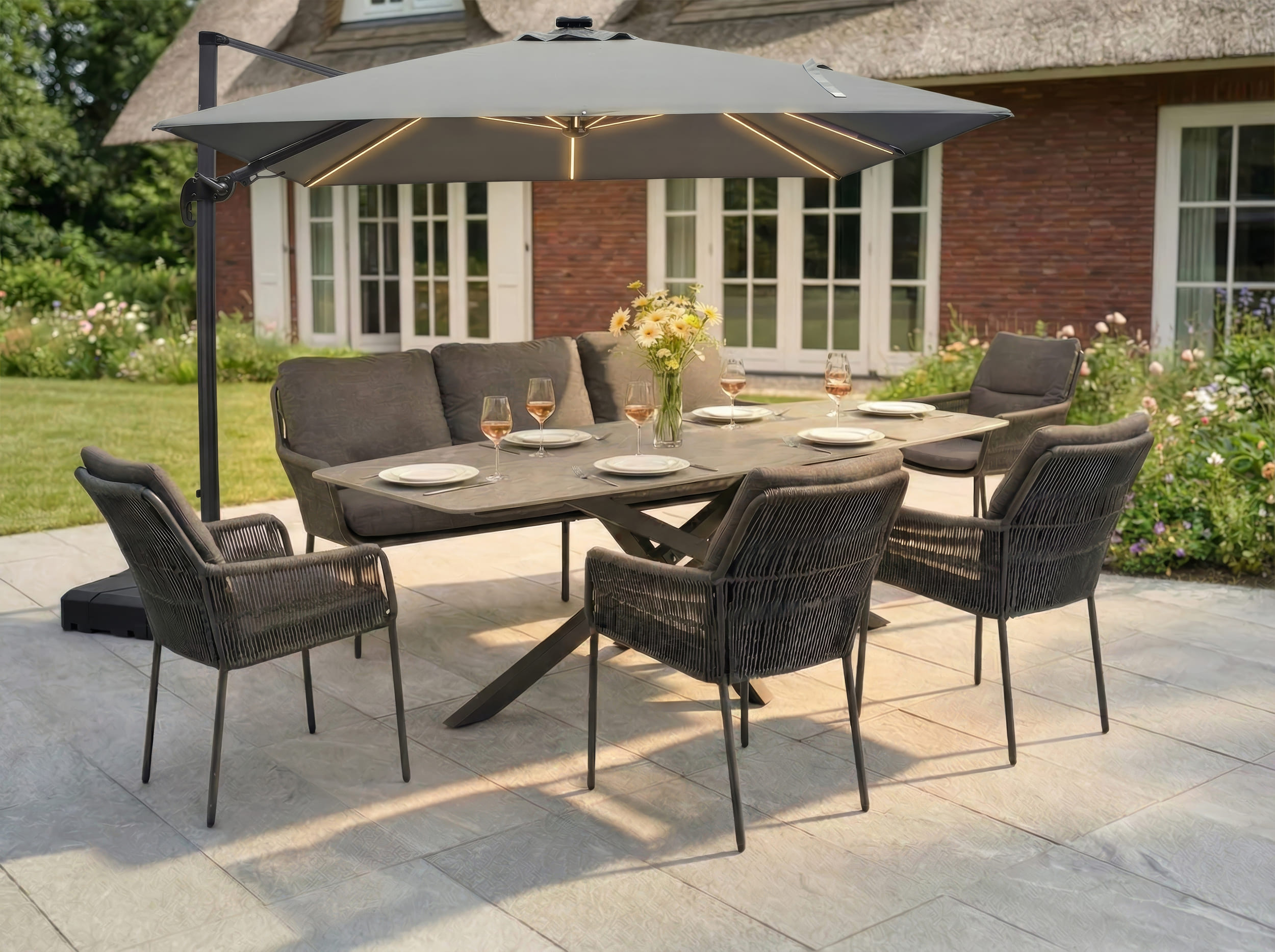 Kombinieren Sie den Sonnenschirm mit allen handelsüblichen Gartenmöbeln. Als Fachhändler beraten wir Sie gerne bei Fragen zur Zusammenstellung und erstellen Ihnen ein kosten- und bedarfsorientiertes Angebot.