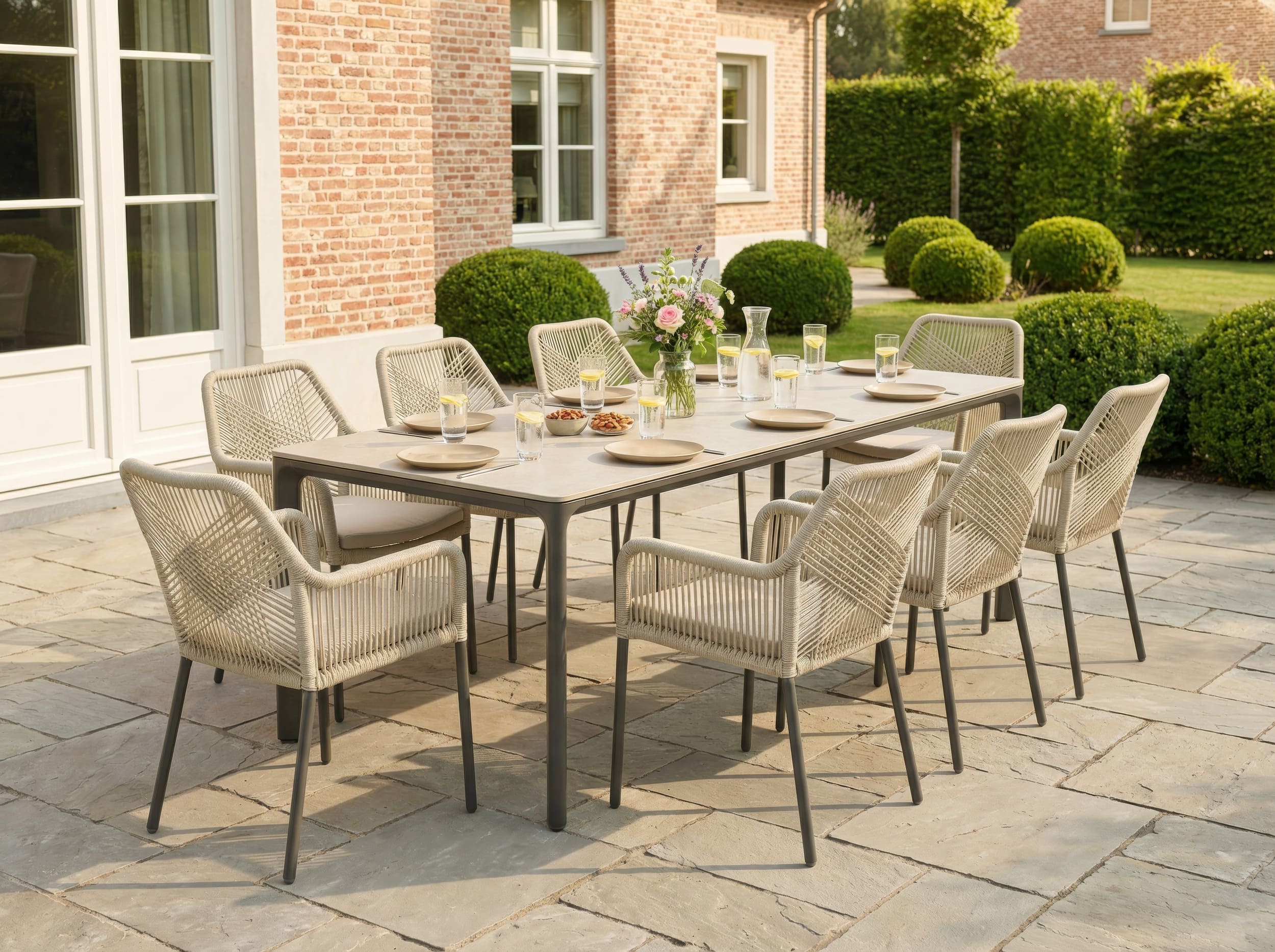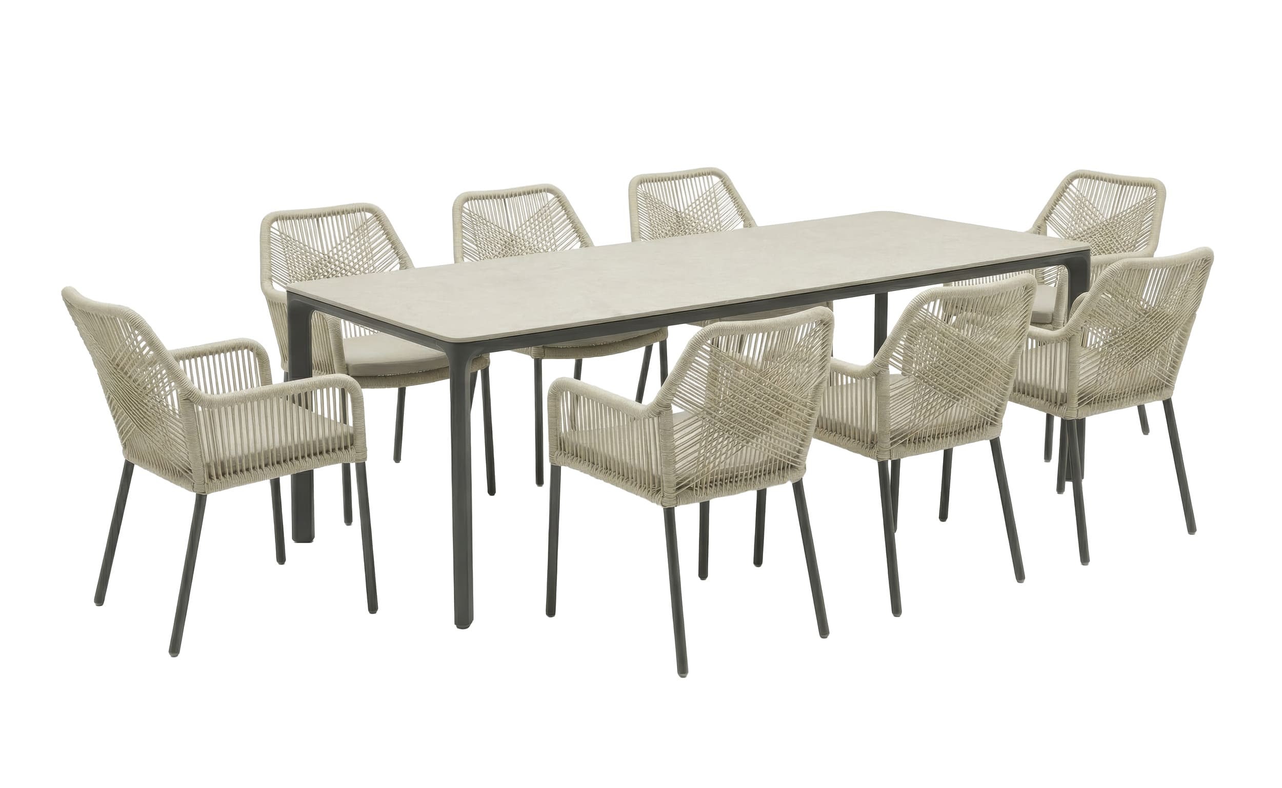 LC Garden »Stilo« Gartenset Gartentisch 200cm Sintered Stone + 8 Gartenstühle Rope Taupe