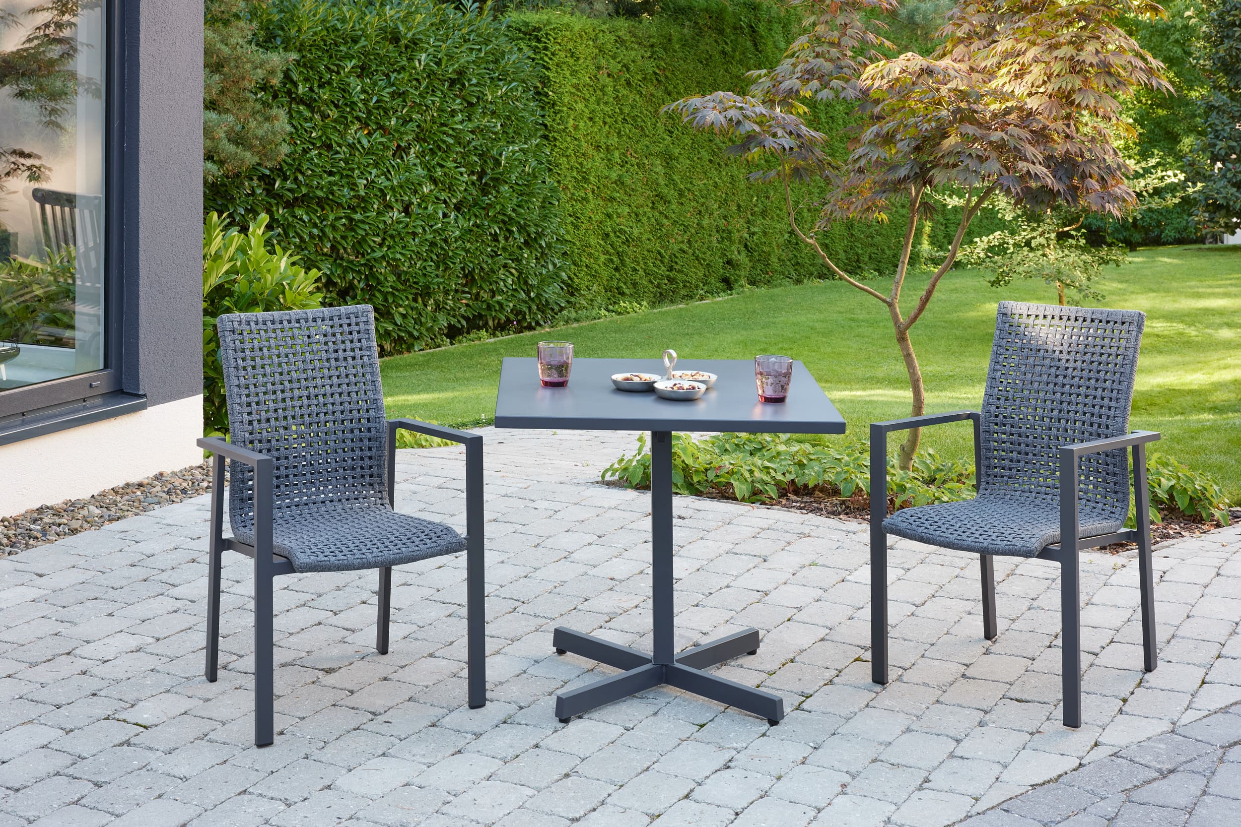 Dieses praktische Balkonset, bestehend aus einem Balkontisch und passenden Stapelstühlen, wird Sie begeistern! Es überzeugt durch ansprechendes Design und Funktionalität. Mit einer 80 cm großen Tischplatte bietet Ihnen der klappbare Gartentisch aus Stahl ausreichend Platz für vier Personen. Durch das robuste pulverbeschichtete Stahlgestell und der anthrazitfarbenen Stahl-Tischplatte ist der Tisch langlebig, regenbeständig sowie UV-resistent. Ein optisches Highlight ist der anthrazitfarbene Kreuz-Fuß aus Stahl. Durch die praktische Klappfunktion der Tischplatte ist dieser Balkontisch platzsparend zu verstauen und für jeden Balkon und Terrasse geeignet. Die dazu passenden Stapelstühle überzeugen mit hochwertigen Materialien und erstklassiger Verarbeitung. Durch die Sitz- und Rückenfläche aus graufarbener Rope-Bespannung ist der Stapelstuhl ein echtes Highlight in jedem Garten. Rope ist ein modernes Geflecht in Kordeloptik, welches besonders pflegeleicht und strapazierfähig ist. Die glatte Oberfläche der 15 mm breiten Rope Bandes in anthrazit trägt zur Langlebigkeit Ihrer Gartenmöbel bei. Staub und Schmutz lassen sich mit klarem Wasser problemlos entfernen. Aufgrund der robusten Materialien kann der Gartenstuhl das ganze Jahr problemlos im Freien stehen.