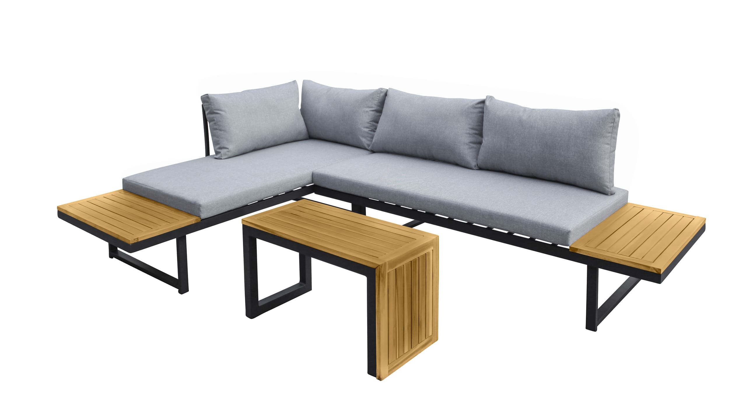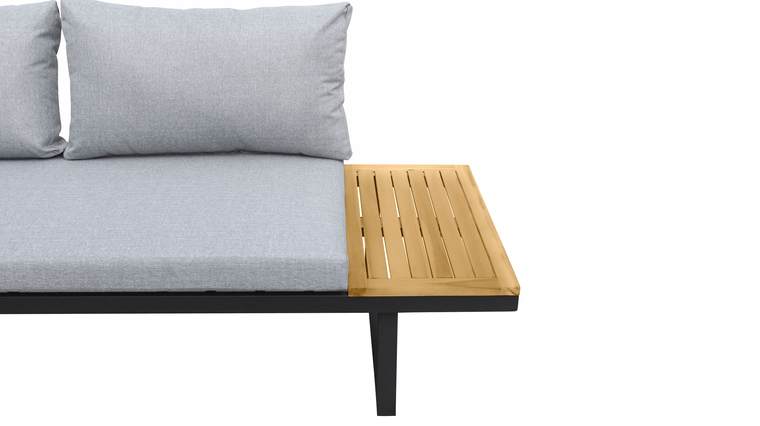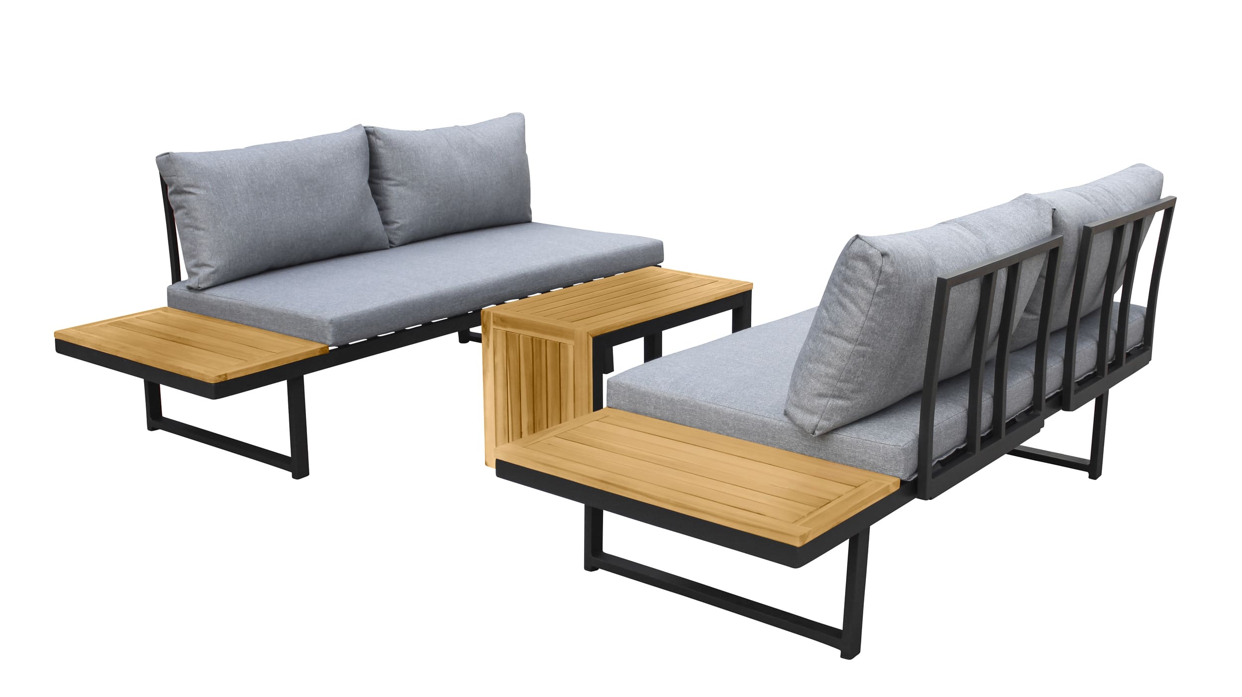 - Anthrazit farbiges Aluminiumgestell mit Ablageflächen aus massiver Akazie