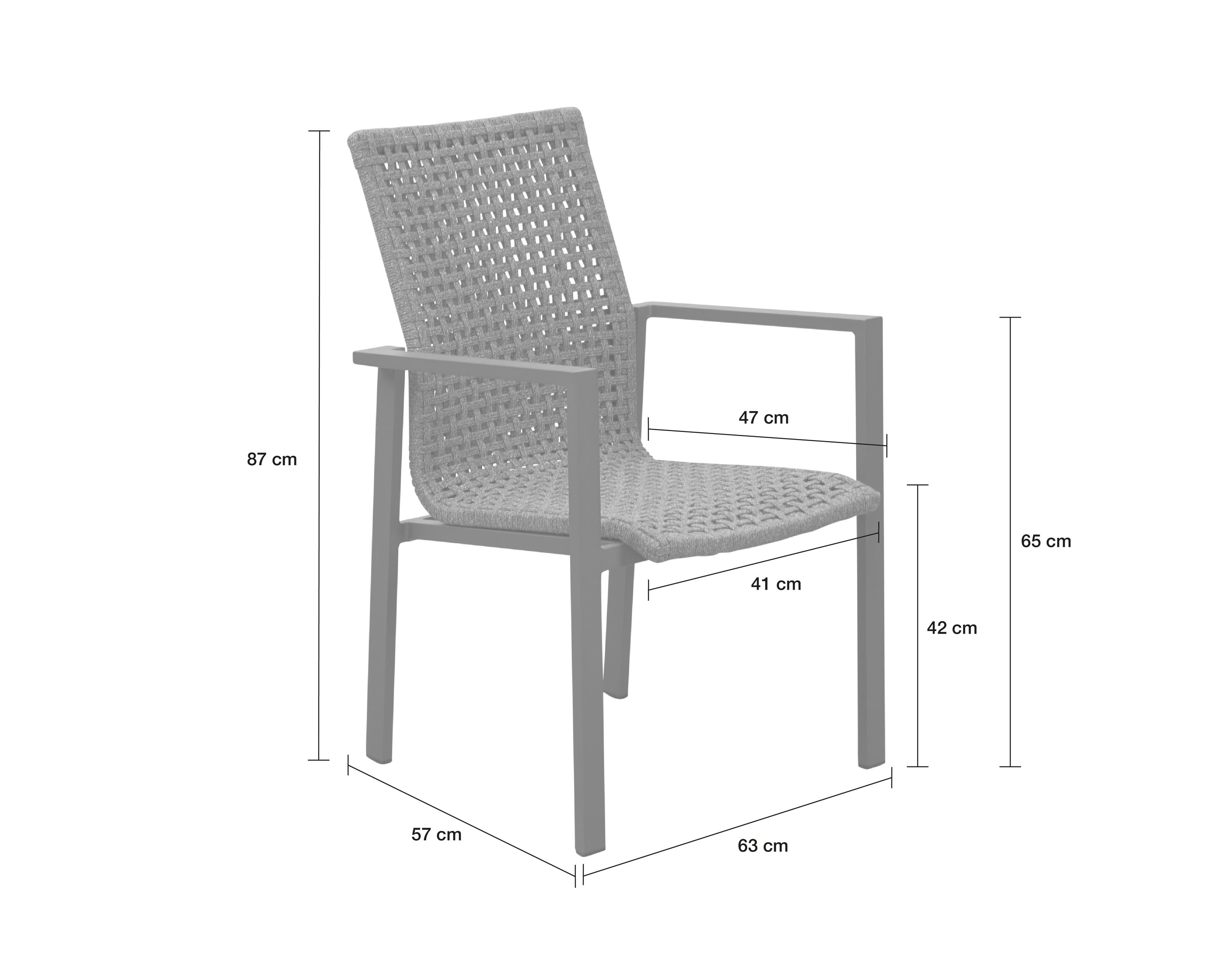 Begeistern Sie sich und Ihre Gäste mit dem Stapelstuhl Sunrope von LC Garden. Der neu entwickelte Gartenstuhl aus anthrazitfarbenem Aluminium überzeugt durch eine gute Verarbeitung und hohe Langlebigkeit. Durch die Sitz- und Rückenfläche aus graufarbener Rope-Bespannung ist der Stapelstuhl ein echtes Highlight in jedem Garten. Rope ist ein modernes Geflecht in Kordeloptik, welches besonders pflegeleicht und strapazierfähig ist. Die glatte Oberfläche der 15 mm breiten Rope Bandes in anthrazit trägt zur Langlebigkeit Ihrer Gartenmöbel bei. Staub und Schmutz lassen sich mit klarem Wasser problemlos entfernen. Aufgrund der robusten Materialien kann der Gartenstuhl das ganze Jahr problemlos im Freien stehen.