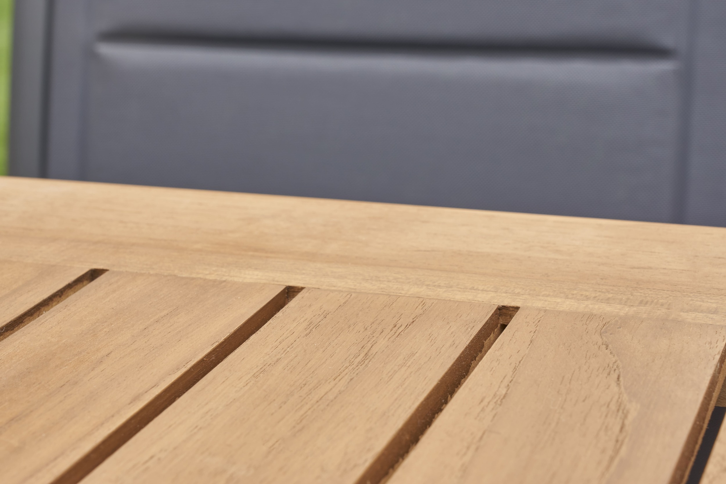 An dem 200x100cm großen Tisch, können 6 bis 8 Personen bequem Platz nehmen. Der Gartentisch mit seiner Tischplatte aus Teakholz ist nicht nur praktisch, sondern gleichzeitig ein echter Hingucker auf Ihrer Terrasse. Das robuste und langlebige Teakholz in Kombination mit dem anthrazitfarbenen Gestell aus leichtem Aluminium strahlt eine hohe Wertigkeit und Modernität aus, die Ihre Gäste zu schätzen wissen. Die pflegeleichte Tischplatte entspricht damit einer natürlichen Allwetterplatte, die auch gegen Schnee und Frost resistent ist, sofern sie naturbelassen bleibt. Zu dem modernen Design der Teakholztischplatte fügt sich das anthrazitfarbene, vierfüßige Untergestell des Tisches sehr gut ein. Das Untergestell aus Aluminium ist wie die Tischplatte pflegeleicht und langlebig. Es ist unempfindlich gegen Rost, so dass der Tisch problemlos auf Ihrer Terrasse überwintern kann.