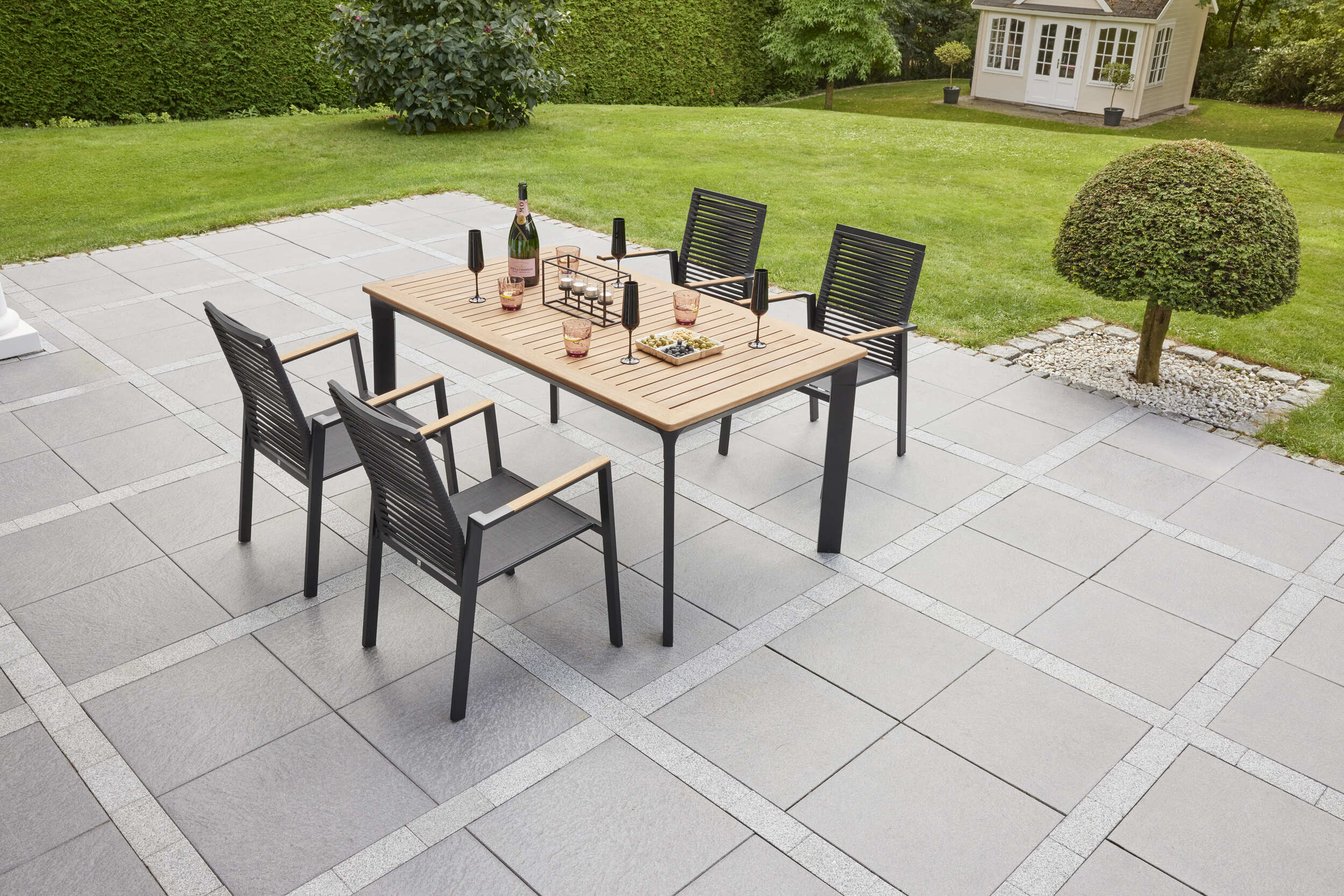 Zu dem modernen Design der Teakholztischplatte fügt sich das matt schwarze, vierfüßige Untergestell des Tisches sehr gut ein. Das Untergestell aus Aluminium ist wie die Tischplatte pflegeleicht und langlebig. Es ist unempfindlich gegen Rost, so dass der Tisch problemlos auf Ihrer Terrasse überwintern kann.