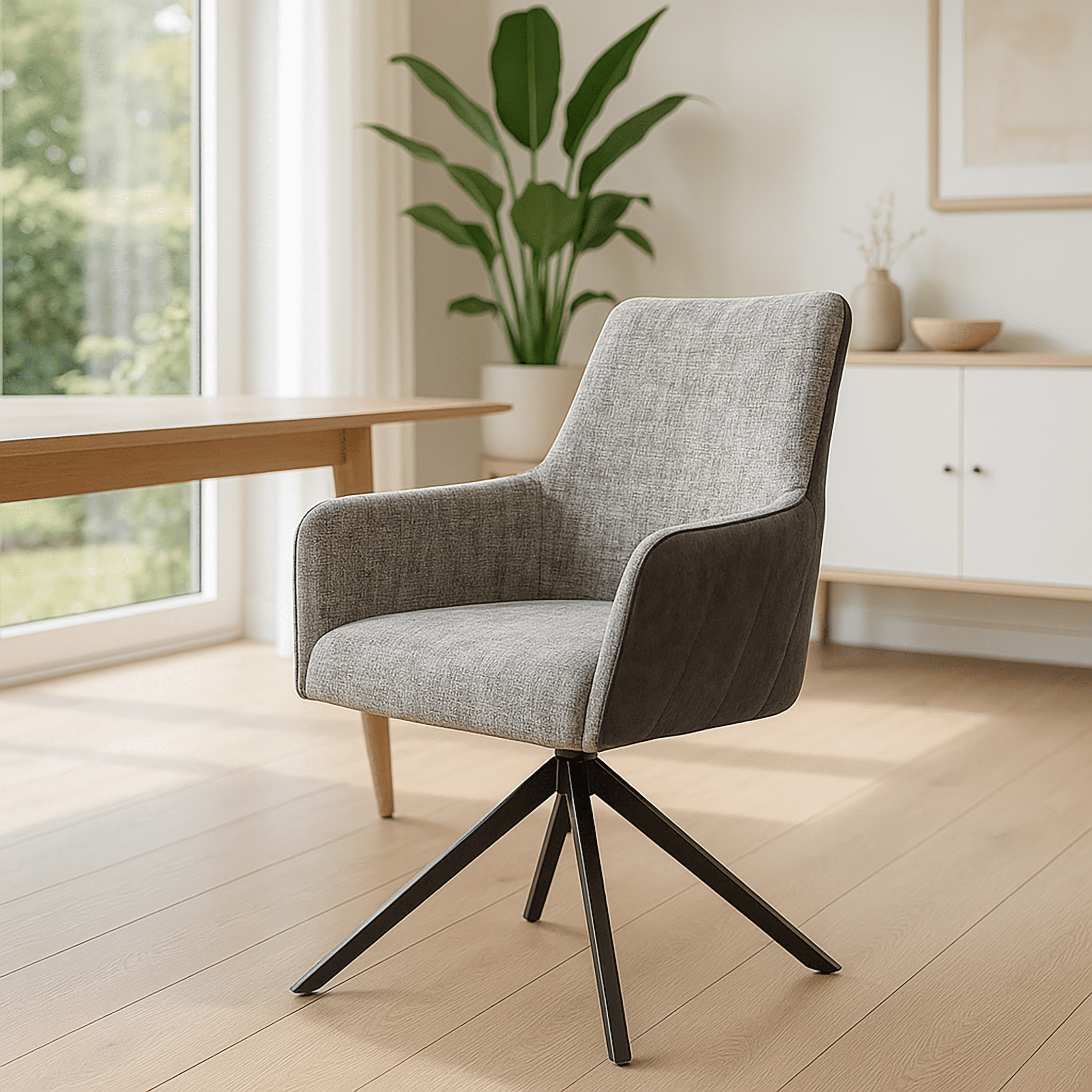 Tauchen Sie ein in zeitlose Eleganz und modernen Komfort mit dem LC Home Esszimmerstuhl Chicago. Dieser stilvolle Stuhl vereint hochwertige Materialien mit einem ansprechenden Design, um Ihrem Essbereich eine gehobene Note zu verleihen. Der samtig anthrazitfarbene Microfaserstoff und der strapazierfähige Webstoff auf der Sitzfläche verleihem dem Drehstuhl ein elegantes und warmes Design, welcher in verschiedene Einrichtungsstile passt. Die Drehfunktion des Stuhls, ermöglicht Ihnen, sich bequem in alle Richtungen zu bewegen, ohne den Stuhl verschieben zu müssen. Zudem sorgt die mittelhohe Rückenlehne für eine sehr entspannte und aufrechte Sitzposition.
