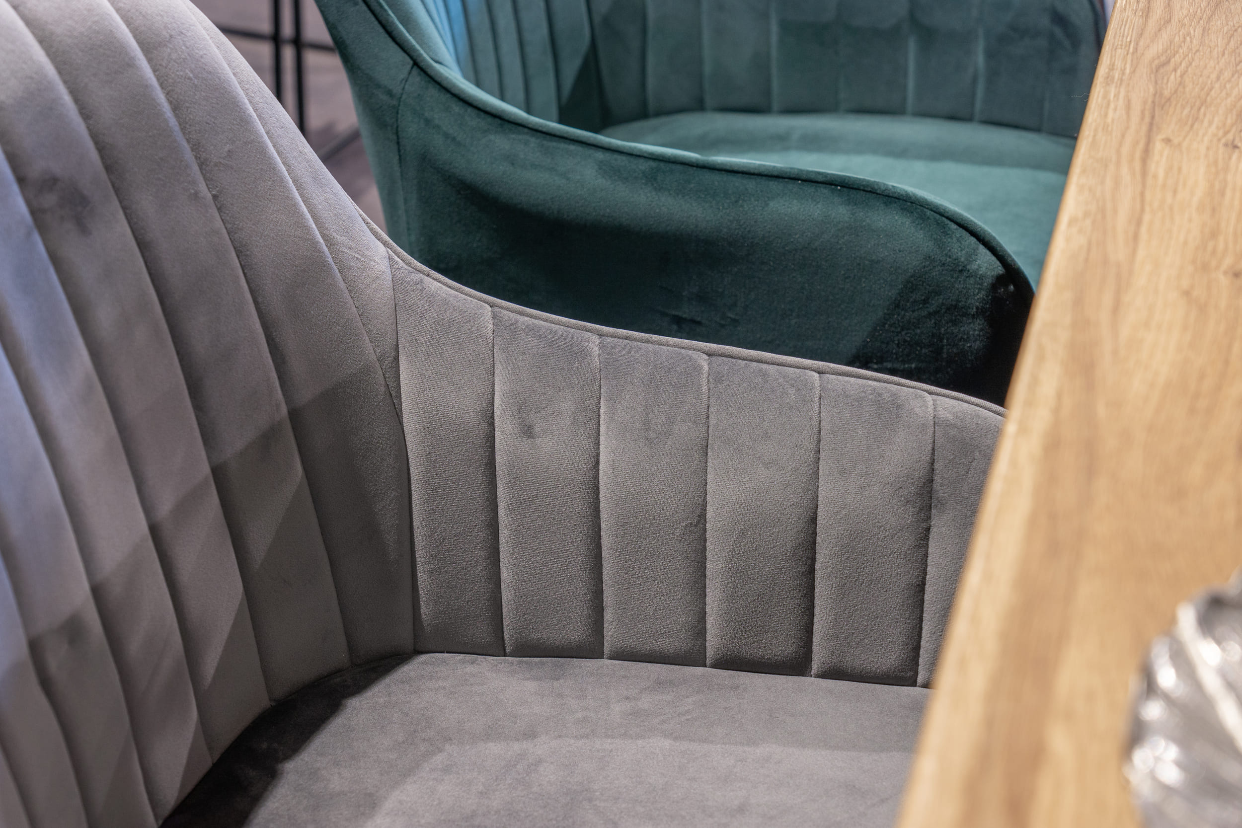 - Rückenlehne und Sitzfläche mit Samtbezug mit modernen Ziernähten