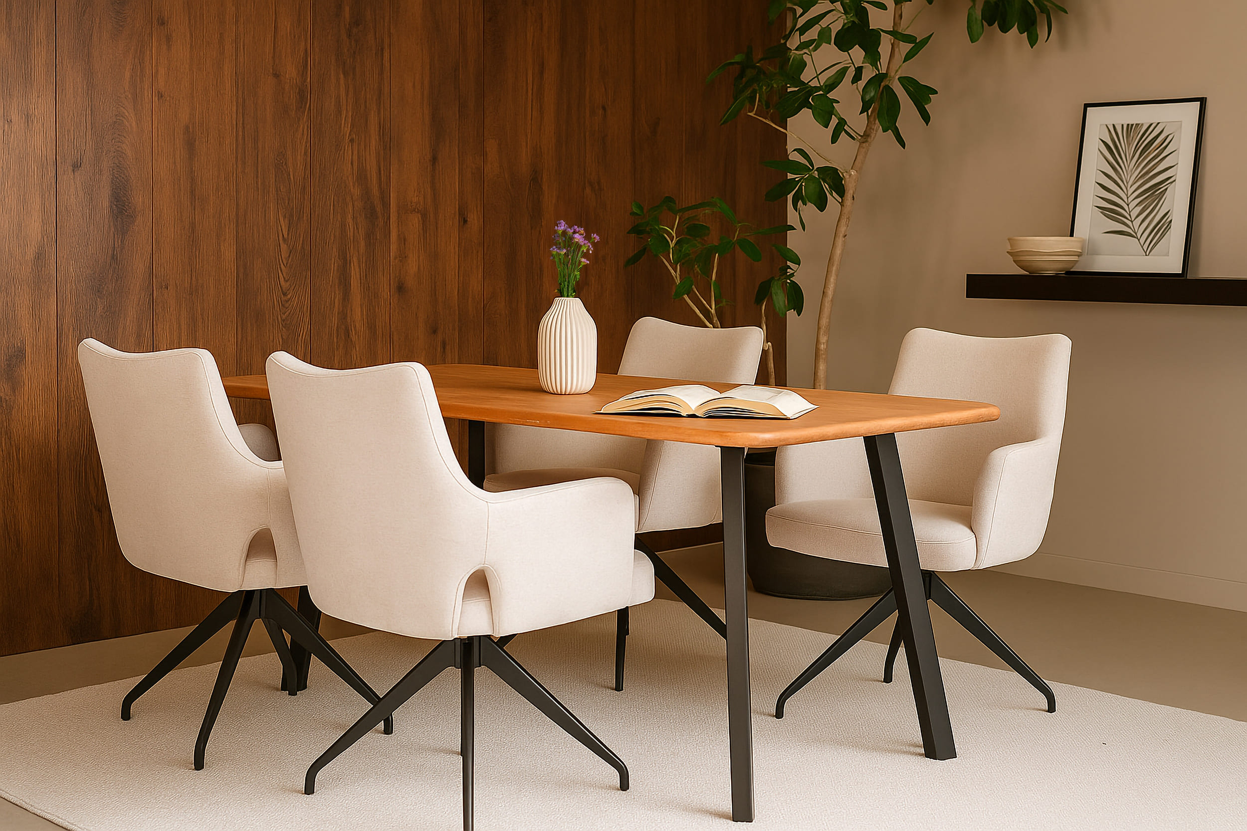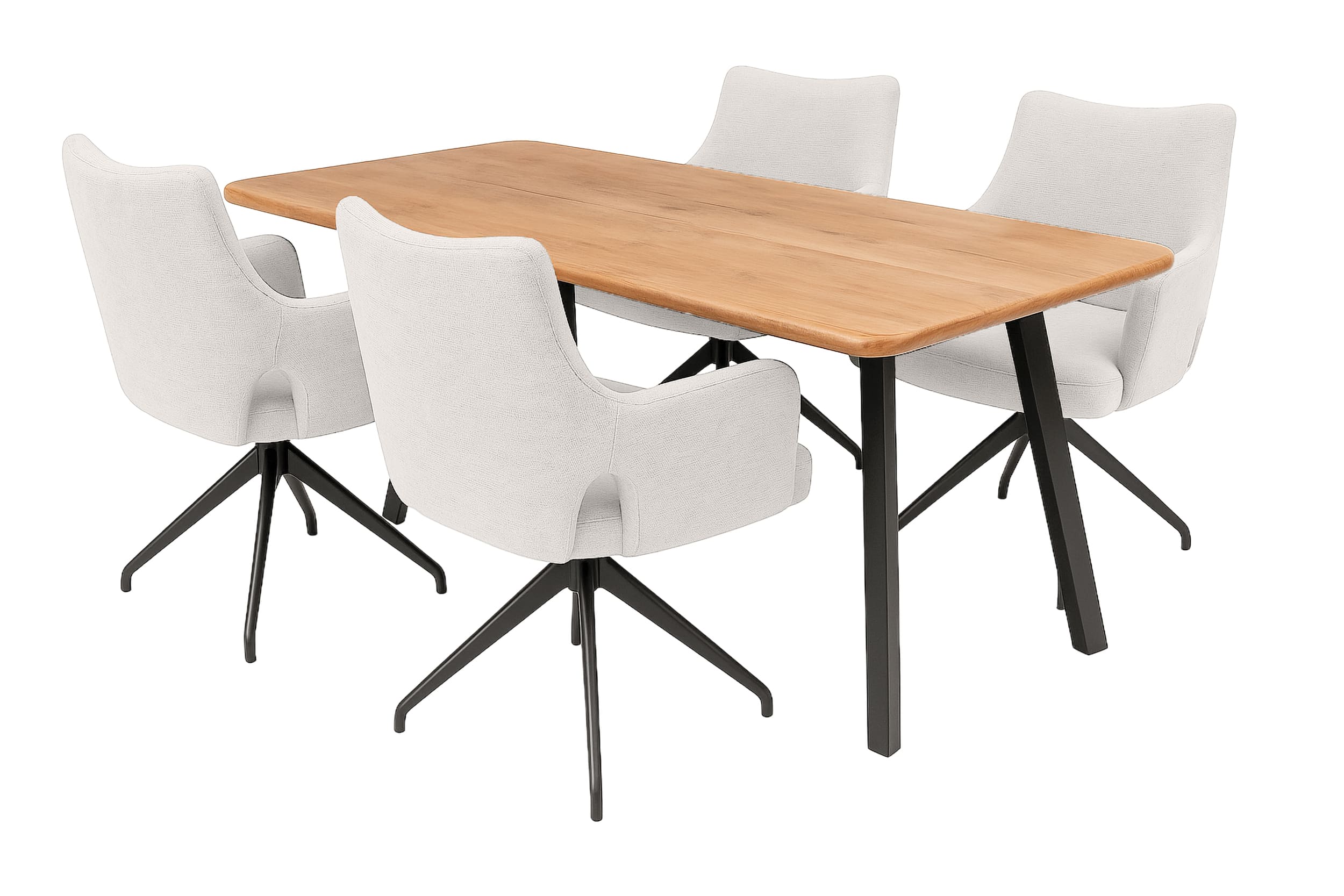 Natürliches Akazienholz mit Baumkante und ein schwarz pulverbeschichtetes Metallgestell prägen den modernen Auftritt dieser Essgruppe. Die vier Livrono-Stühle runden das Ensemble mit modernen Rundungen, pflegeleichtem Bezug und standfestem Metall-Vierfuß ab – stilvoll, robust und alltagstauglich.